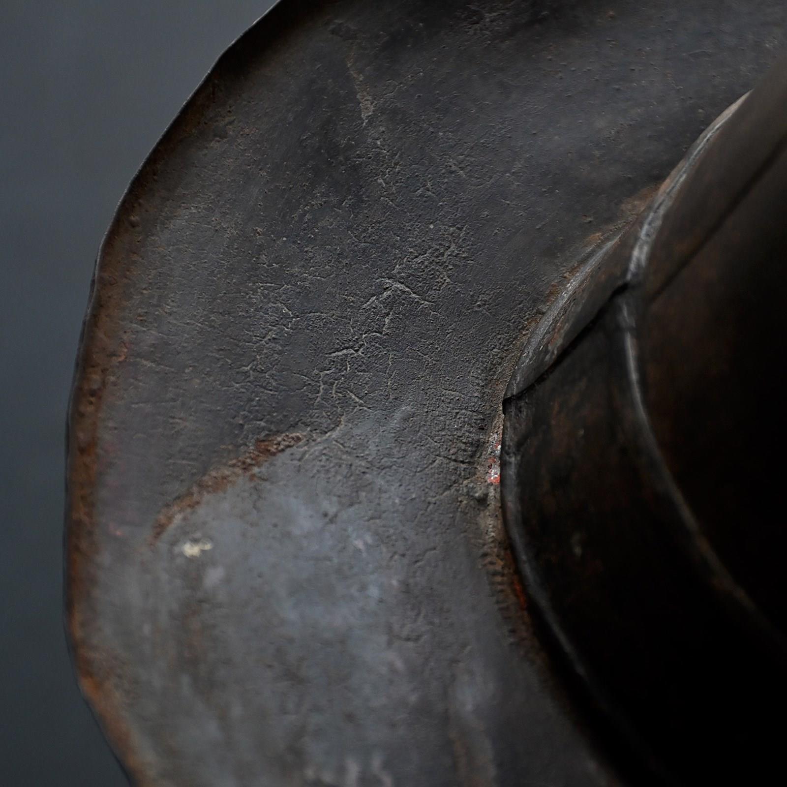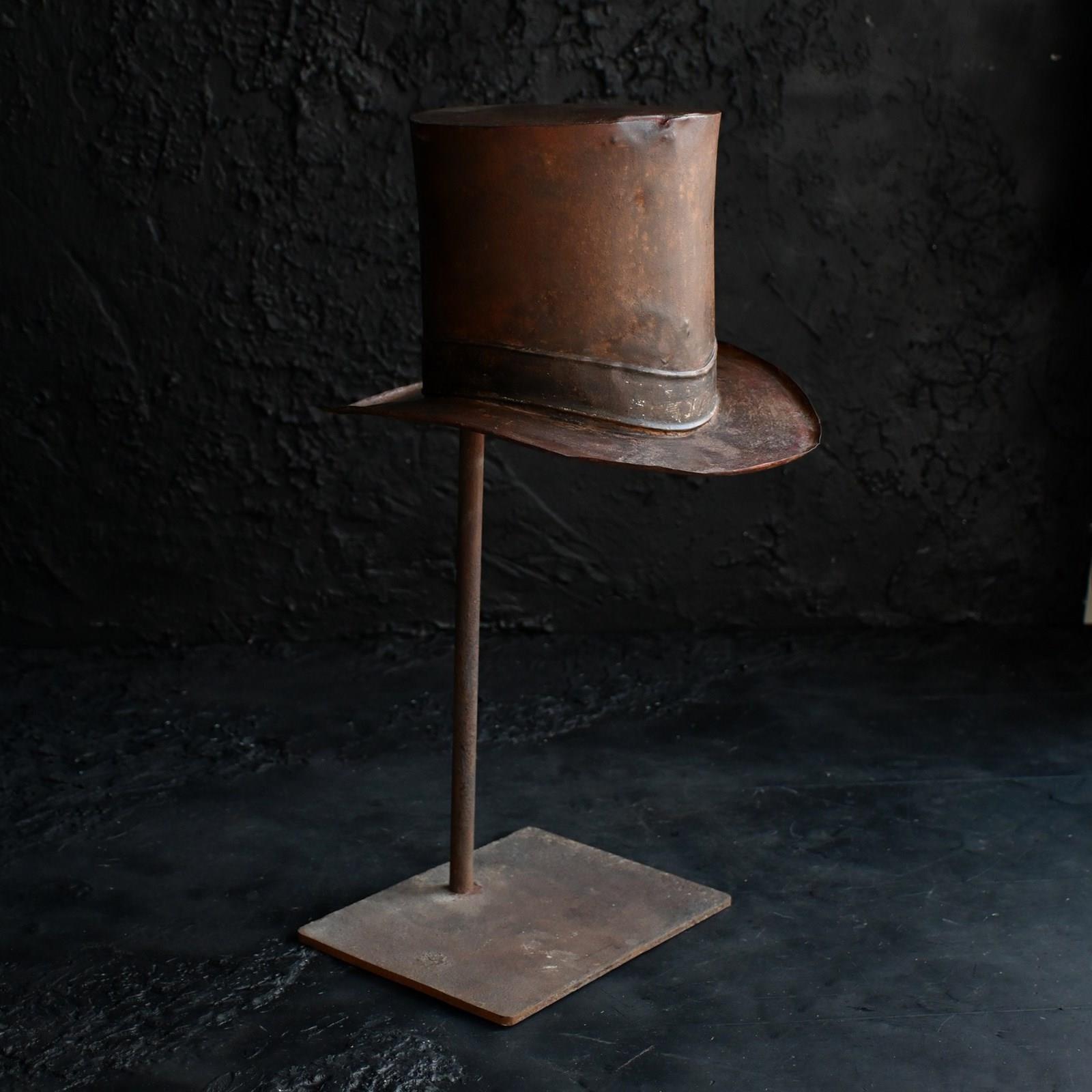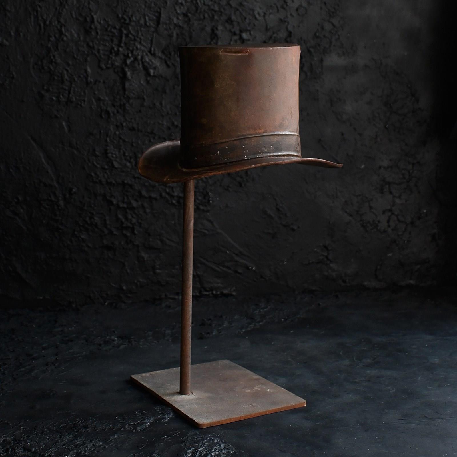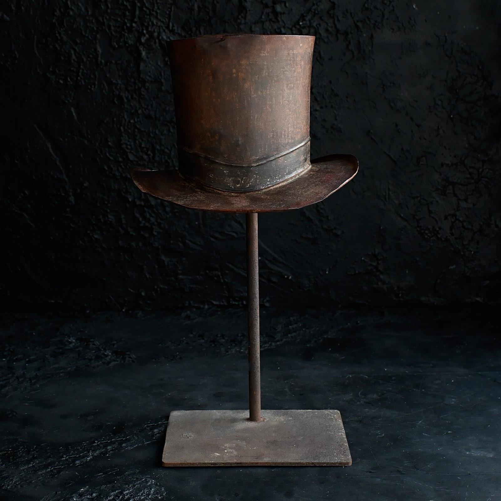 Mounted onto a bespoke cast iron display stand this highly decorative and rare example of a hat makers trade sign shows bags of character and age. The bracket fits perfectly into the bespoke stand as shown. Once this item would have hung outside a hat makers shop of sorts. Originally this sign would have been painted red as there is some remnants of this across the surface.