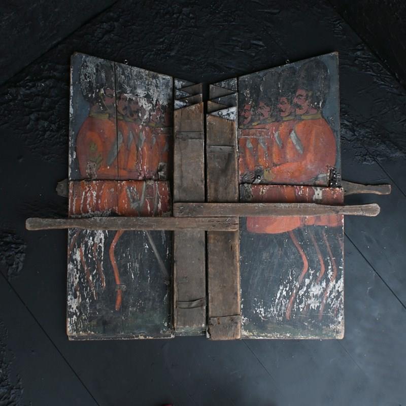 The very rare pair of metamorphic trick scenery boards each hinged and hand-painted to wood and canvas, comprising of two rows of the Queen’s guard appearing from their guard houses, sign written with the numbers B42 and A41, the soldiers appearing to emerge by un-folding into a two rows of twenty five soldiers each, in their distinctive red tunics, on the march, surviving from the latter part of the nineteenth century and from the renowned collection of John Michael Blundall (1937-2014).