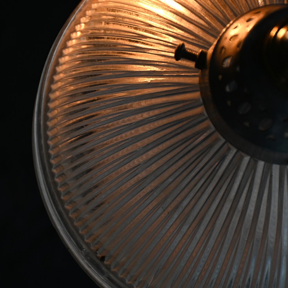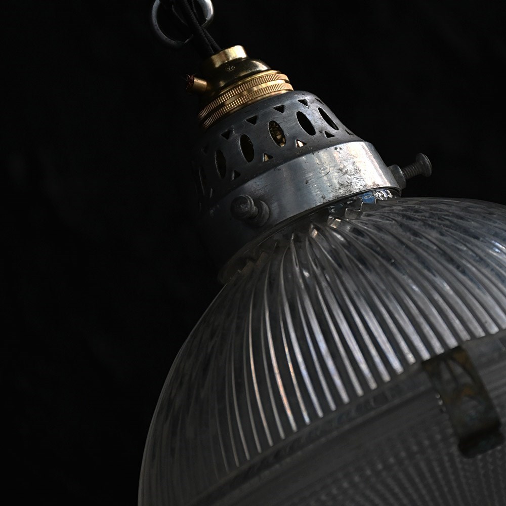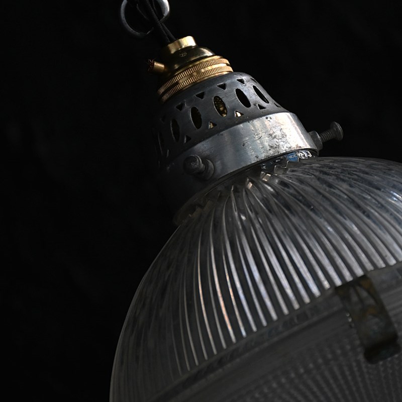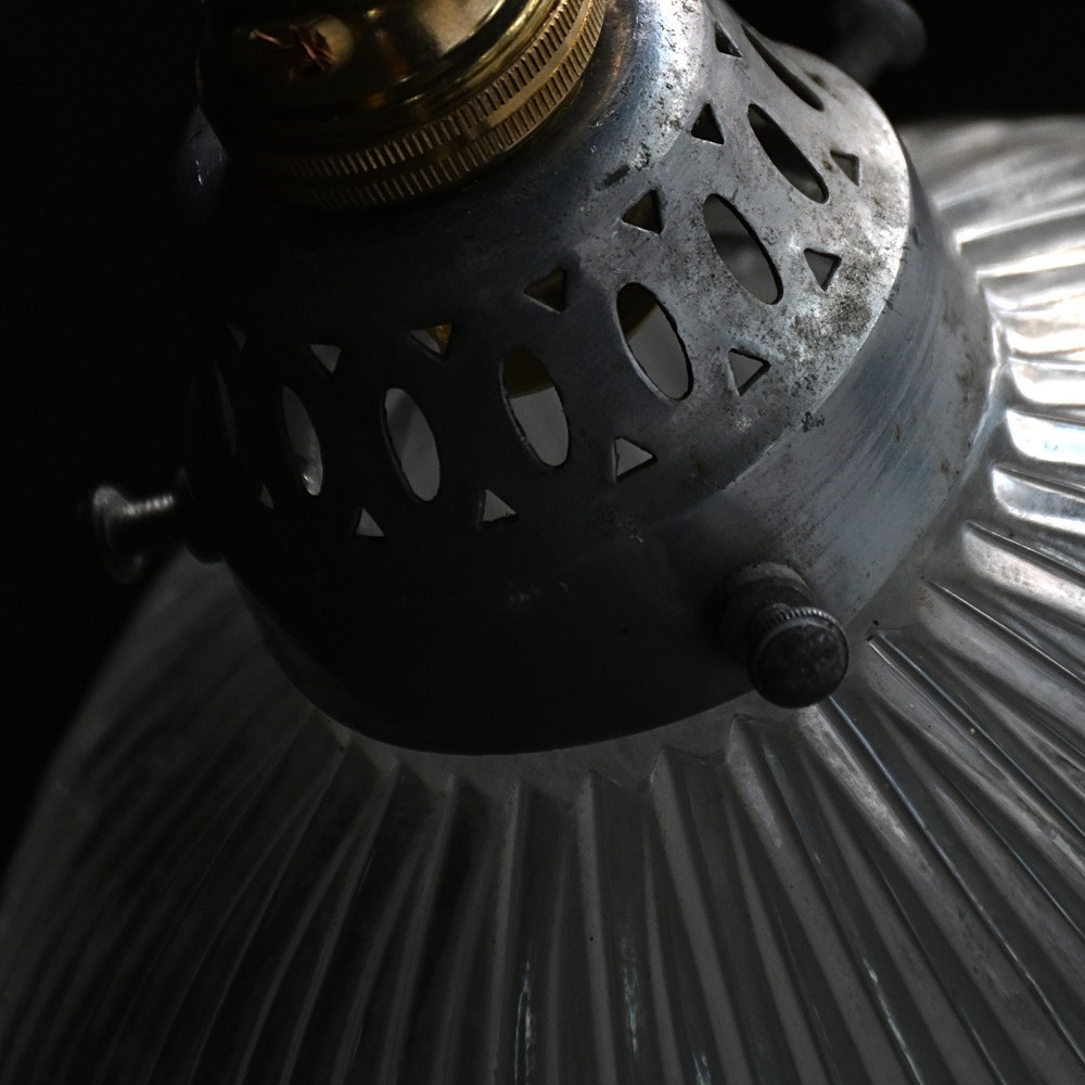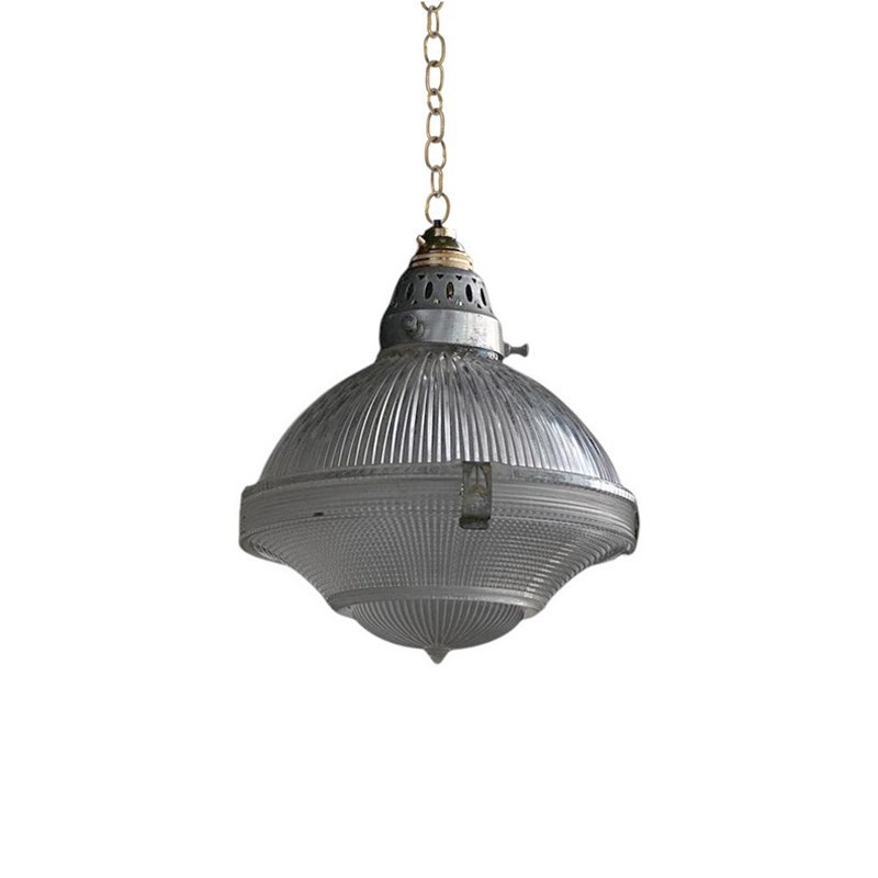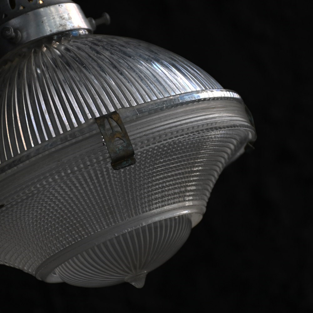Of smaller proportions this mid 20th century example of a 3-part Holophane consists of a silver metal gallery and chain and ceiling rose. The bottom section of the light removable, rewired and ready to use. Stamped Holophane inside the shade.