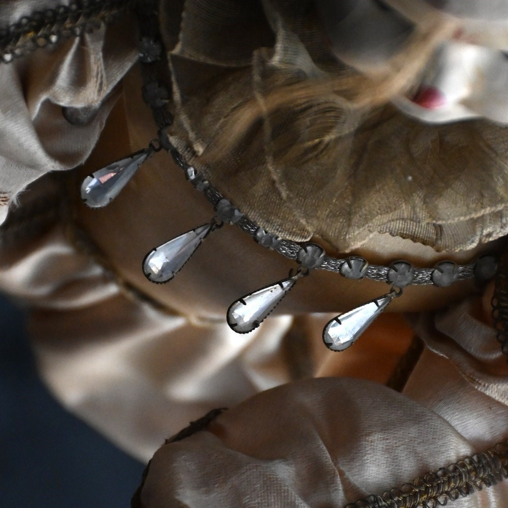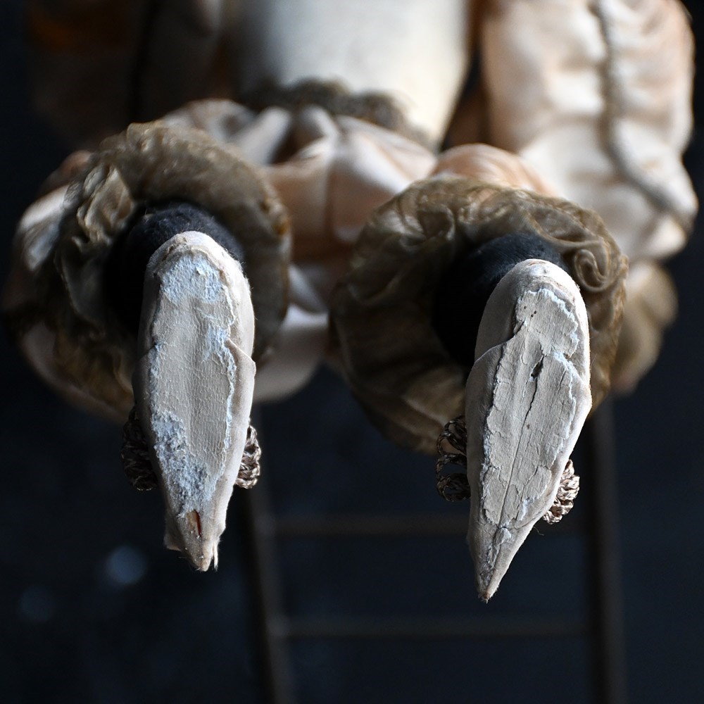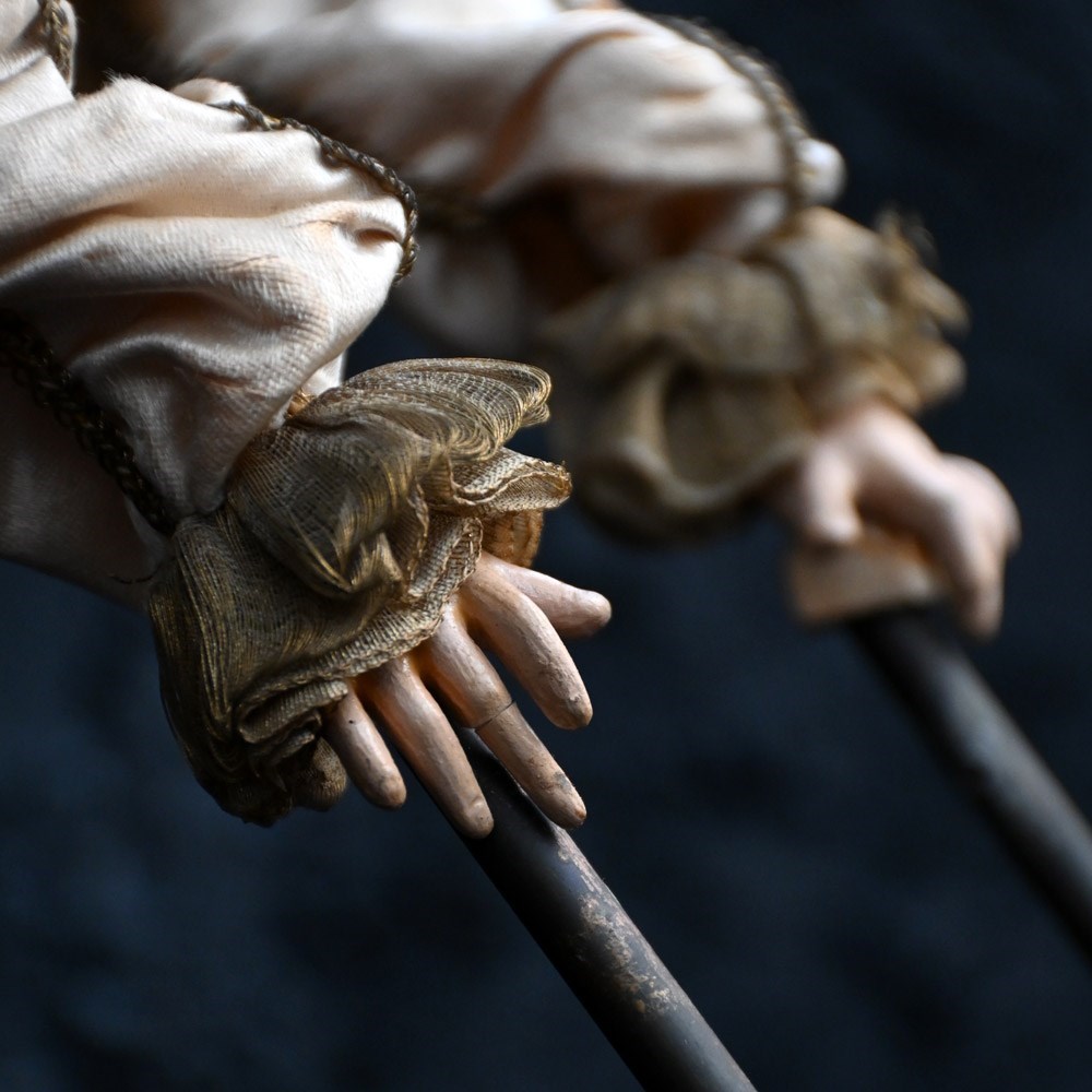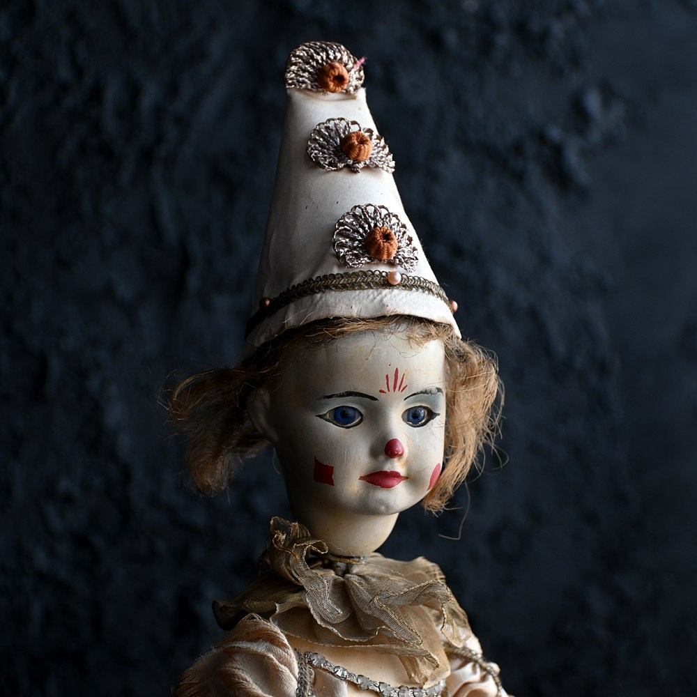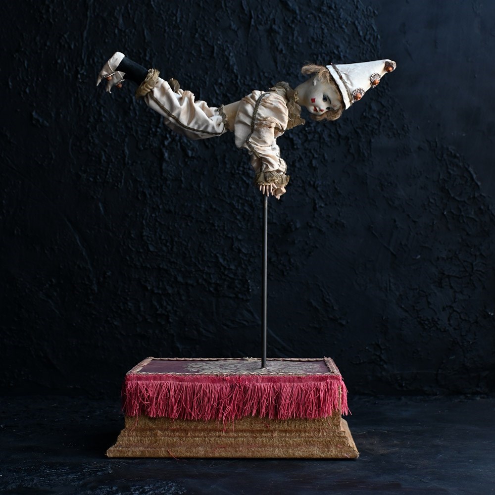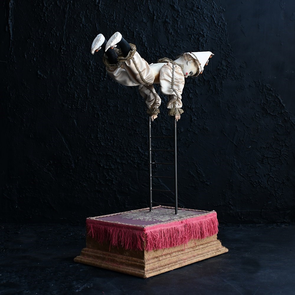 An unworking automaton example by Michel Marcu from the mid-20th Century. The respected maker of French automatons Michel created some amazing examples including this one. This item doesn’t have a key present but upon inspection of the mechanism everything is present and original to the item. The flip switch also is brass and moves up and down if somewhat loosely. The White Clown or Tightrope Walker as its more famously known with clown in a white silk costume with a painted bisque head made up with fixed eyes, it would performed acrobatics like movements, from a station upright on the ladder to eventually making its way up to a single arm handstand position. We believe after showing this to an expect repaired that the cost to bring this back to like is around £500 as all the mechanism is present. We have priced this item according to its non-working state.