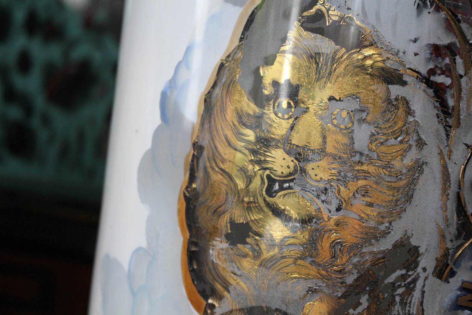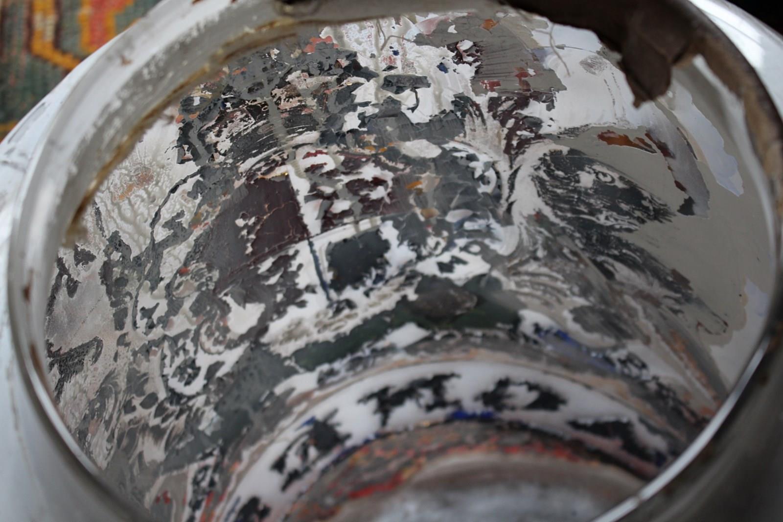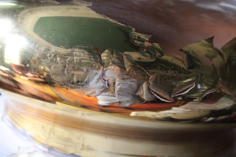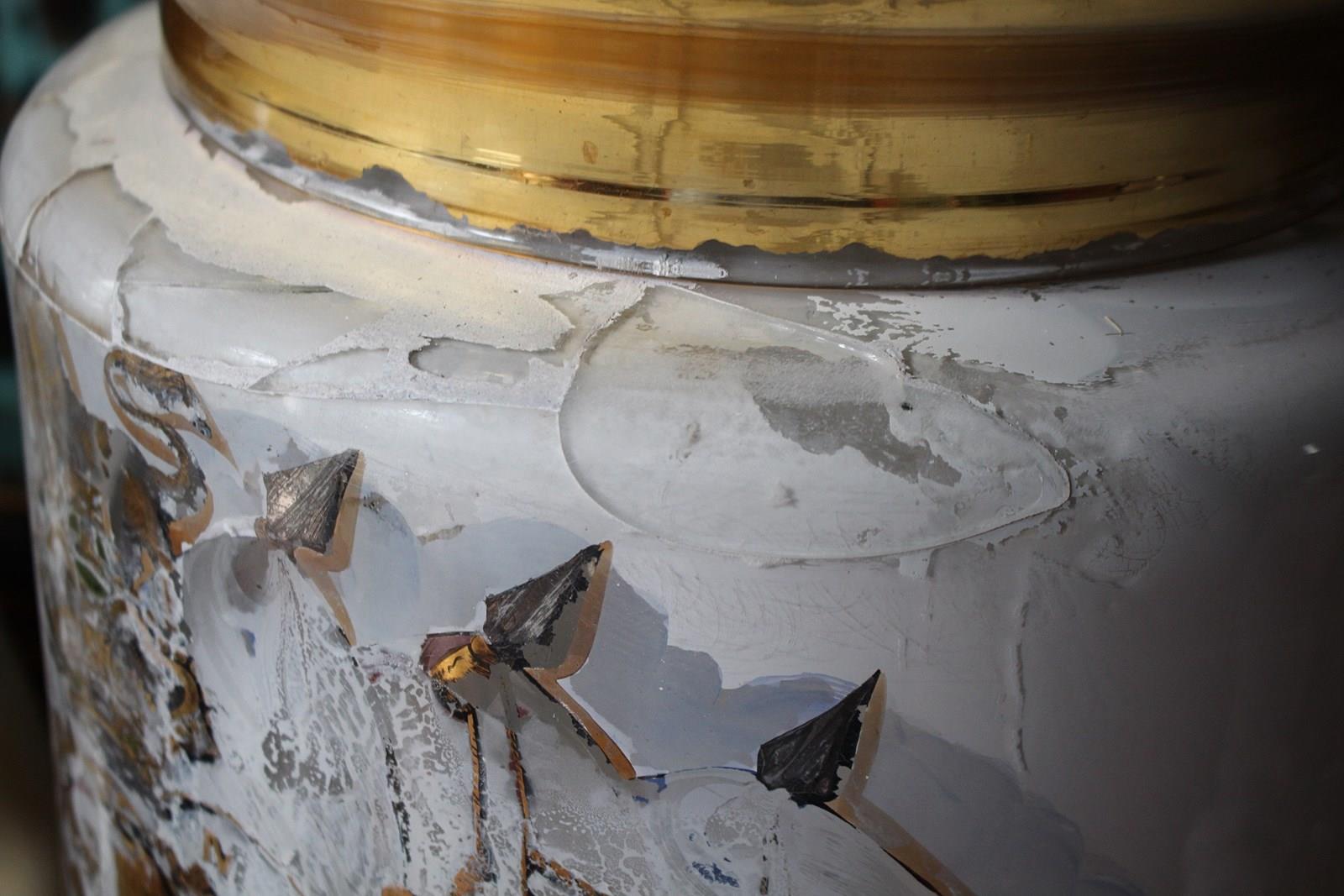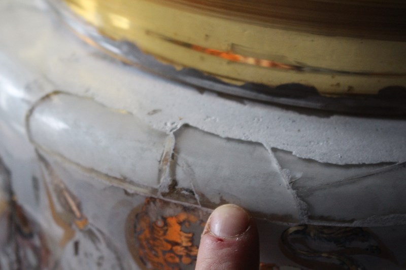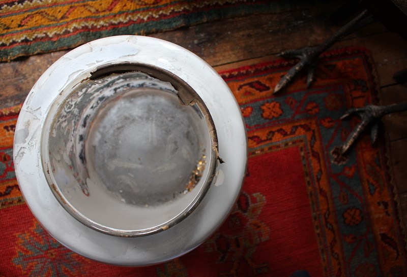 The jar has had some historical damage around the lip, this has been expertly repaired with a hessian backing and a high strength resin glass filler. Please refer to the photographs provided, the repair is solid and sturdy, and is well camouflaged with its positioning and some coverage from the gilt lined lid.