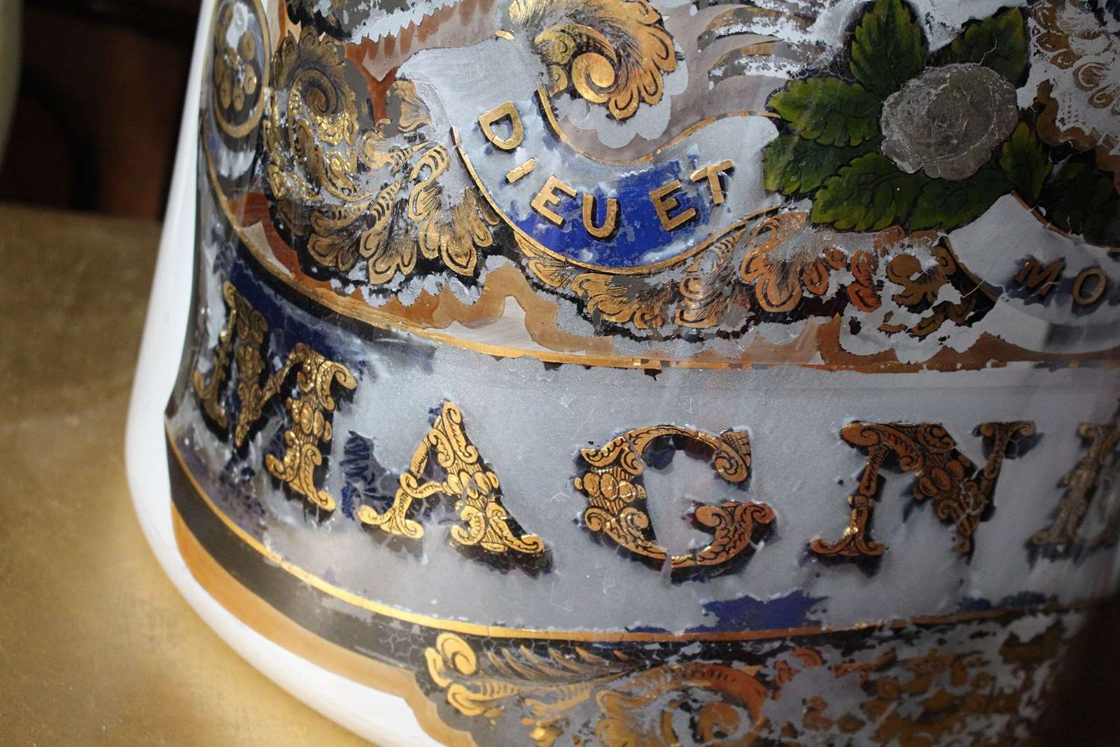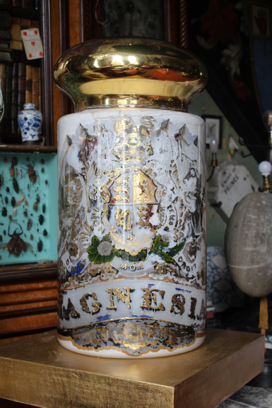 The jar is reverse painted, with an off white ground and gilt detailing, there is some loss to the paintwork, but this only adds to its charm and the overall decorative quality. The jar would of housed "MAGNESIA"