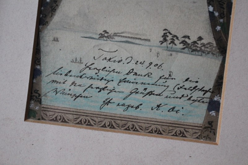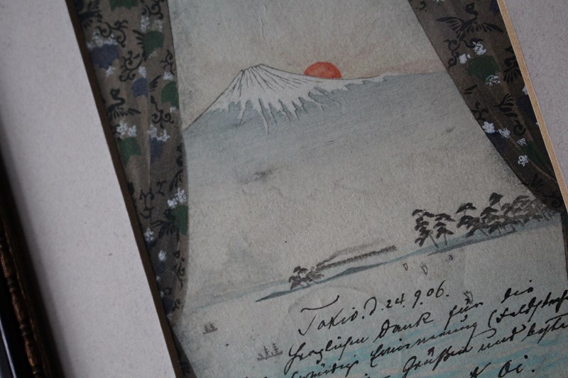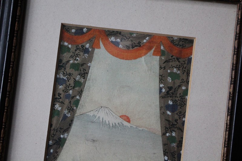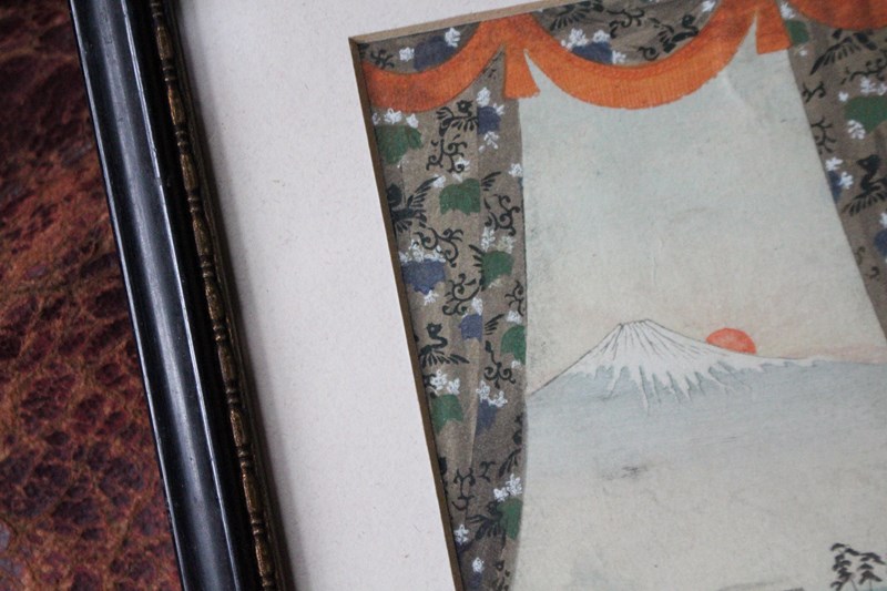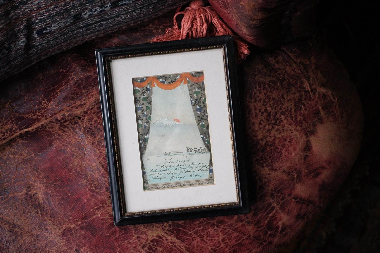 Ink and watercolour postcard of Mount Fuji at sunrise, posted almost 120 years ago from Tokyo to Europe. The view is framed with a beautifully patterned pair of curtains and pelmet.