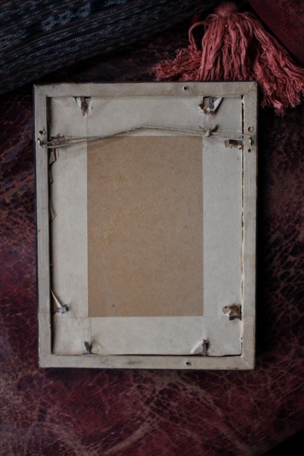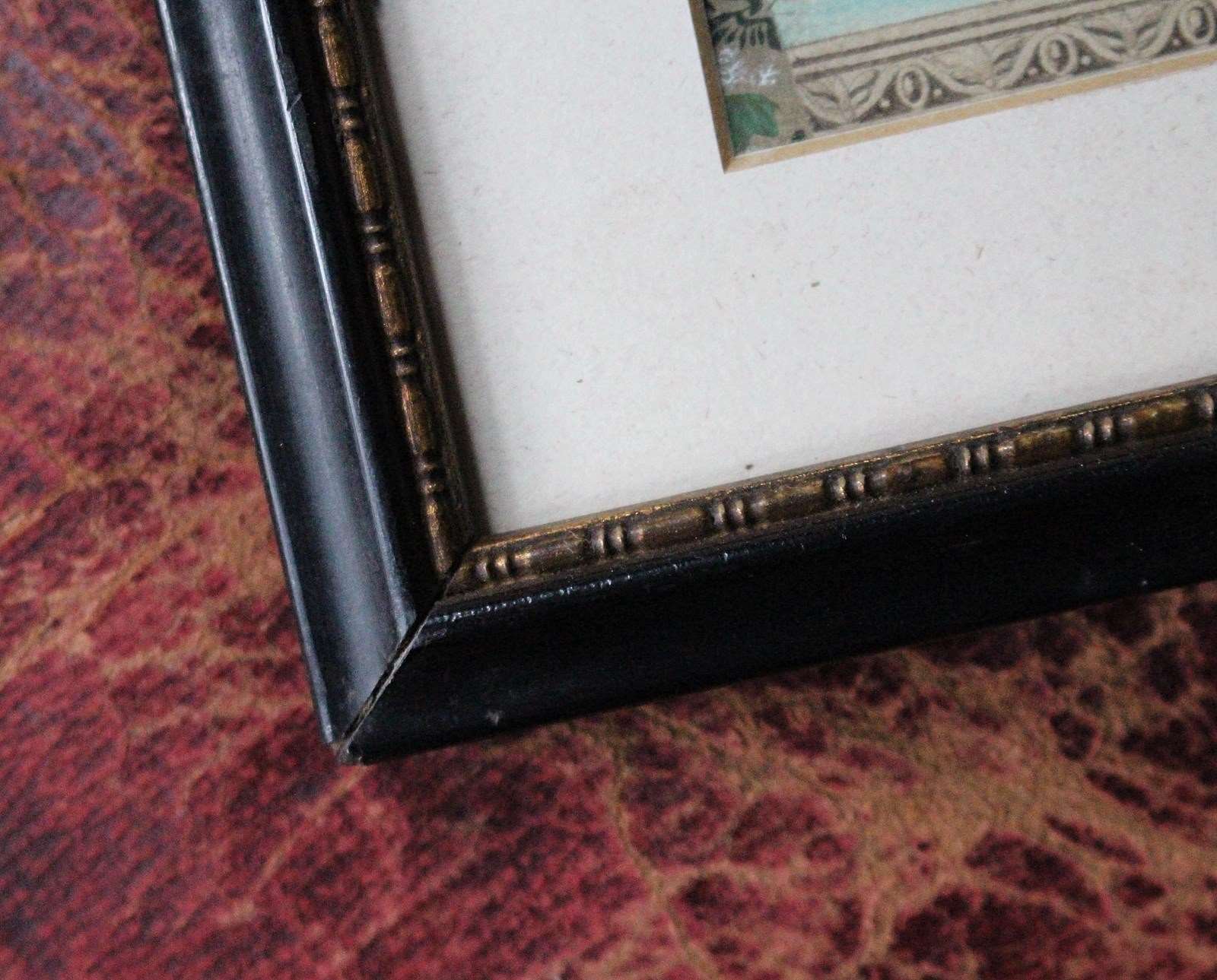 Age related discolouration and browning to the card, housed in a period ebonised and gilt slip frame.