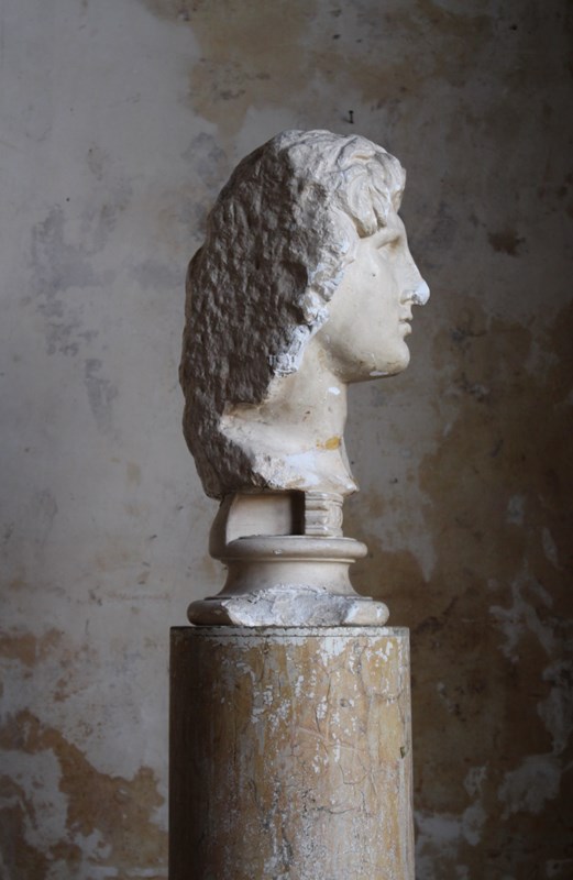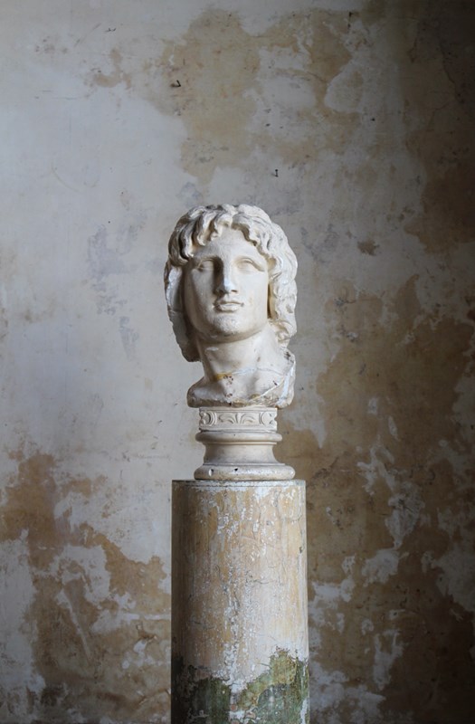 19th century plaster bust of Alexander the Great on typical socle base, most portraits of Alexander, of which there are many, were produced long after his death, particularly the more youthful-looking ones like this one. He has long, god-like hair and an upward gaze, resembling his description in literary sources.
