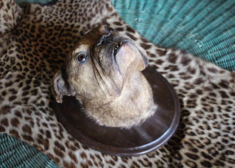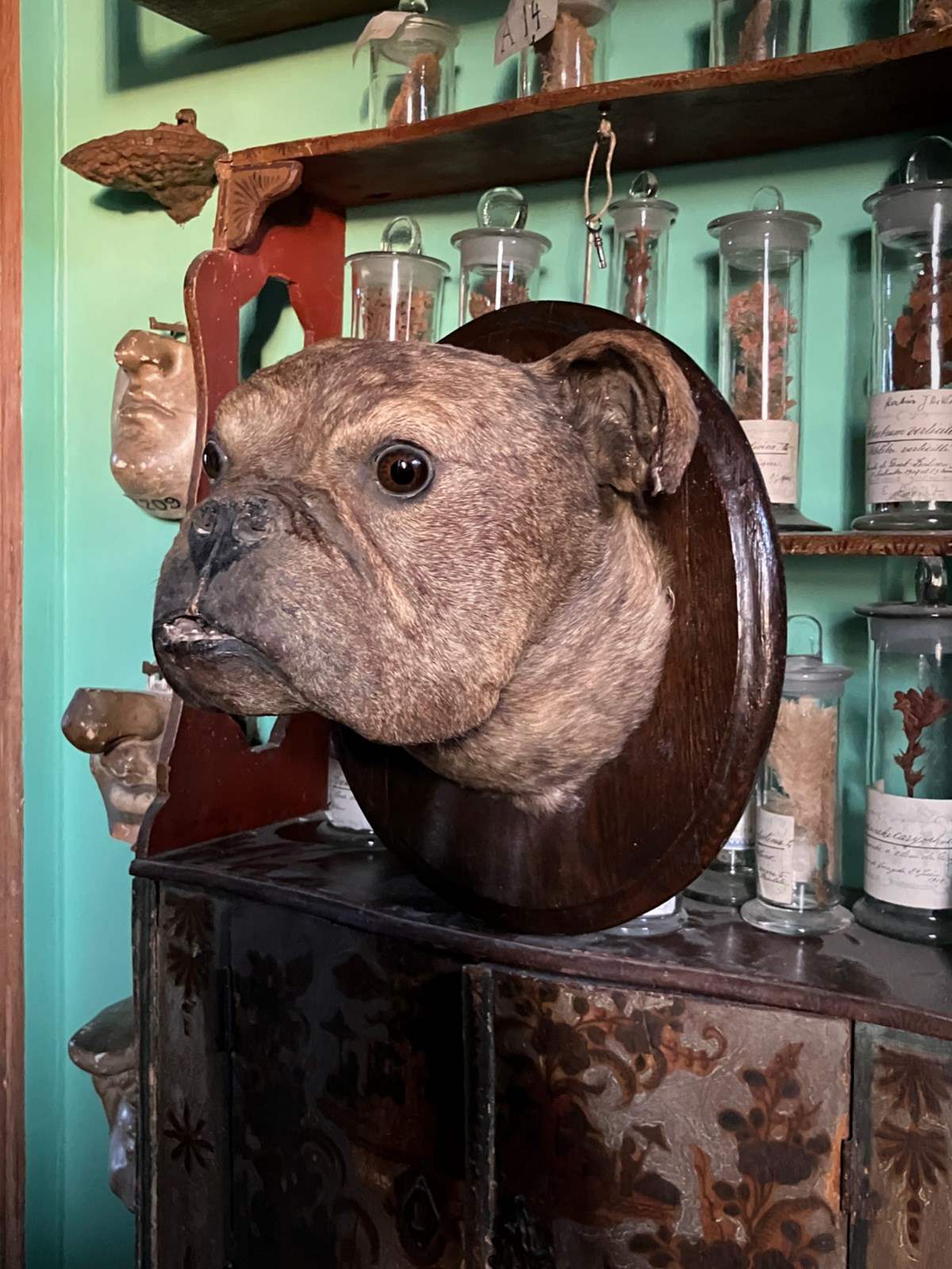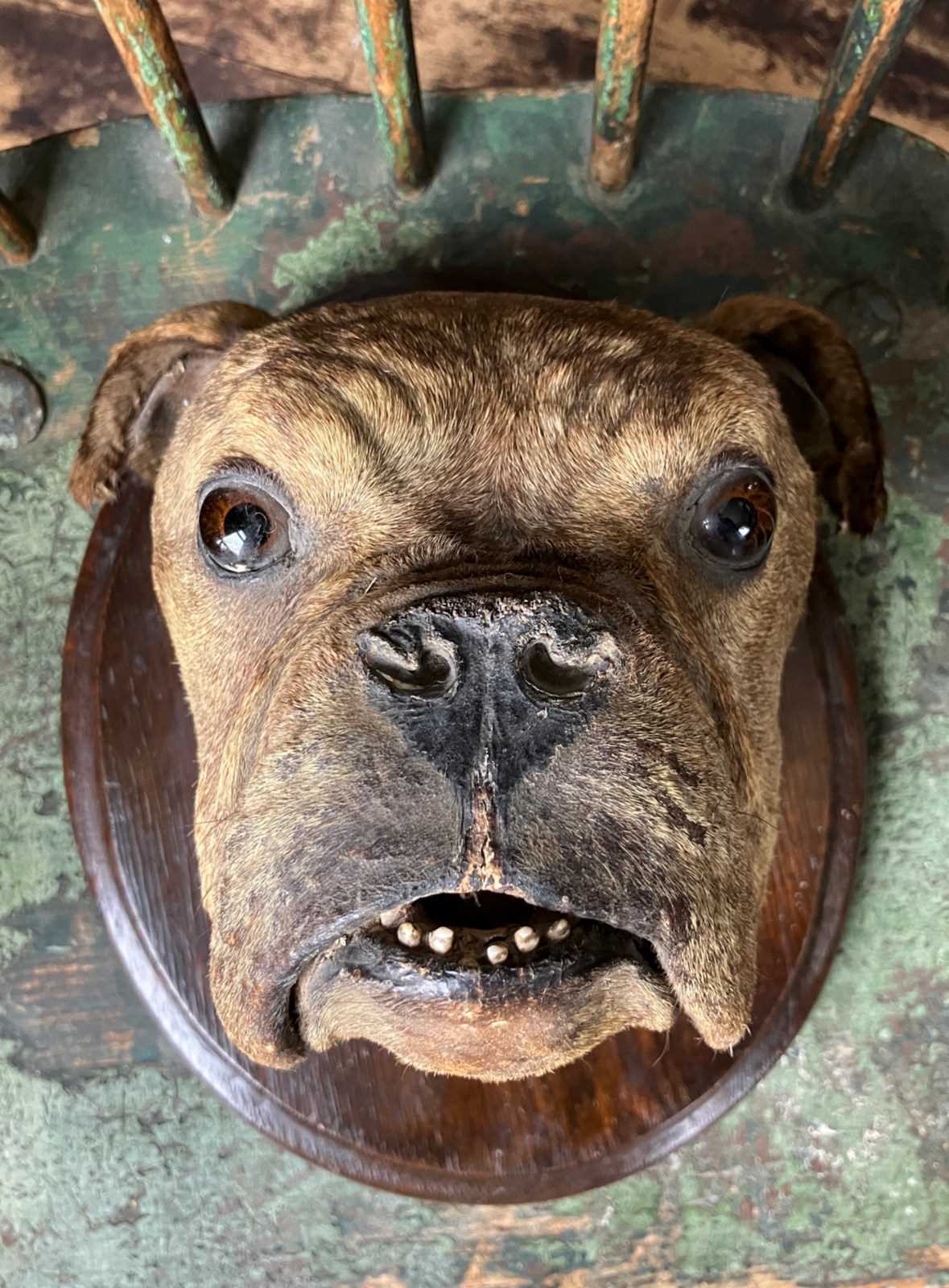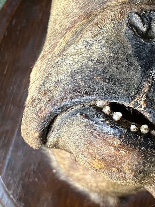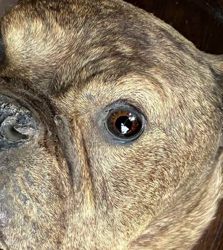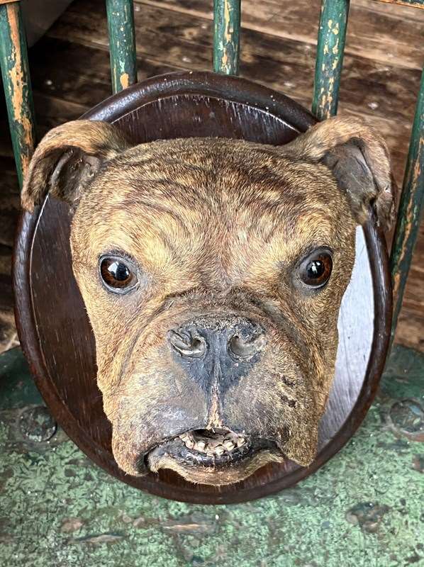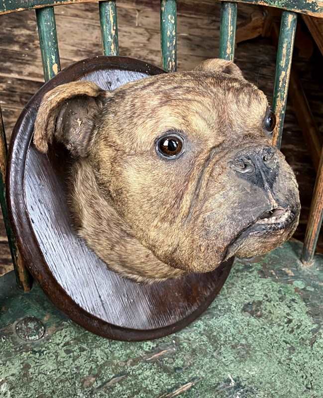 A very rare taxidermy head mount of an English Bulldog, housed on its original circular oak shield.