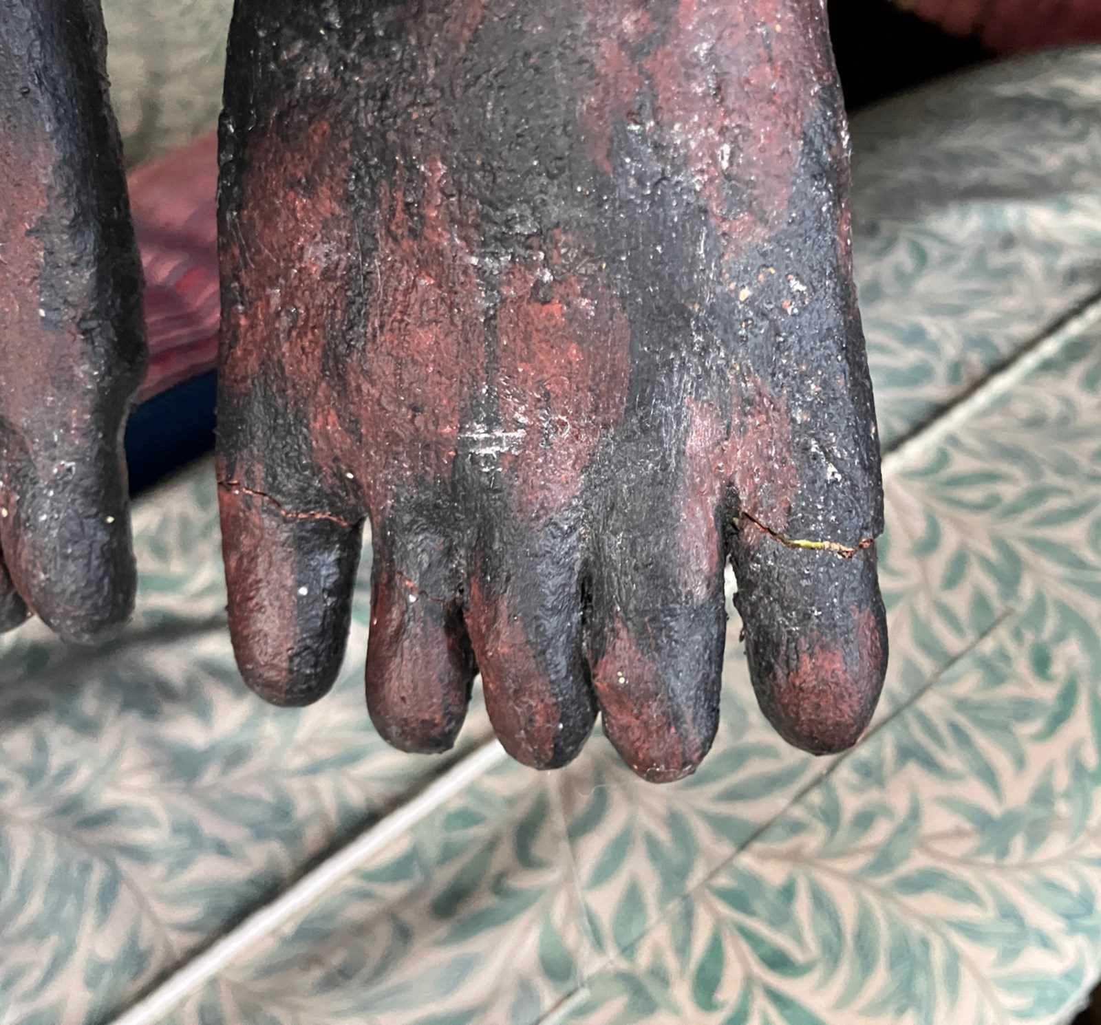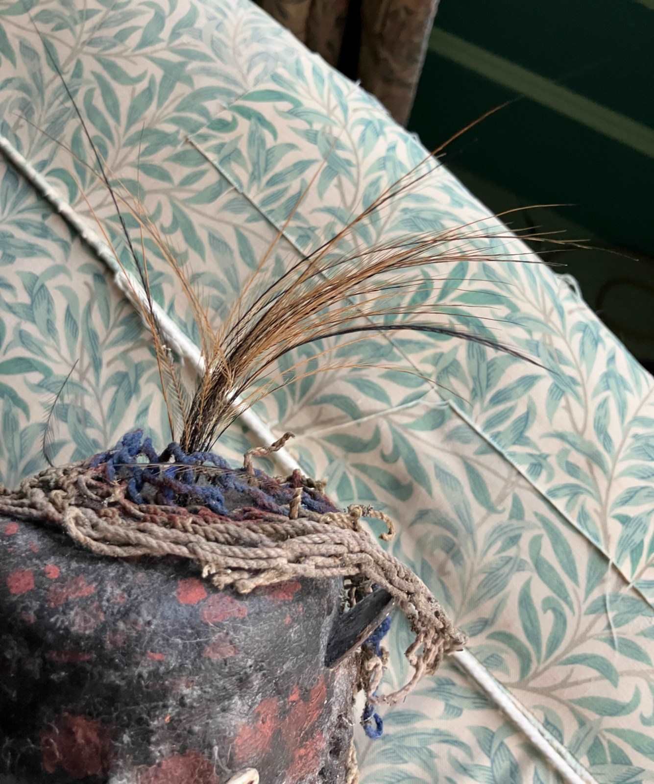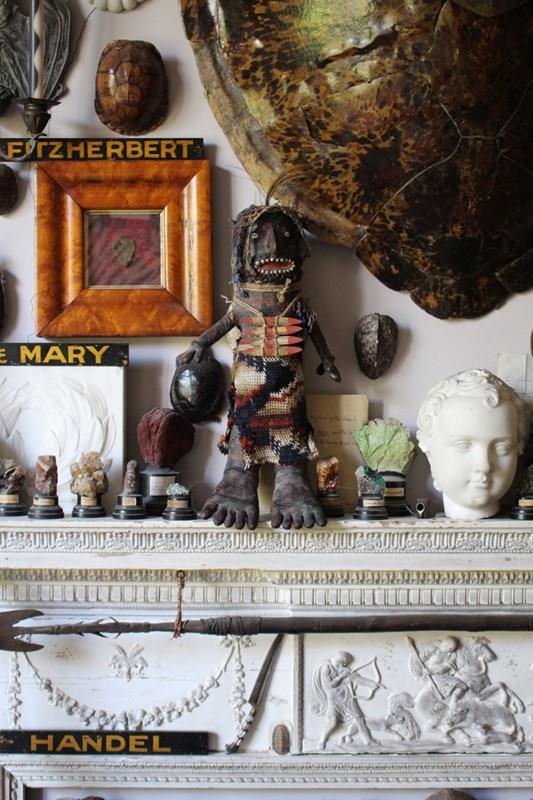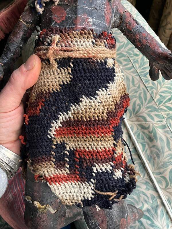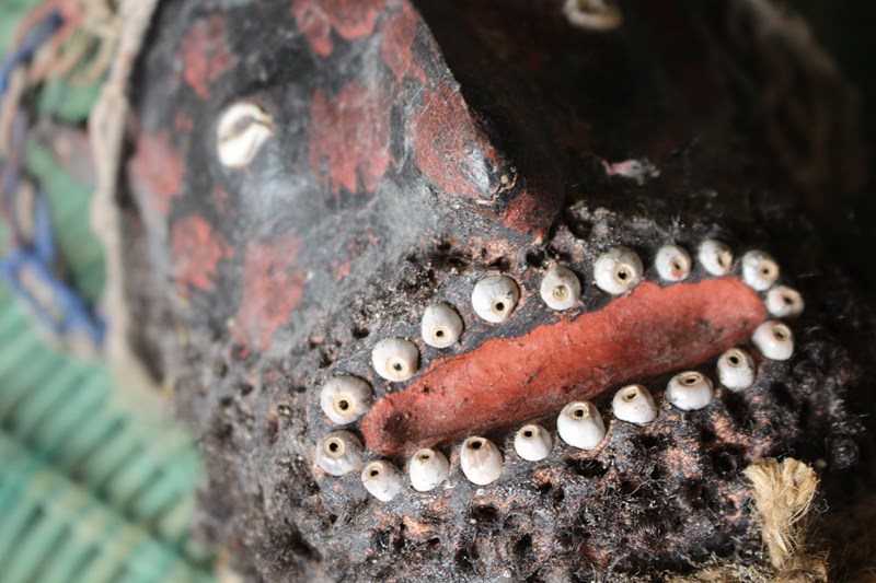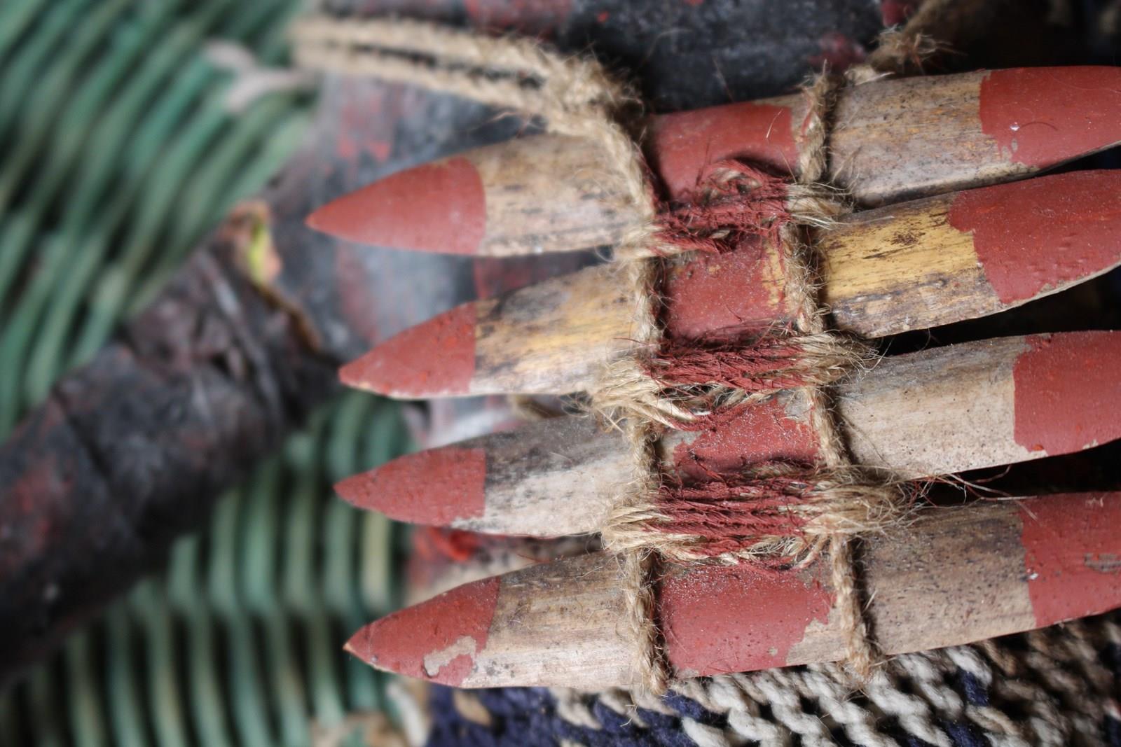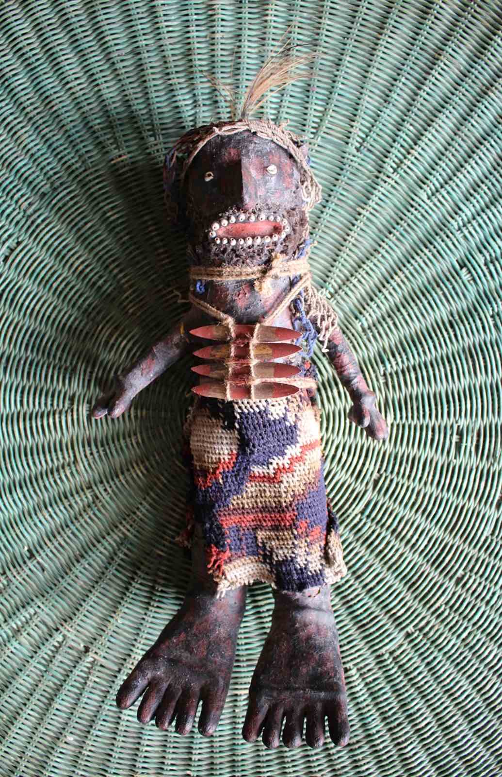 A Mendi 'Compensation' or 'Revenge' Doll, traditionally made with pandanus leaves, bilum string, shells, wood, seeds and objets trouve with pigments.