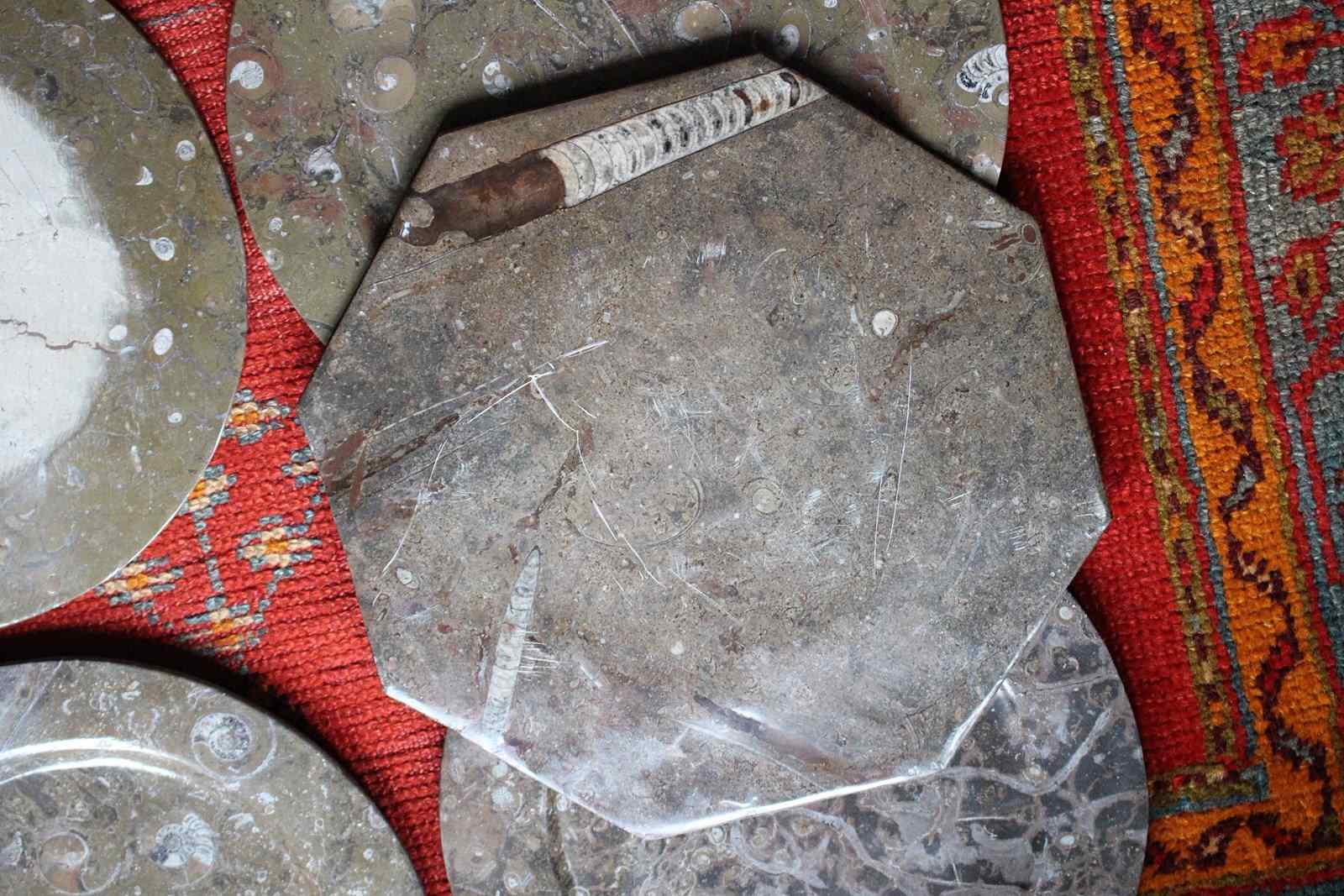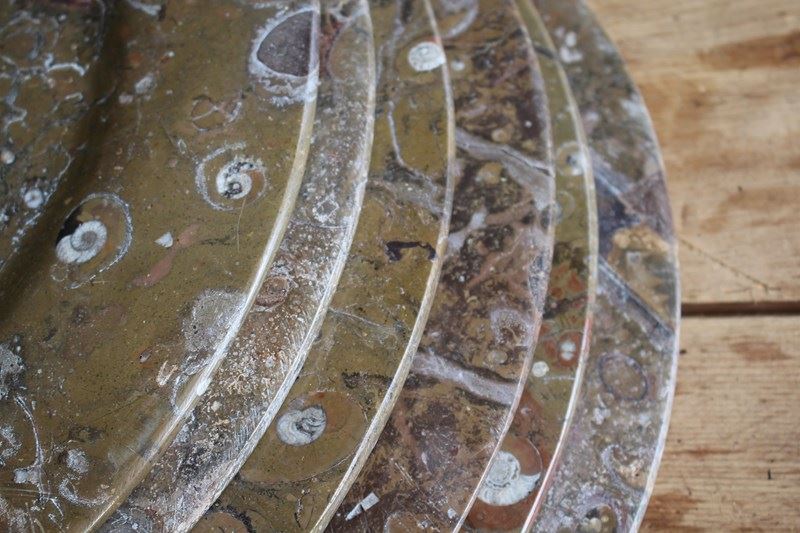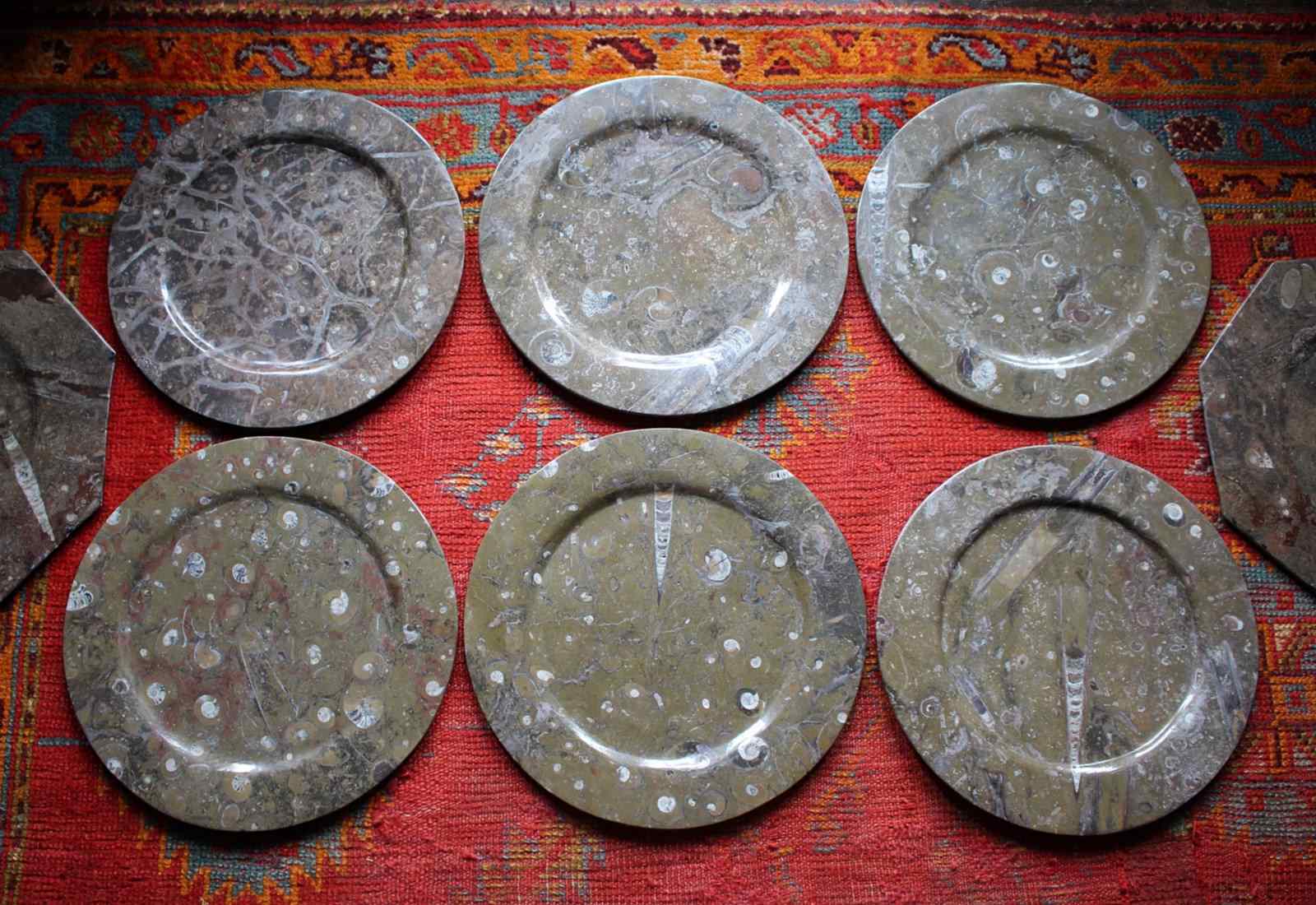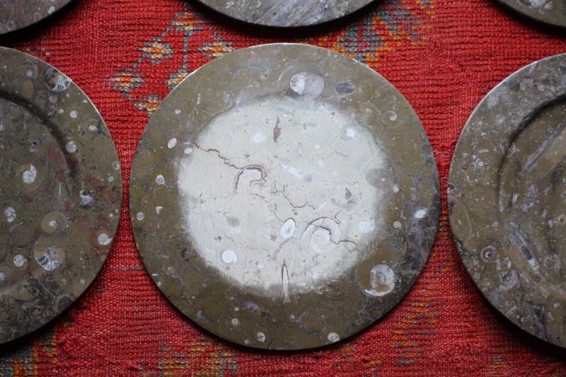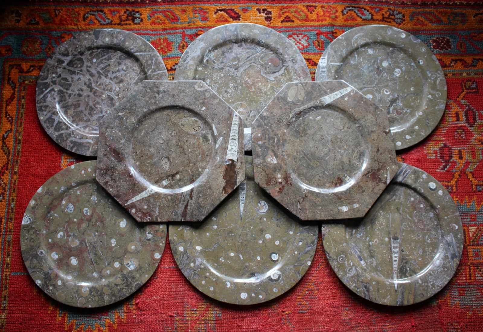 A great collection of eight fossil plates, 6 circular and two octagonal all appears to be cut from a similar stone. Each plate is unique in appearance and covered with Orthoceras, Ammonite and Goniatids fossils.