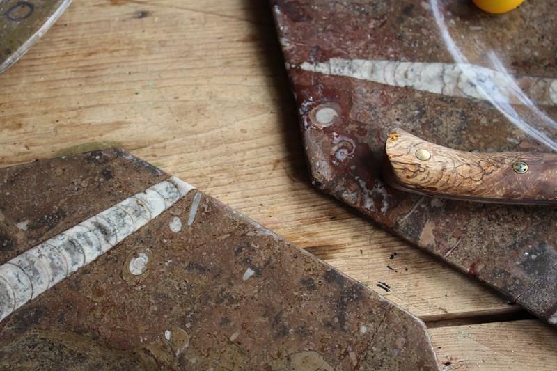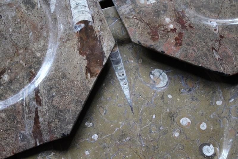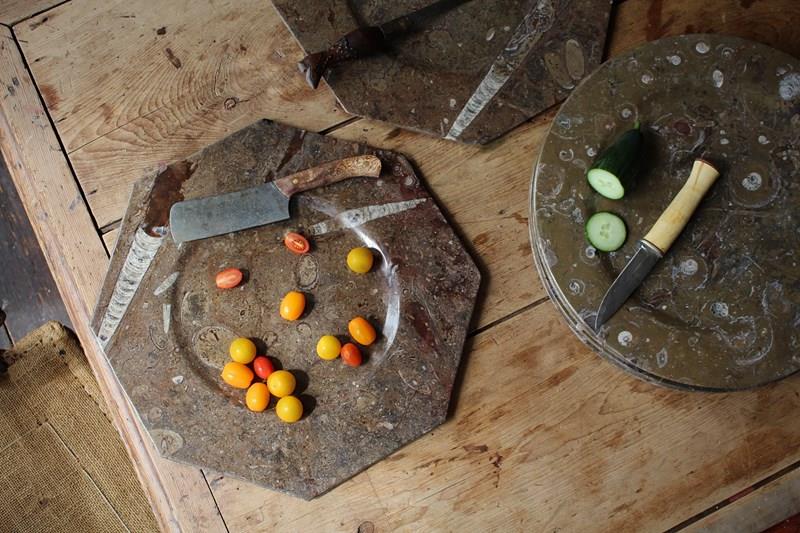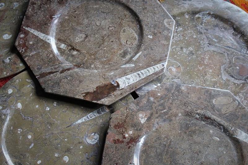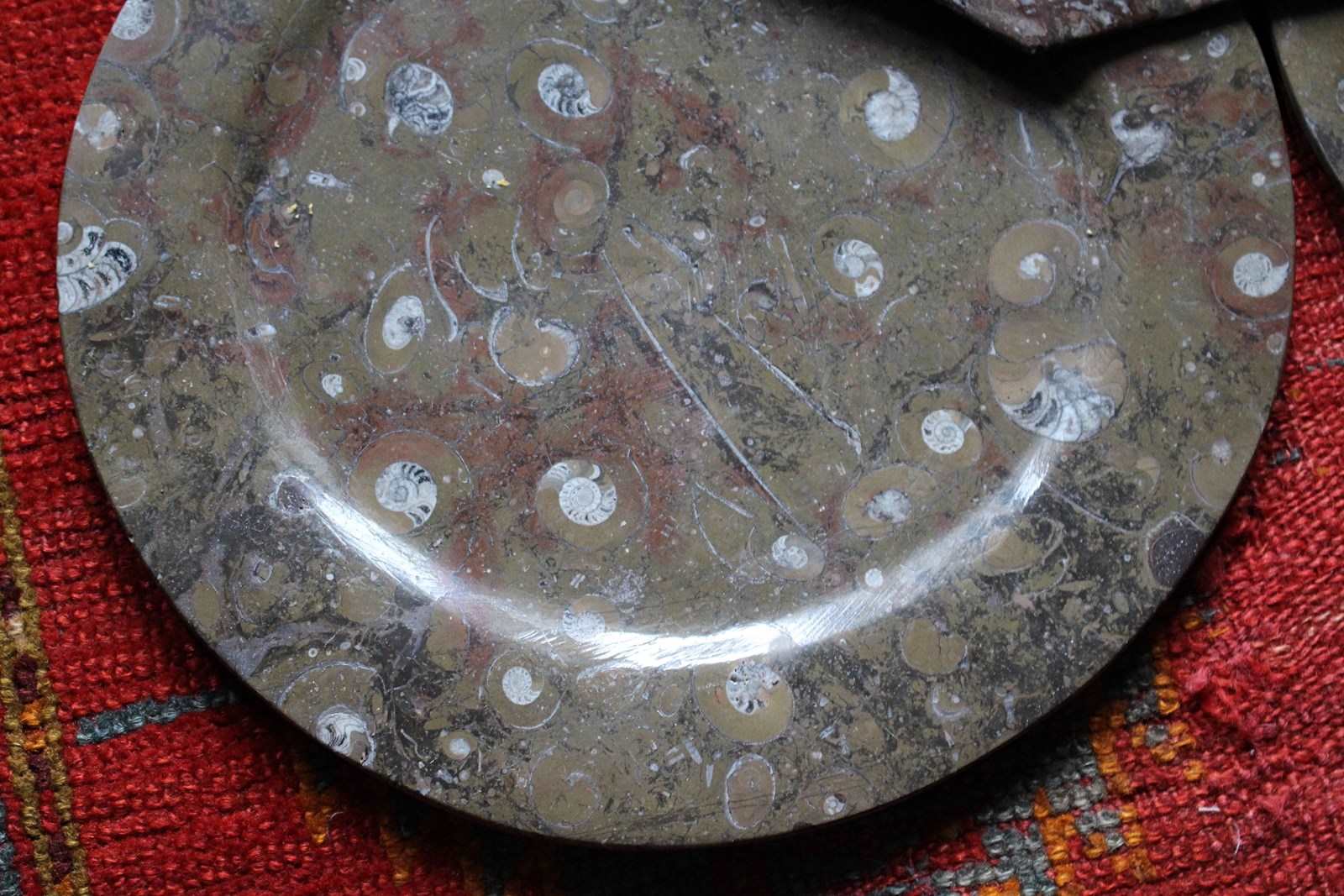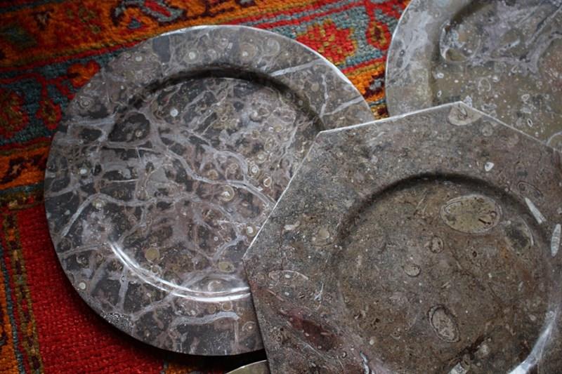 A great collection of eight fossil plates, 6 circular and two octagonal all appears to be cut from a similar stone. Each plate is unique in appearance and covered with Orthoceras, Ammonite and Goniatids fossils.