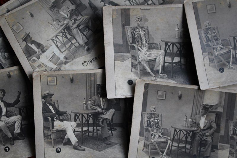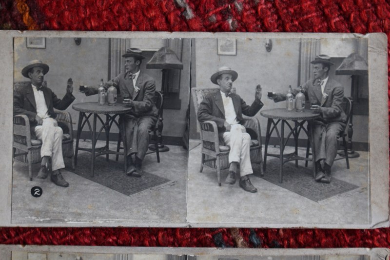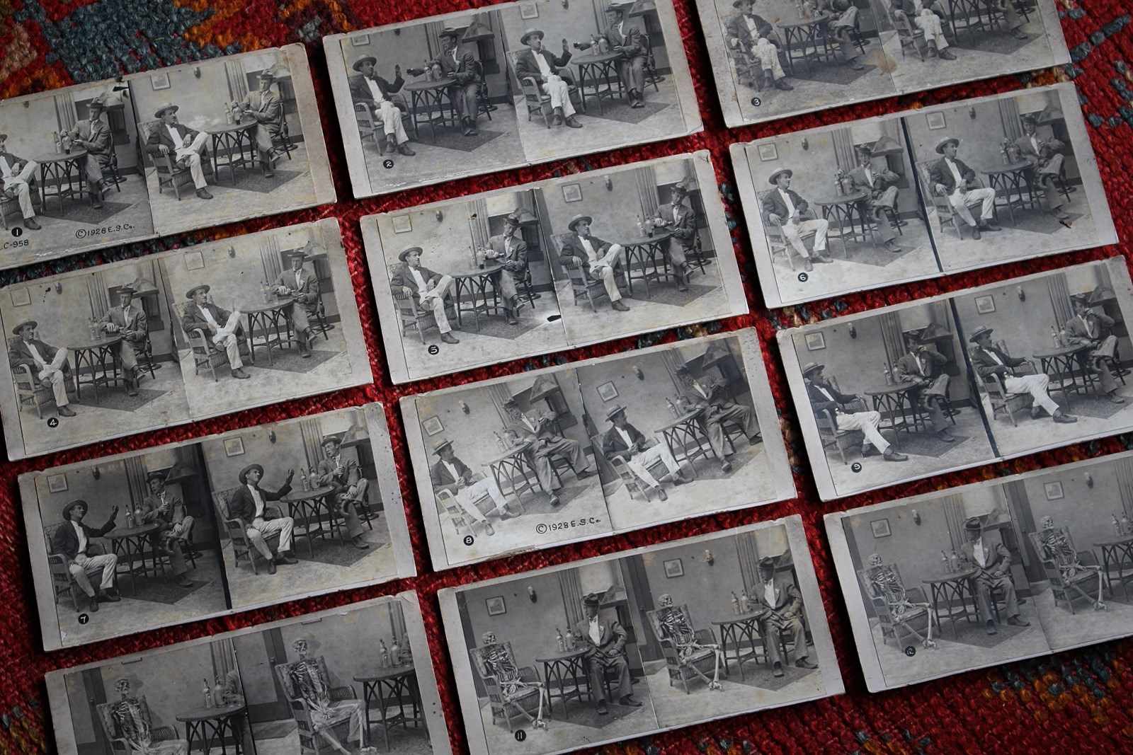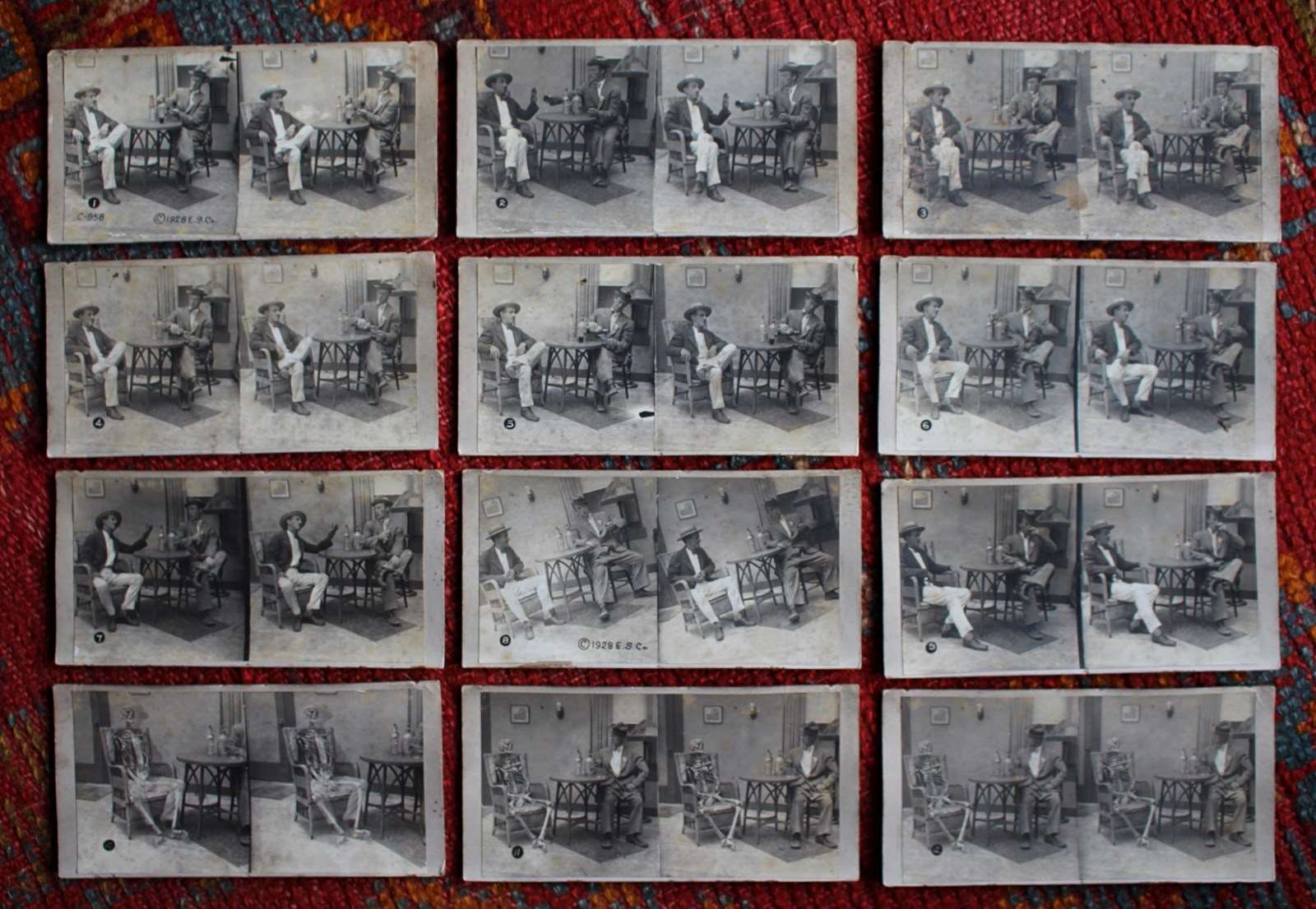 A amusing and complete set of twelve prohibition era stereoviews, showing a man gradually turning into a skeleton after refusing to drink alcohol.