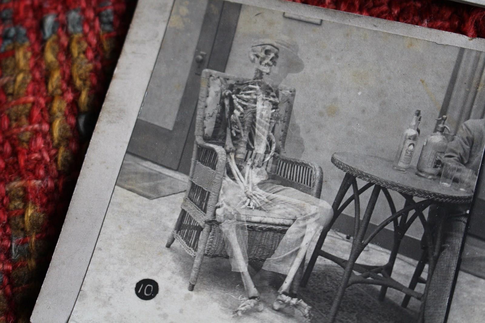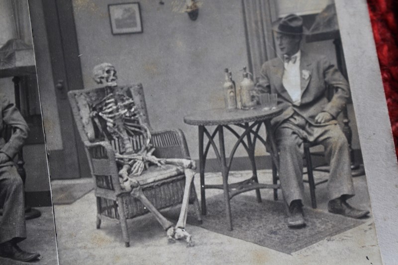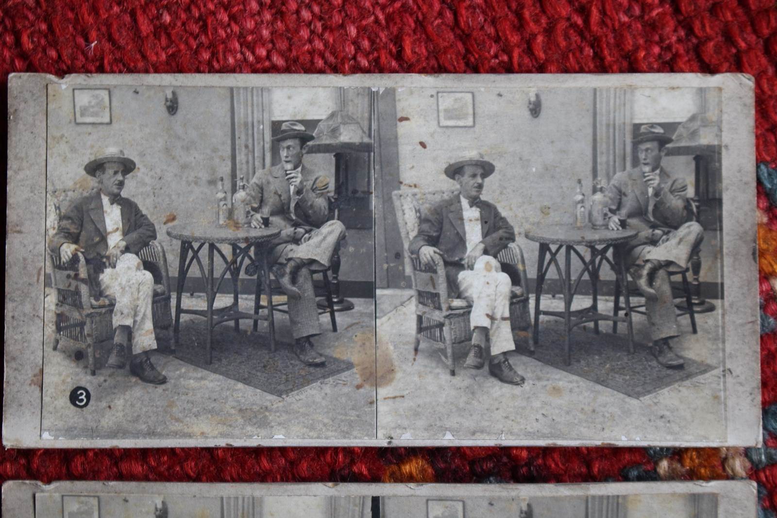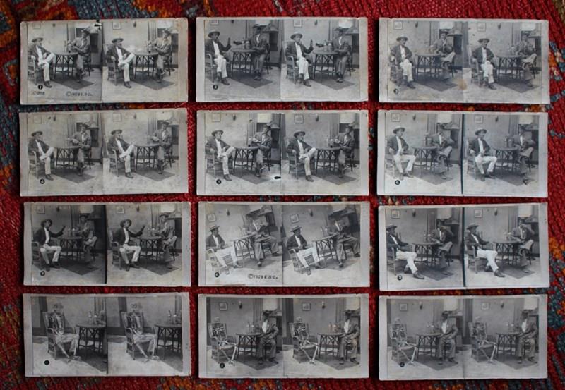 A amusing and complete set of twelve prohibition era stereoviews, showing a man gradually turning into a skeleton after refusing to drink alcohol.