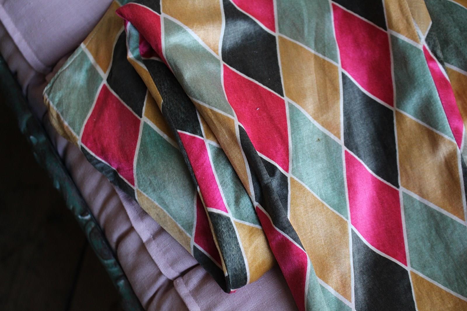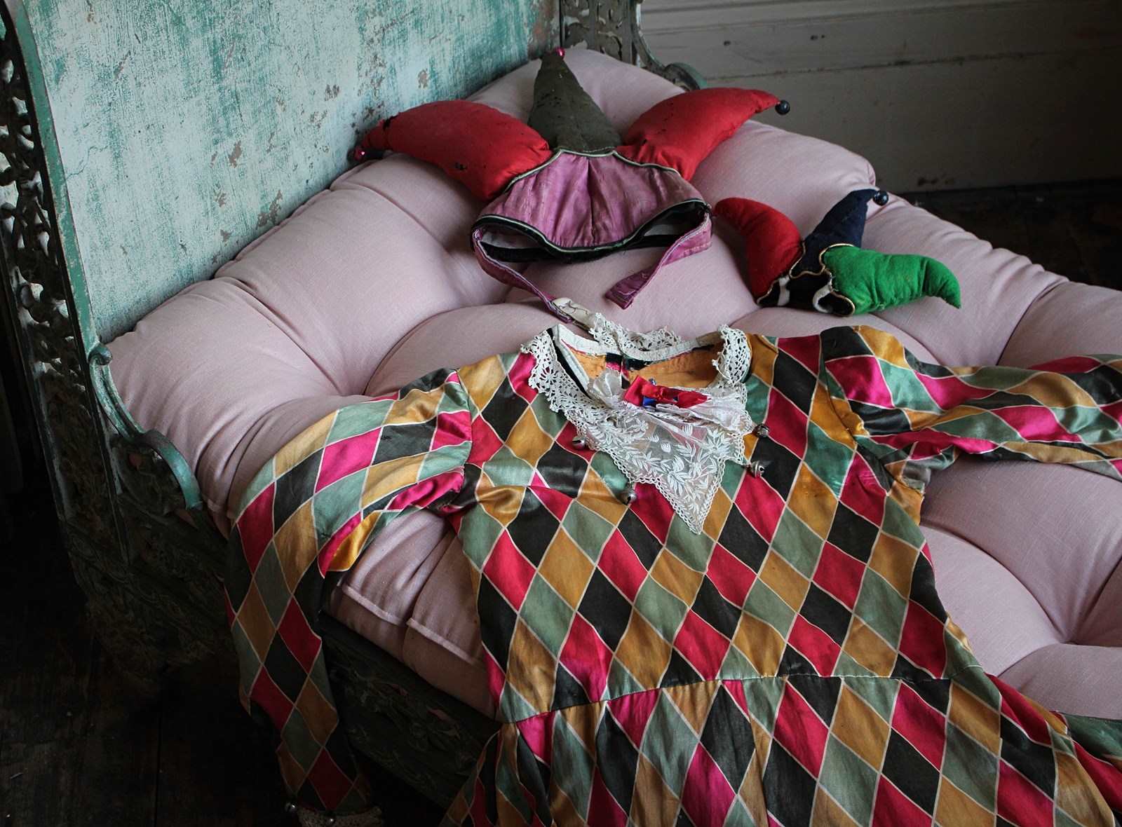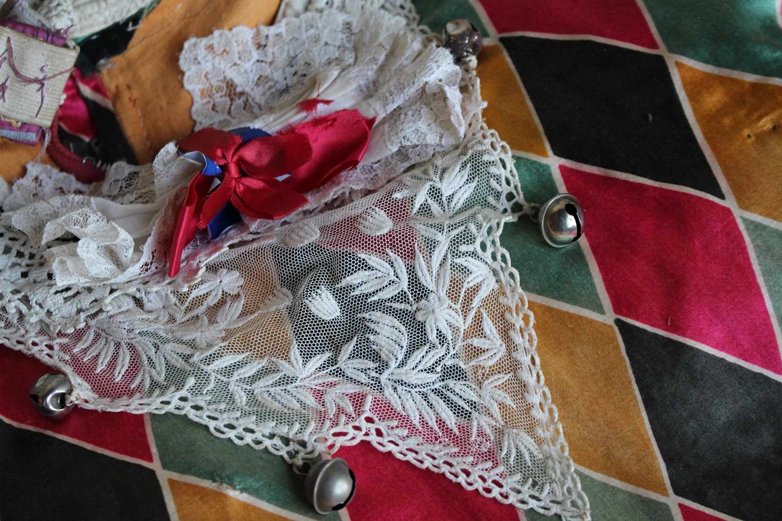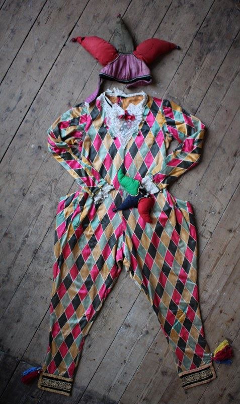 A vintage harlequin costume with its original hat and glove, from the Wookey Hole collection, donated from the Clowns Gallery Museum.