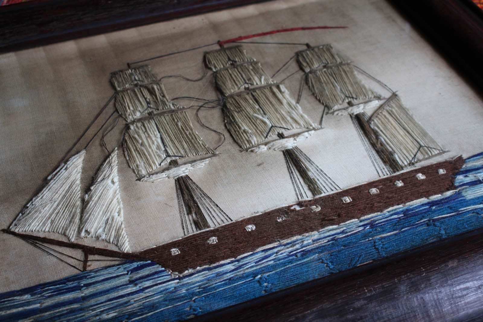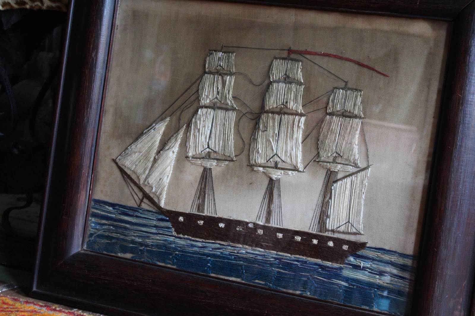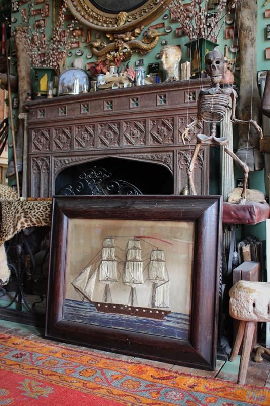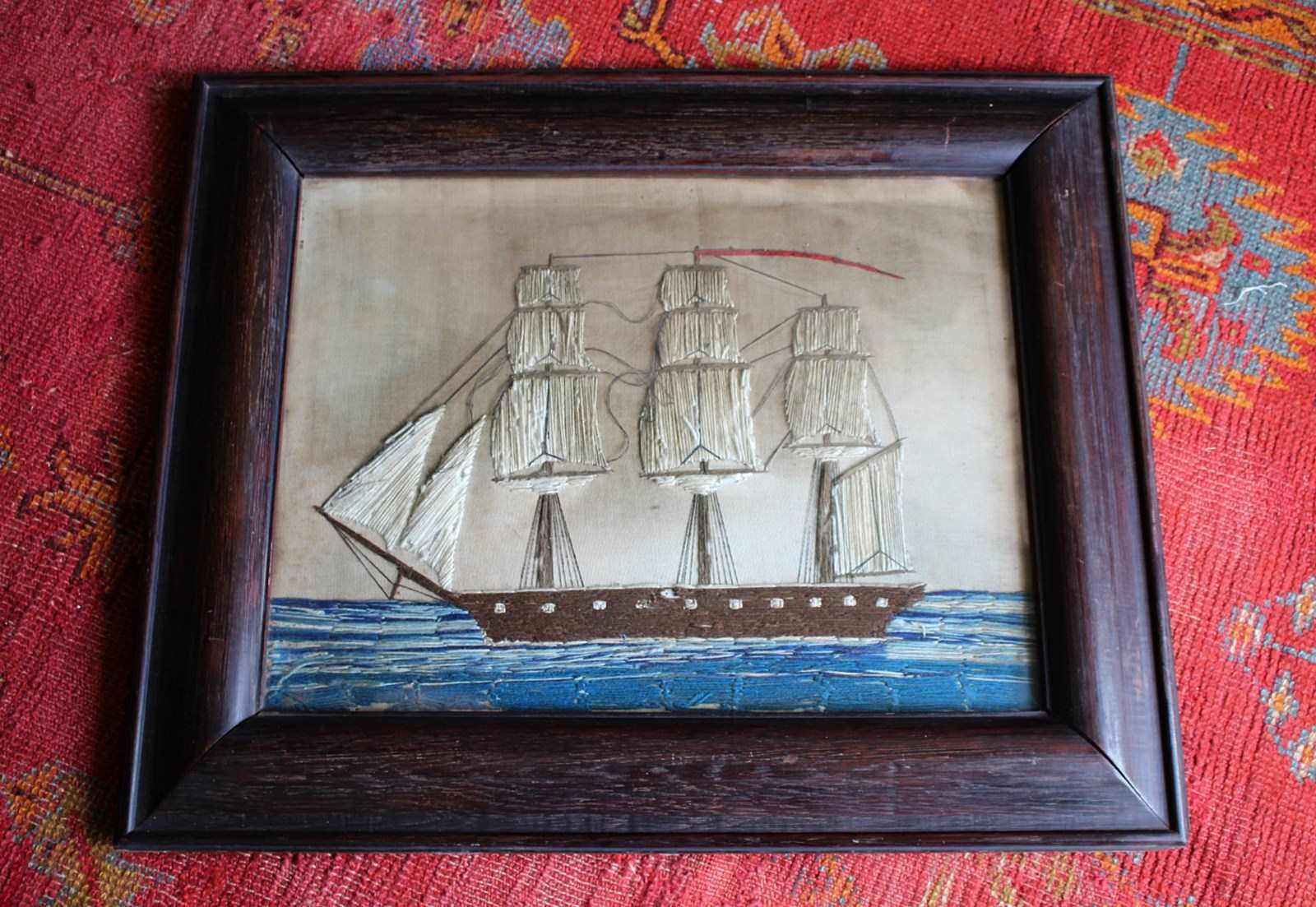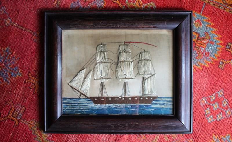 A charming and naive sailors woolwork or "woolie" depicting a triple masted sailing ship at sea, housed in a substantial cross cut oak cushion frame.