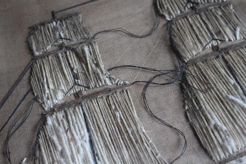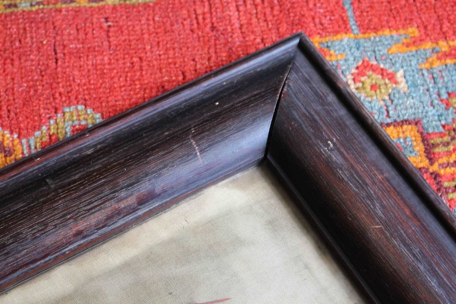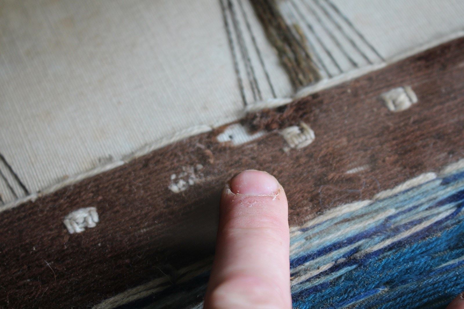 The woolwork shows signs of wear, holes, staining and soiling yet still has a wonderful decorative look.