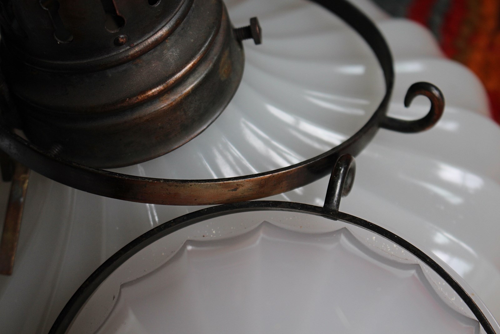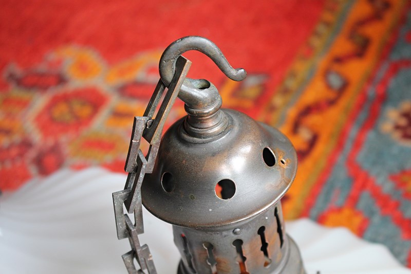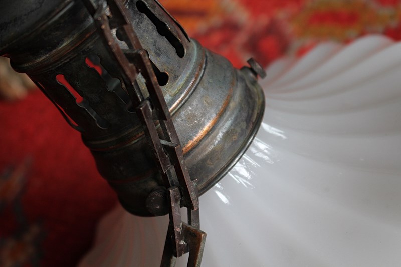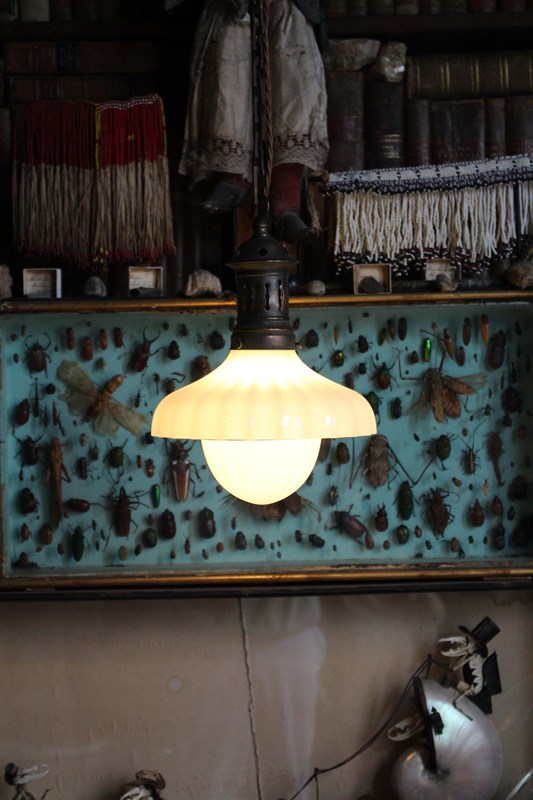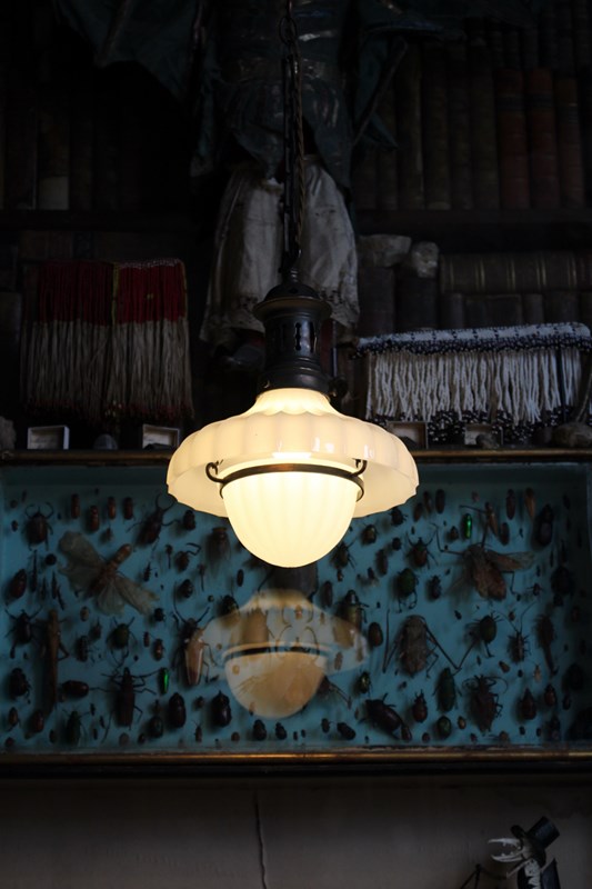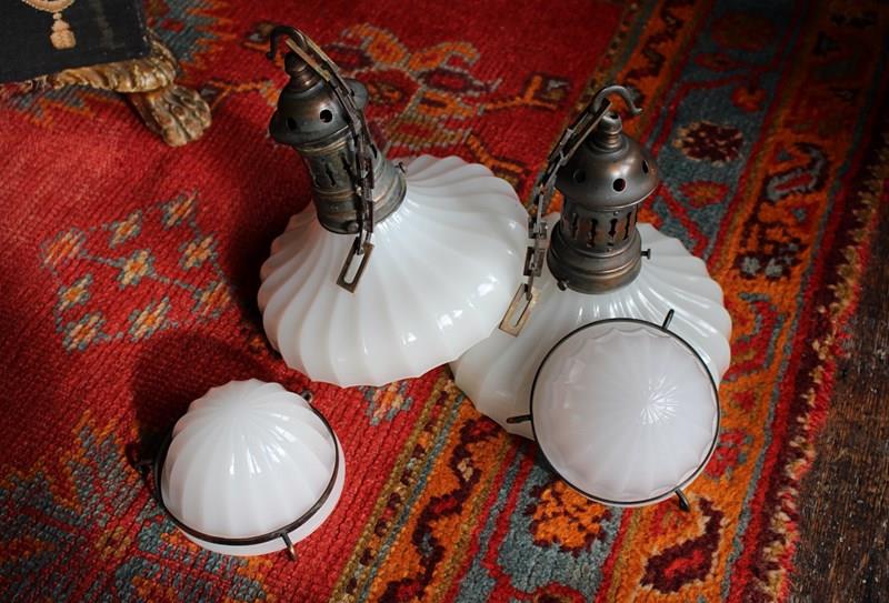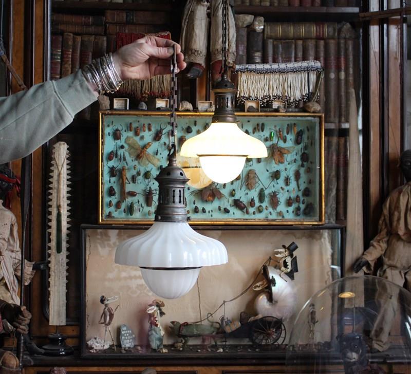 A seldom seen, pair of Jefferson Doriclite pantry pendants, two sections of thick pressed glass housed in a heavily oxidised gilt copper gallery and central hanging bands, early 20th century.