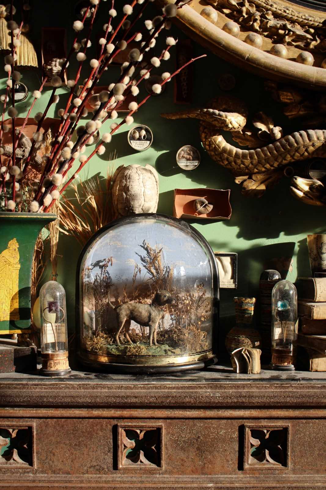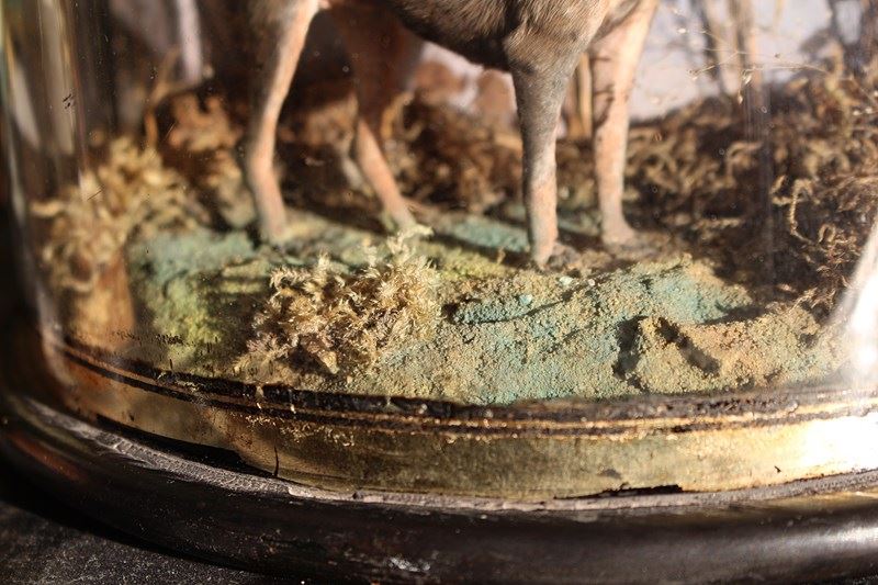 Housed in its original bow fronted and ebonised case on bun feet, with reserve painted gilt bottom border, all the original foliage seems present and correct. The dog has his brass mounted collar. Overall a completely untouched and original example.