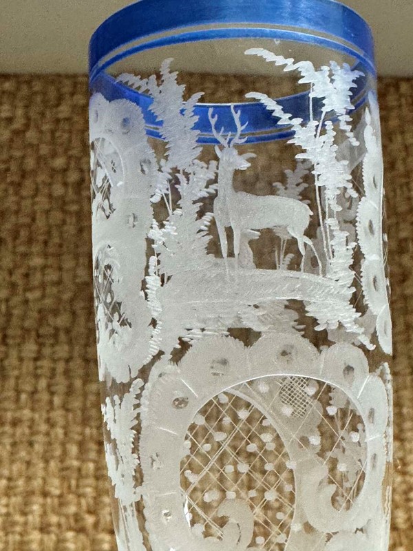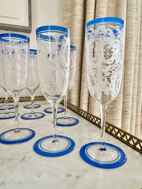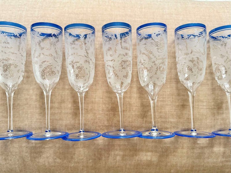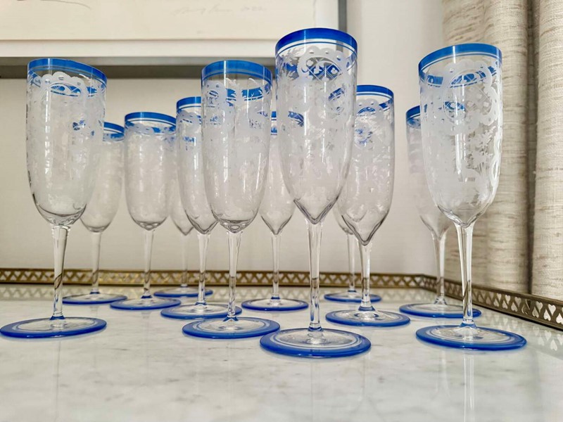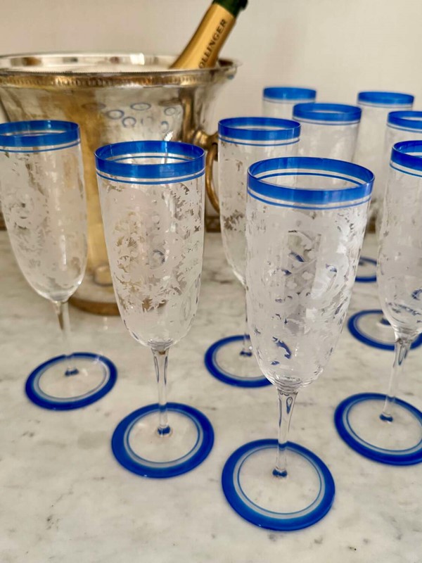 An outstanding set of a dozen Art Deco Bohemian wheel etched champagne fluteswith hand applied blue enamel rims, Circa 1920s. Each superb glasshas been hand crafted, with individually engraved scrolled patterns and charming forest scenes including Stags, Pagodas and birds. Generous in size, these glasses hold a maximum of 170ml. All in all, a splendid and rare set which would work well for champagne or cocktails.