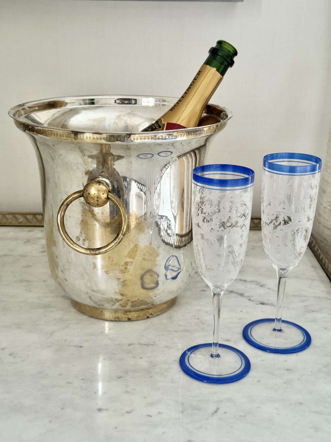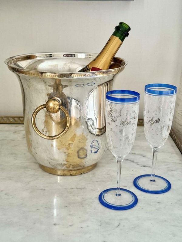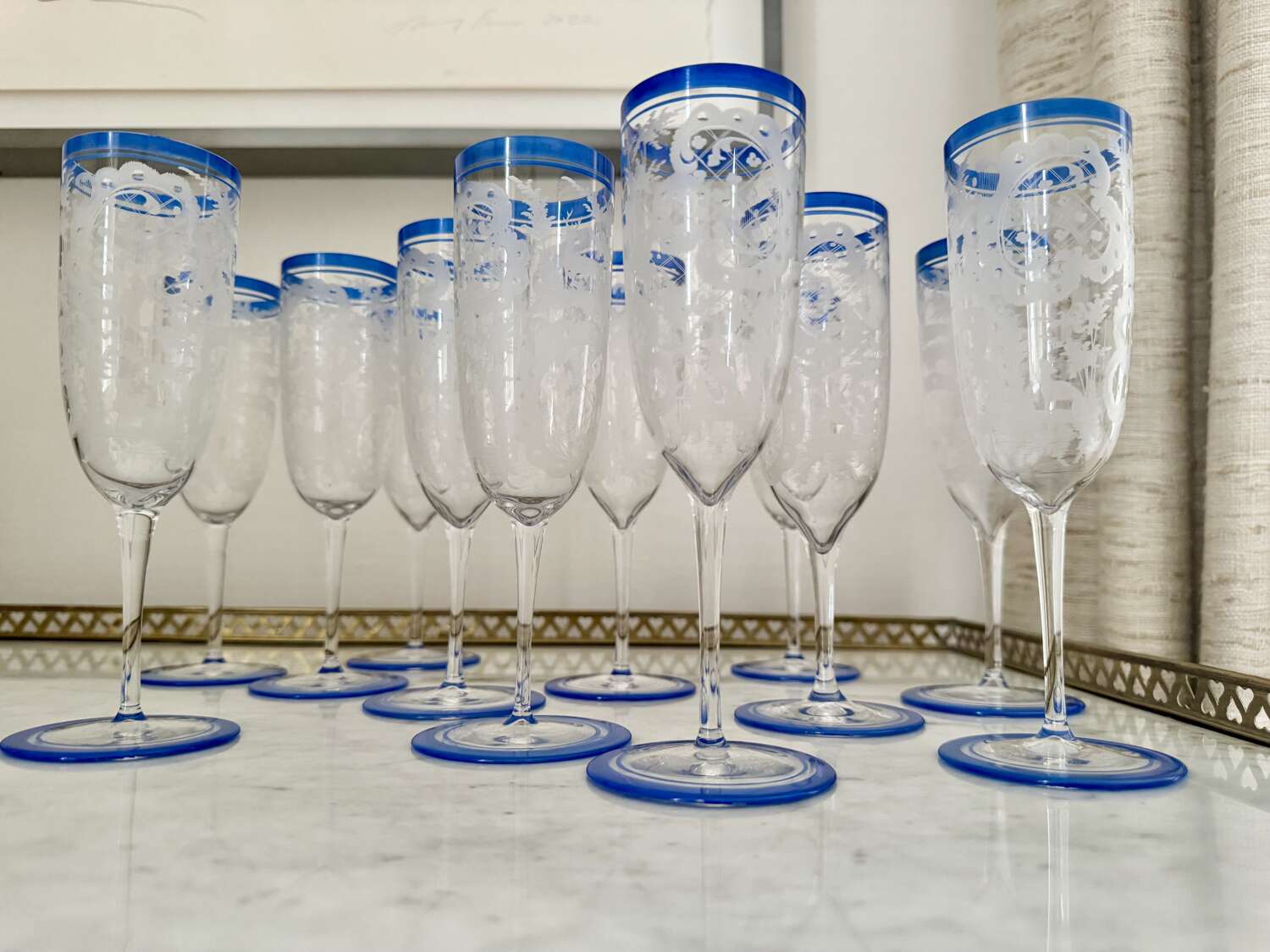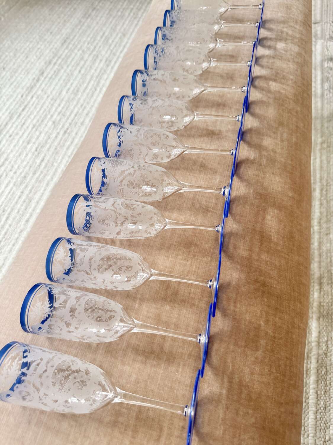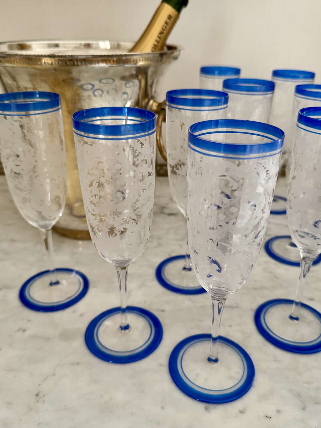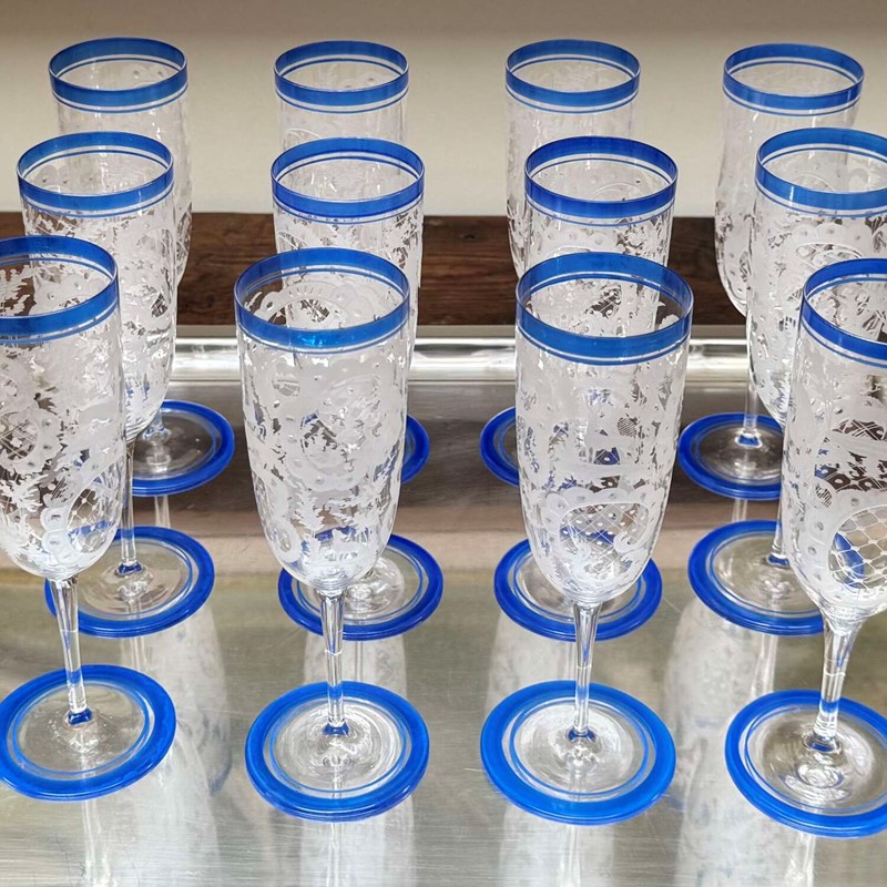 12 Art Deco Bohemian Etched Champagne Flutes With Blue Enamel Rims