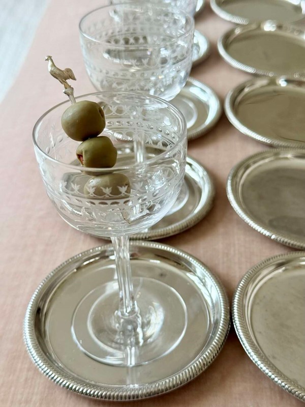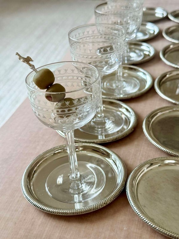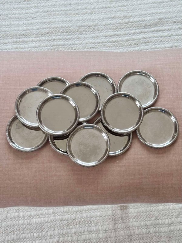 A dozen useful Mid 20th Century Italian silver plated coasters or small plates, Circa 1960/70s. These versatile vintage coasters are perfect for drinks or tiny eats. With patina to the silver plating commensurate with age and use.