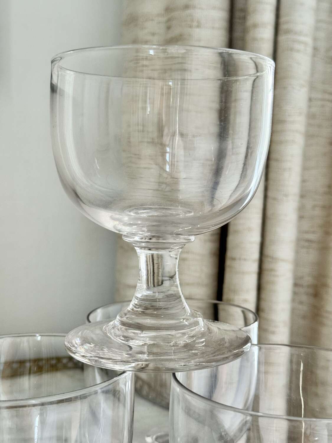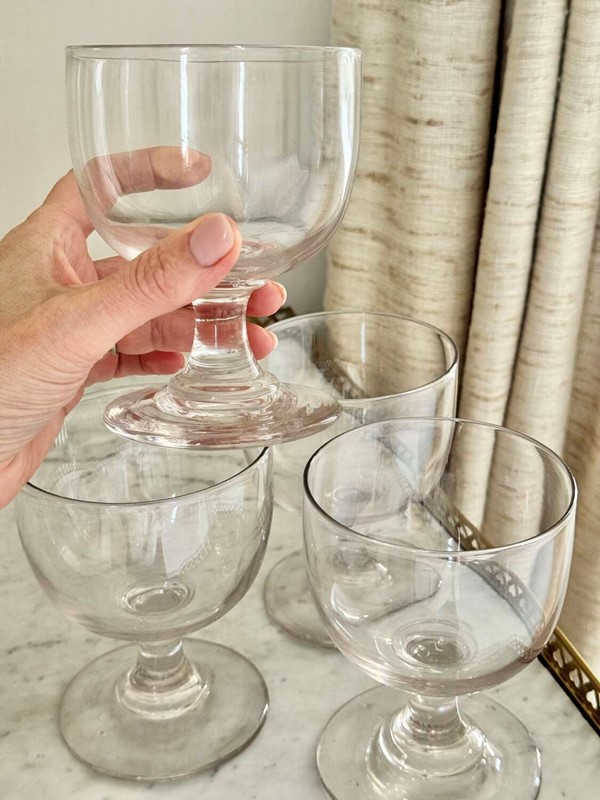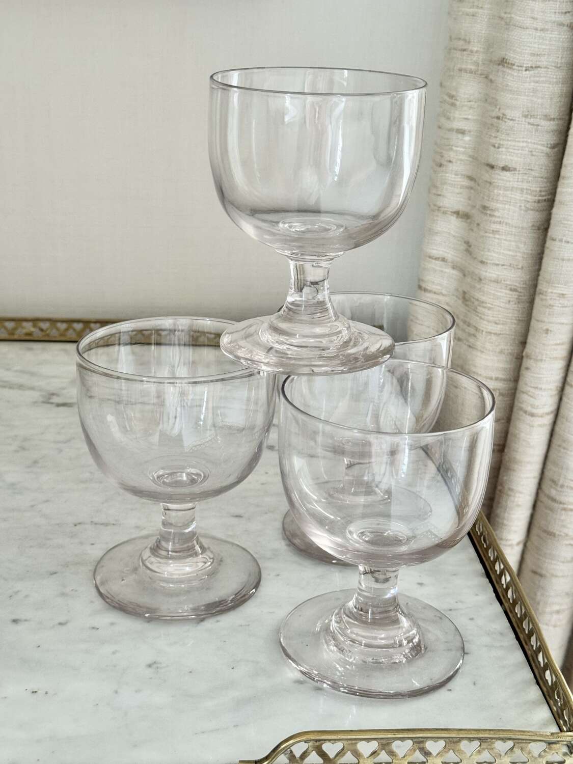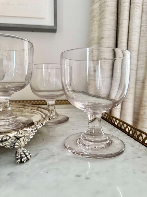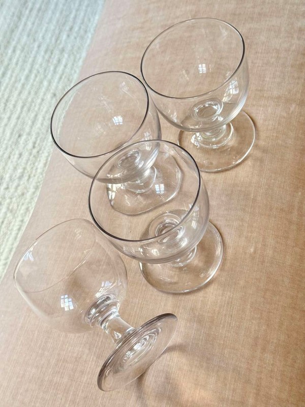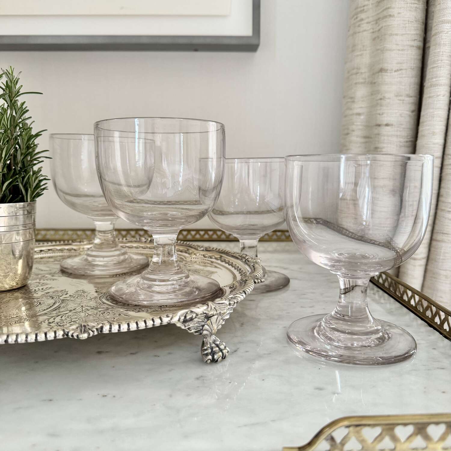 A sensational set of four English Georgian glass Rummers, Circa 1830. Each large goblet glass has been hand crafted and includes a generous bowl, waisted stem leading to a flared base which has a polished pontil base. Includes naturalinclusions from the hand working of the glass as it was blown. Versatile, Rummers make splendid wine glasses or work well for cocktails or G&T or water.