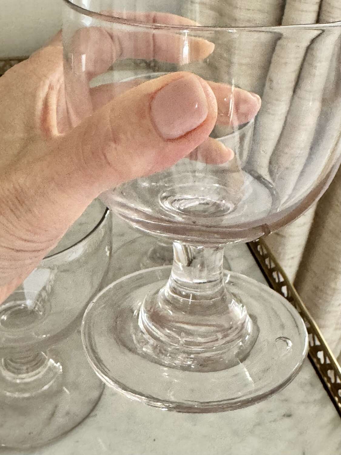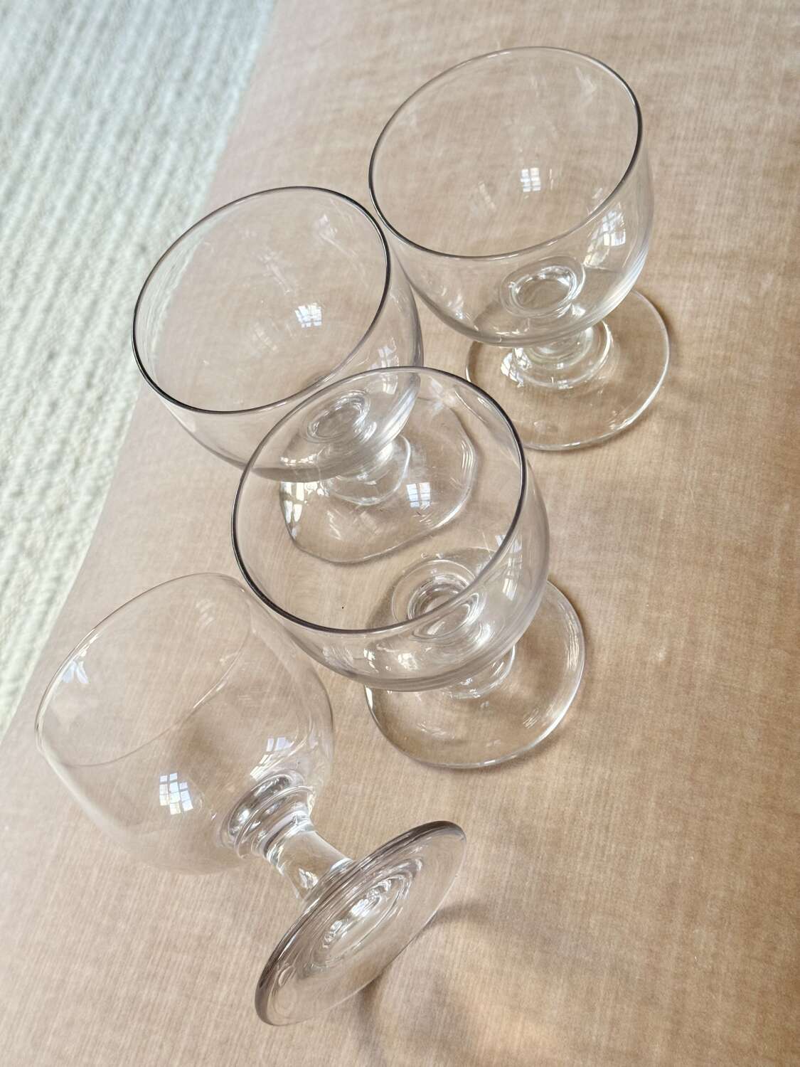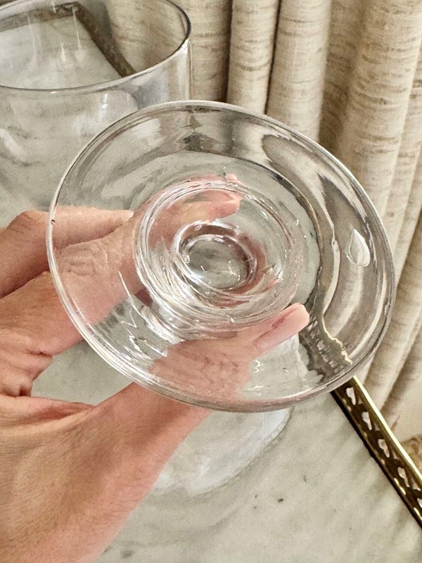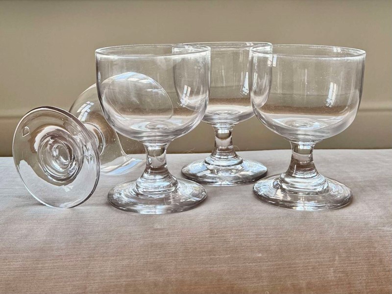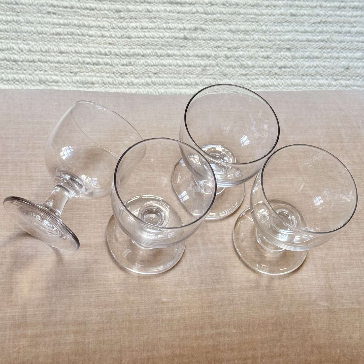 A sensational set of four English Georgian glass Rummers, Circa 1830. Each large goblet glass has been hand crafted and includes a generous bowl, waisted stem leading to a flared base which has a polished pontil base. Includes naturalinclusions from the hand working of the glass as it was blown. Versatile, Rummers make splendid wine glasses or work well for cocktails or G&T or water.