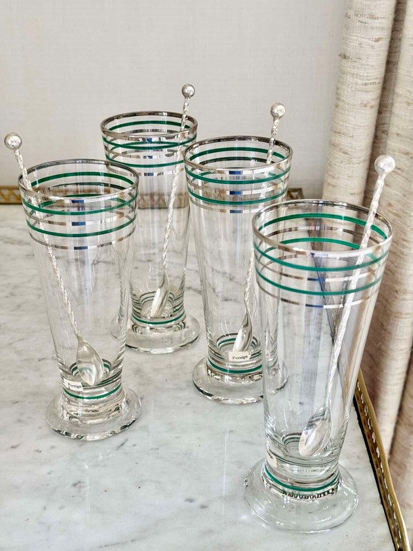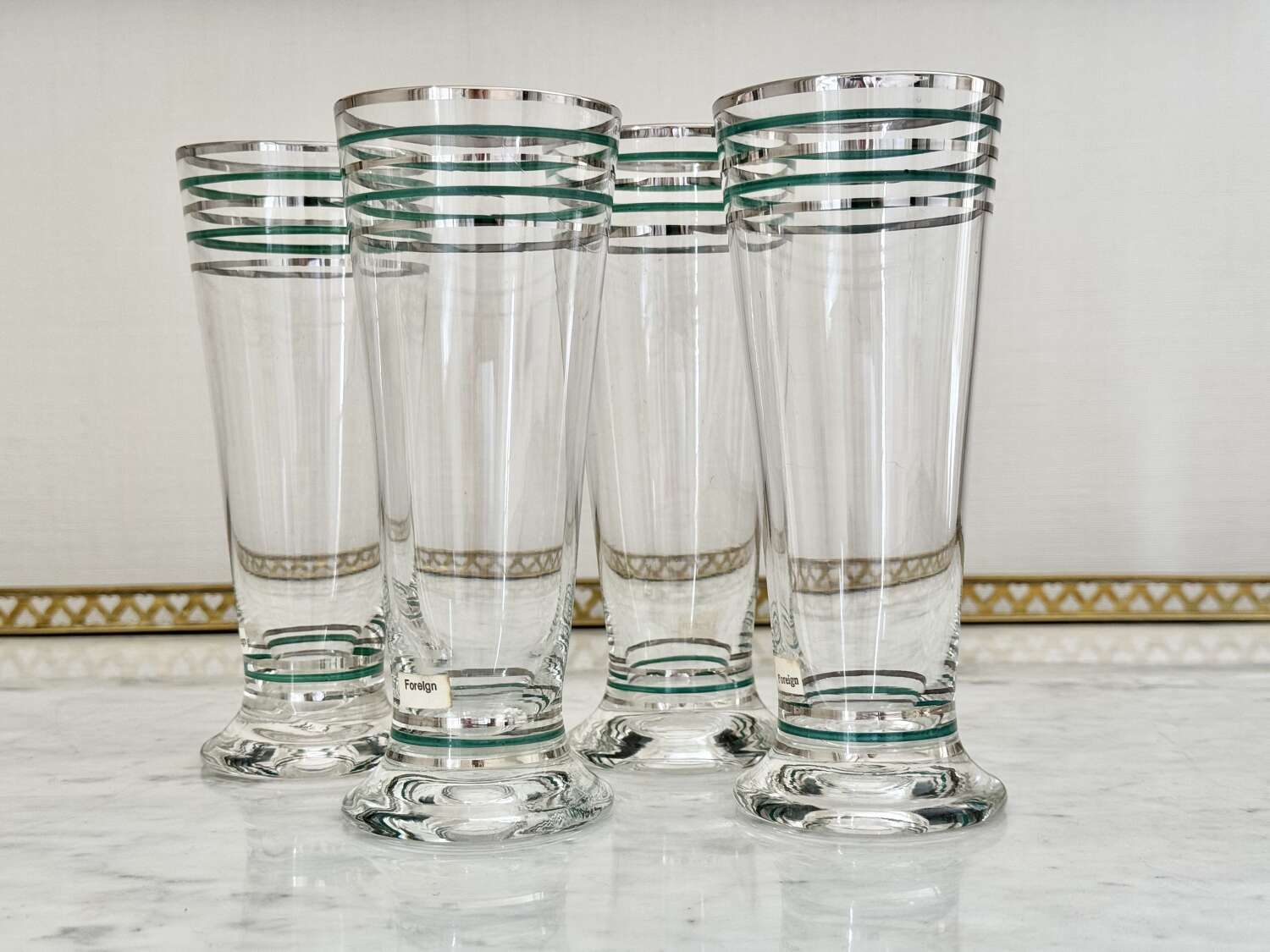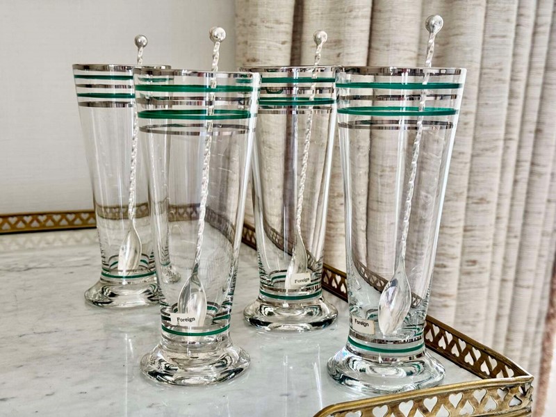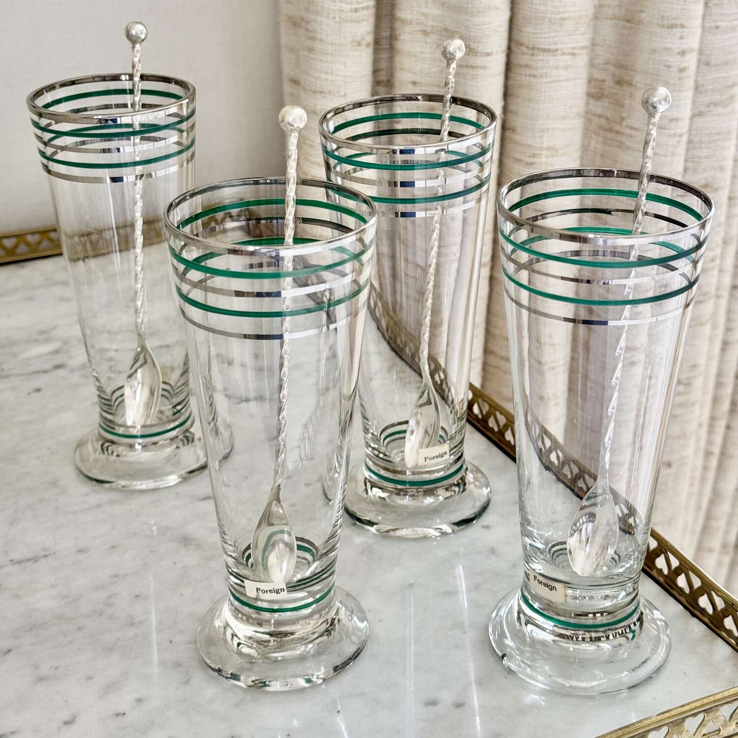 Four fabulous 1950s green enamel and silver ringed tall Pilsner Ale glasses, perfect for long cocktails and other bar duties. Each tumbler has an original 'Foreign' identification sticker, most likely from Czechoslovakia. Shown with a set of Dutch silver spoons and other vintage barware available and listed separately.