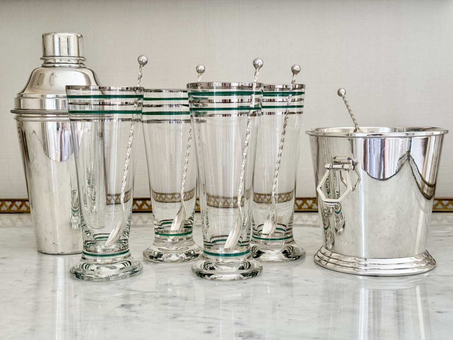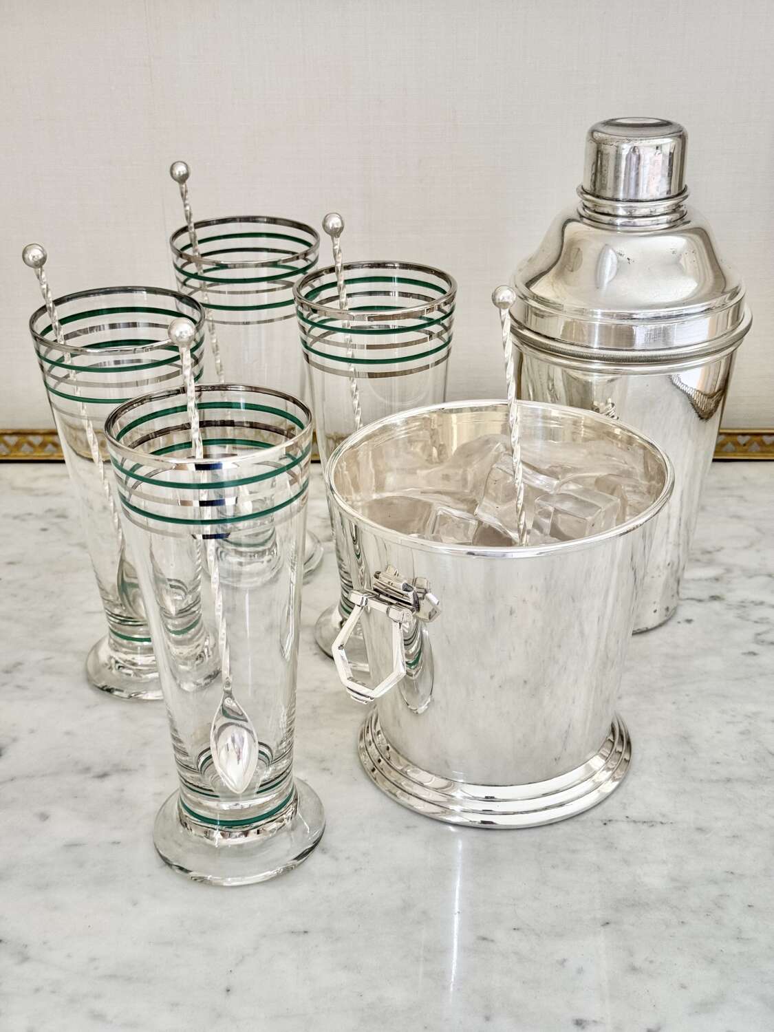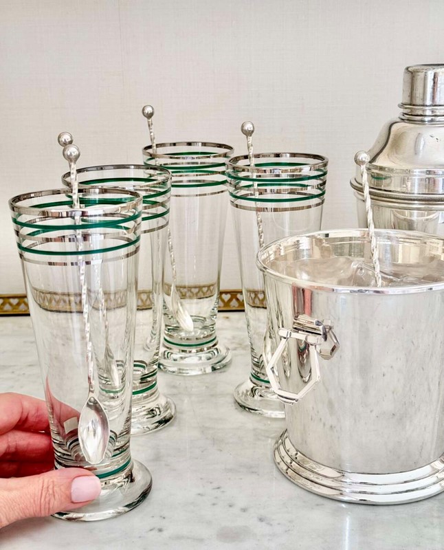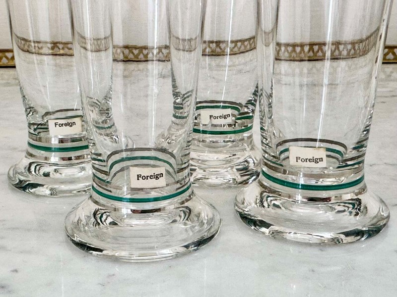 Four fabulous 1950s green enamel and silver ringed tall Pilsner Ale glasses, perfect for long cocktails and other bar duties. Each tumbler has an original 'Foreign' identification sticker, most likely from Czechoslovakia. Shown with a set of Dutch silver spoons and other vintage barware available and listed separately.