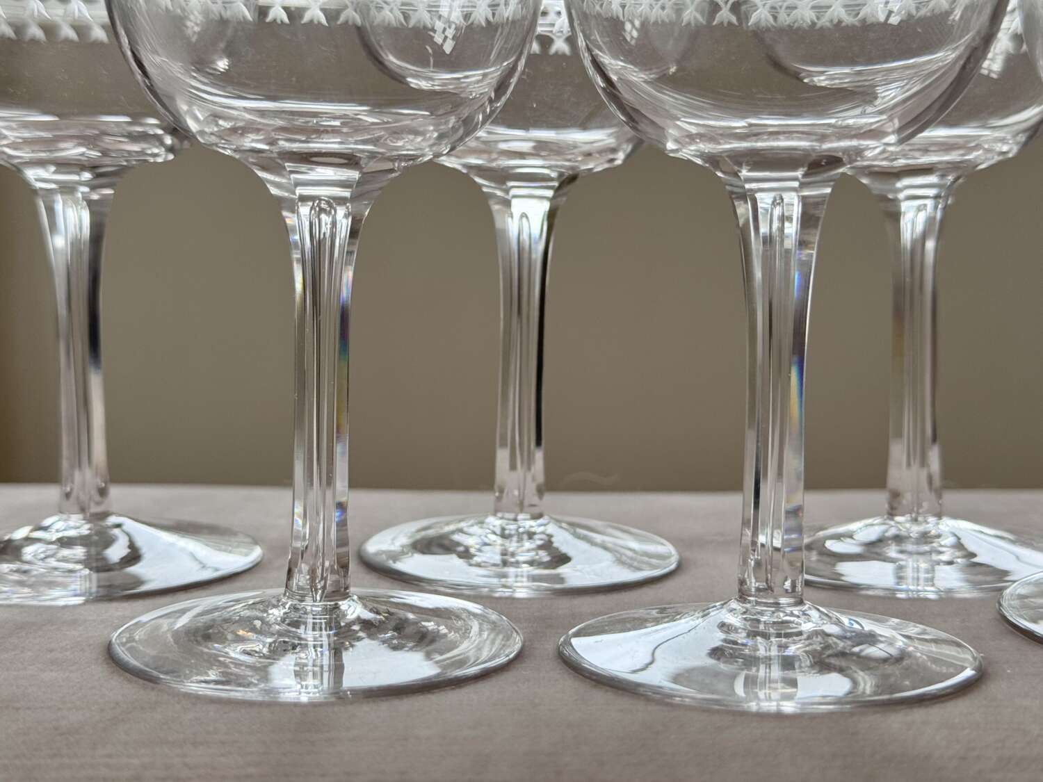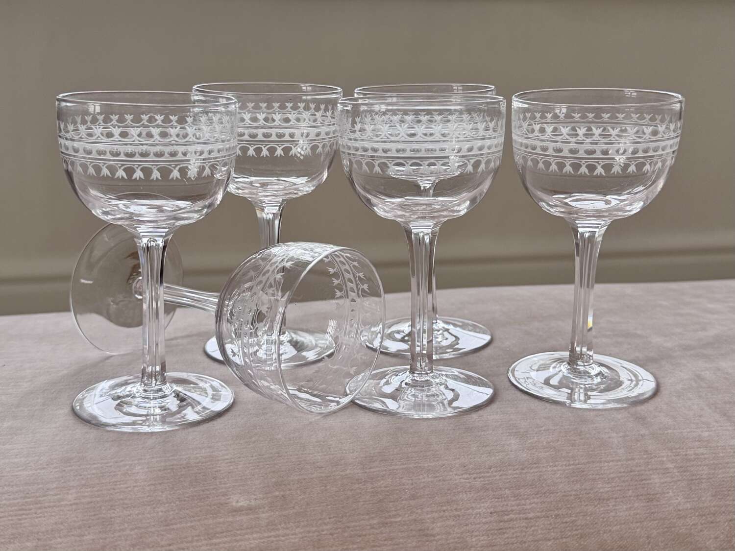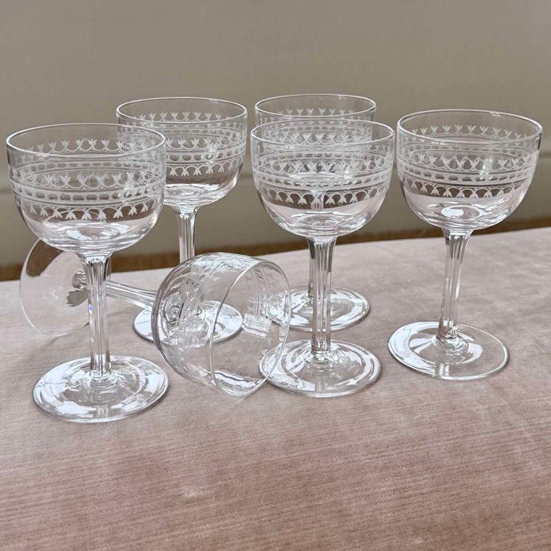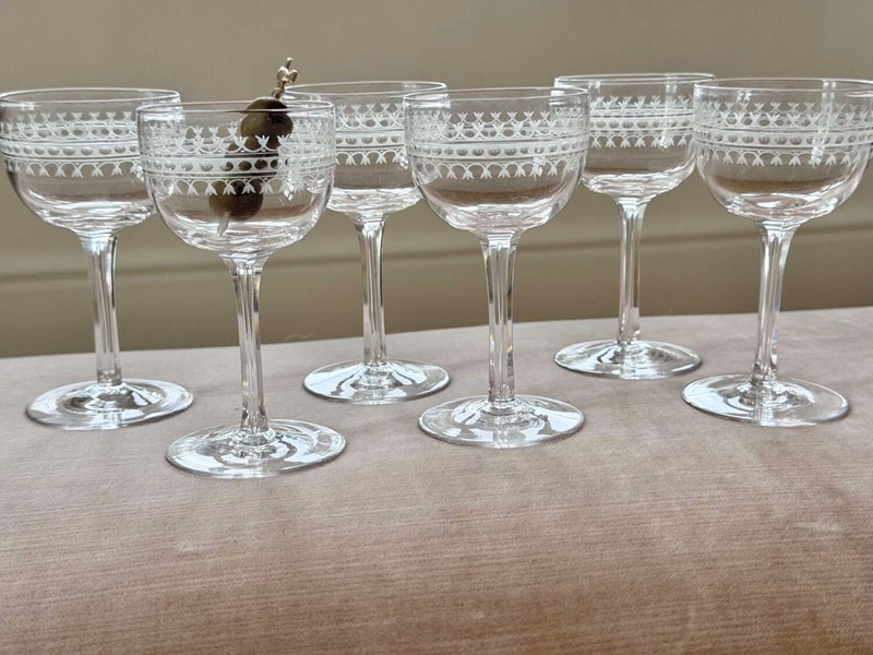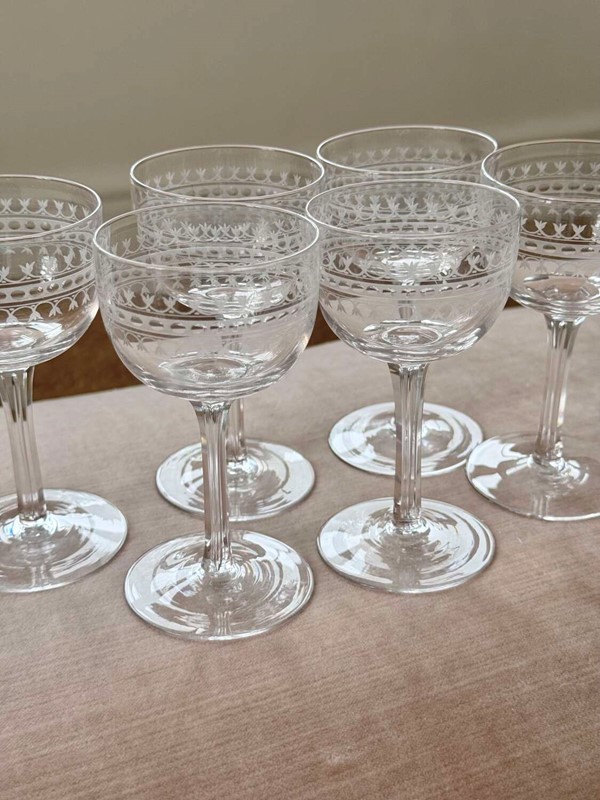 6 finest Edwardian hand etched crystal glasses C1900