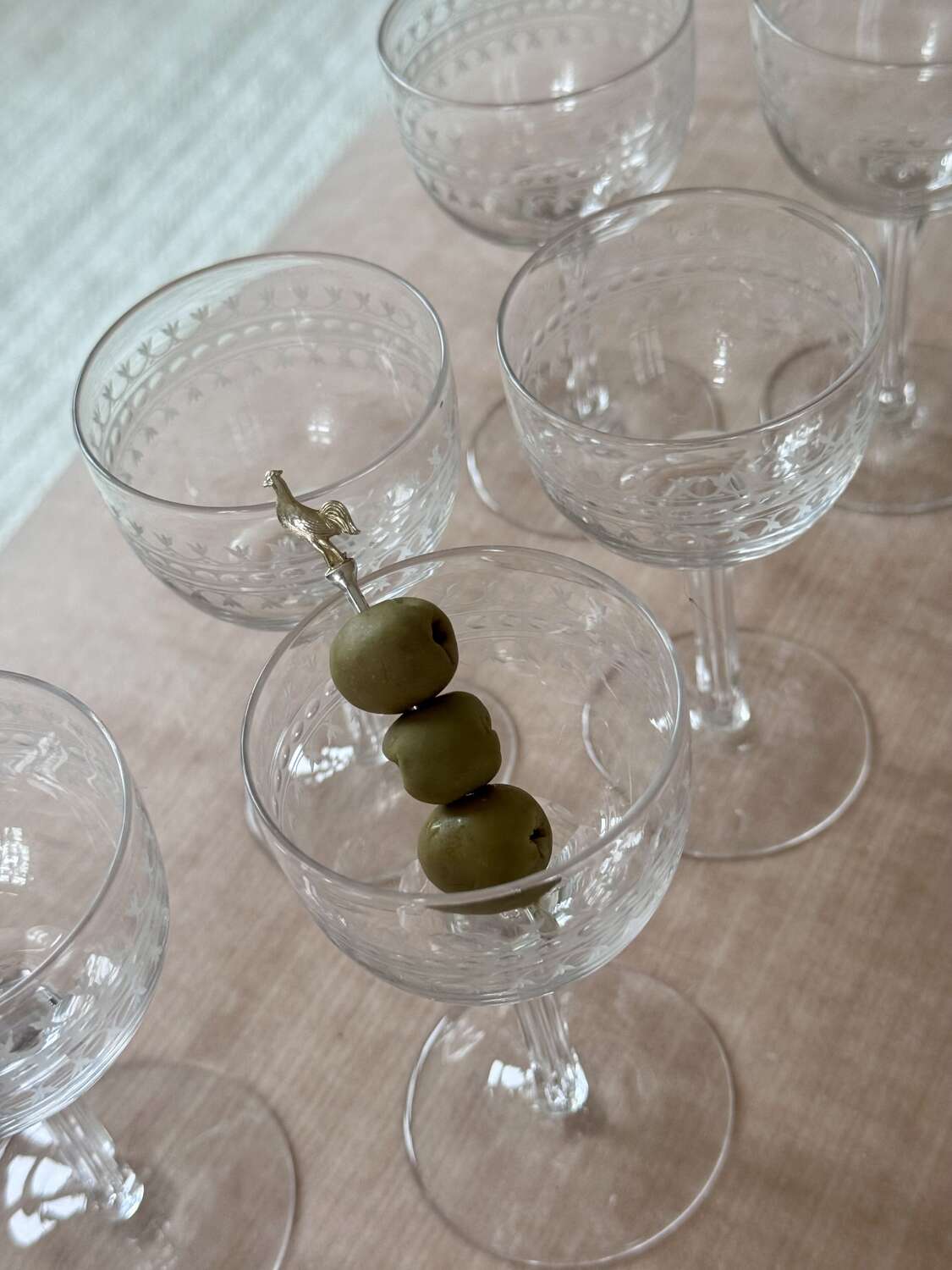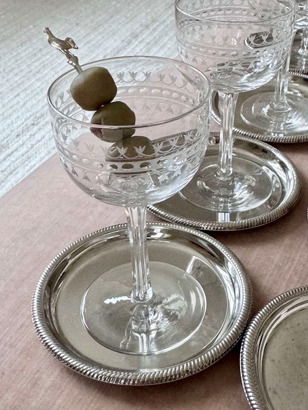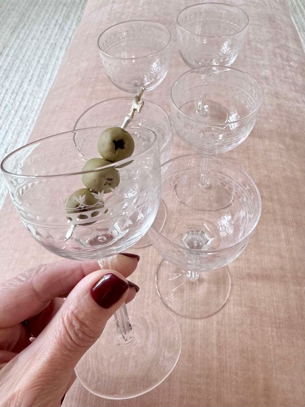 An exquisite set of six Edwardian hand etched glasseswith carved stems which have individual, hand blown, elongated bubbles in them, Circa 1900. Superb quality, these versatile glasses have a max capacity of 80ml (a standard triple measure)and are perfect for short sharing cocktails such as Martini.