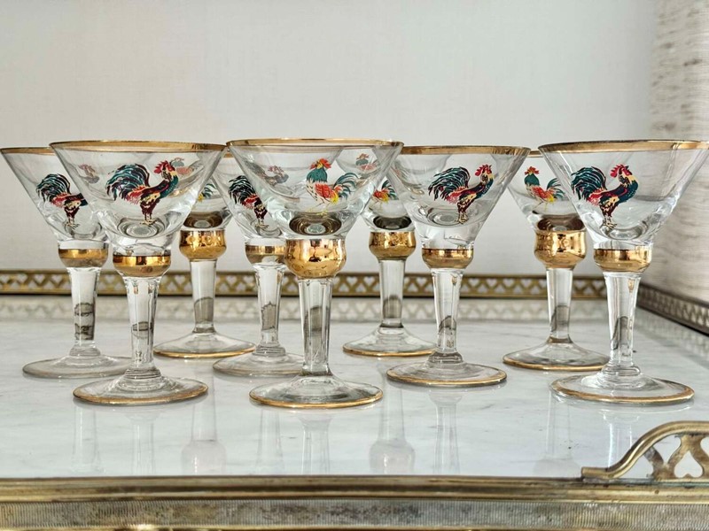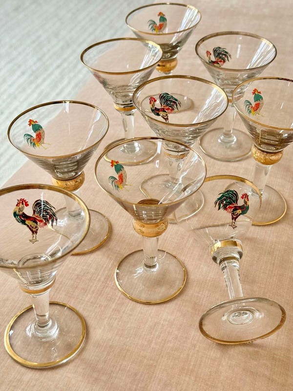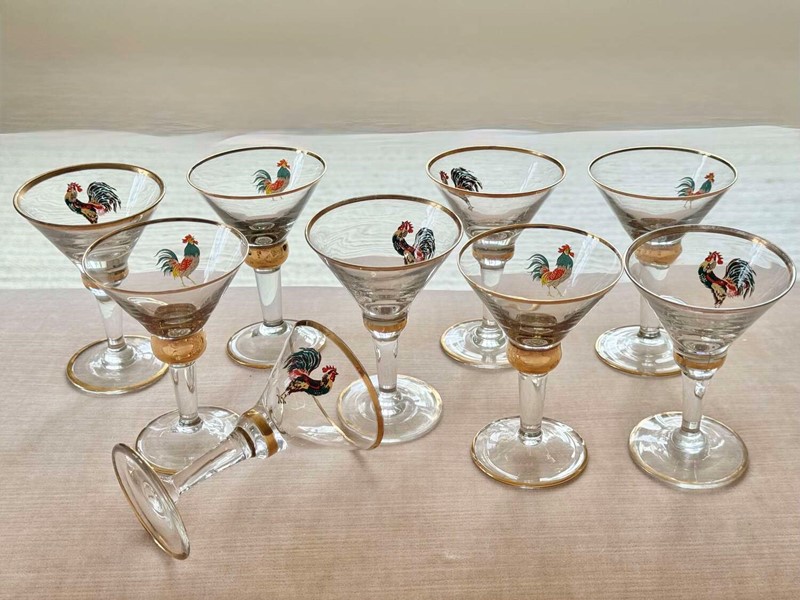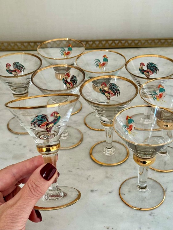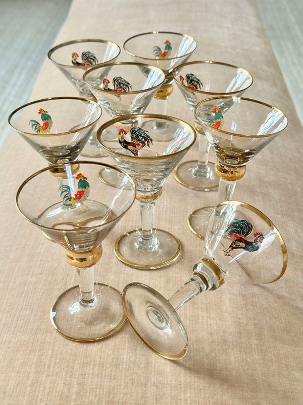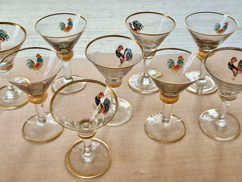 9 Art Deco Enamelled Cockerel Painted & Gold Rim Cocktail Glasses