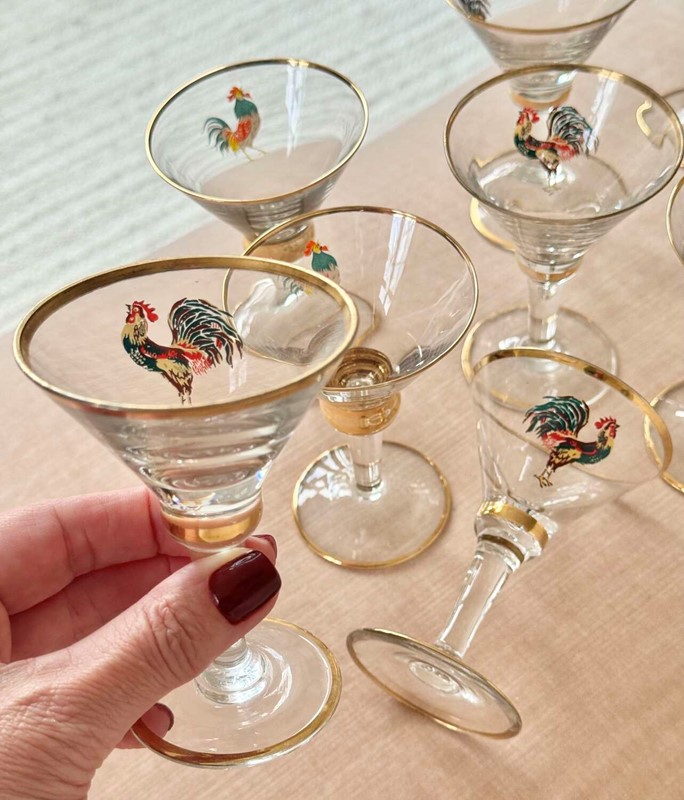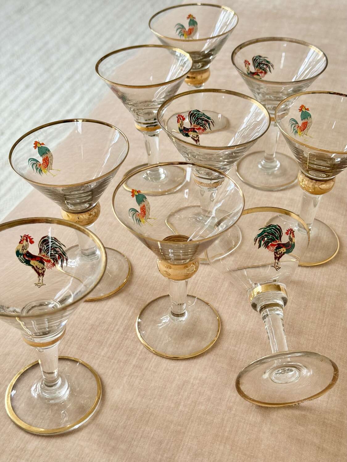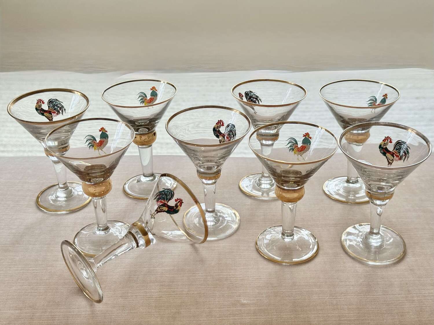 A splendid set of nine matched Art Deco gold rim cocktail glasses, Circa 1930s, with enamelled fine feathered crowing cockerels on each smart coupe. These are traditionally sized cocktail glasses which mean they are smaller than modern day Martini glasses, allowing each guest to have a taste rather than a full on hit. Great for sharing at the start of an evening with friends.