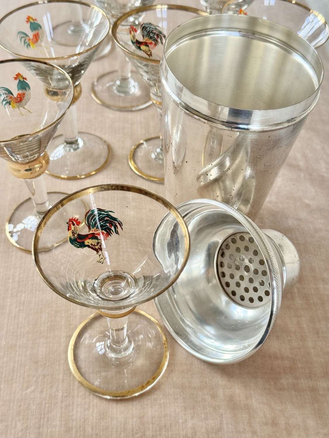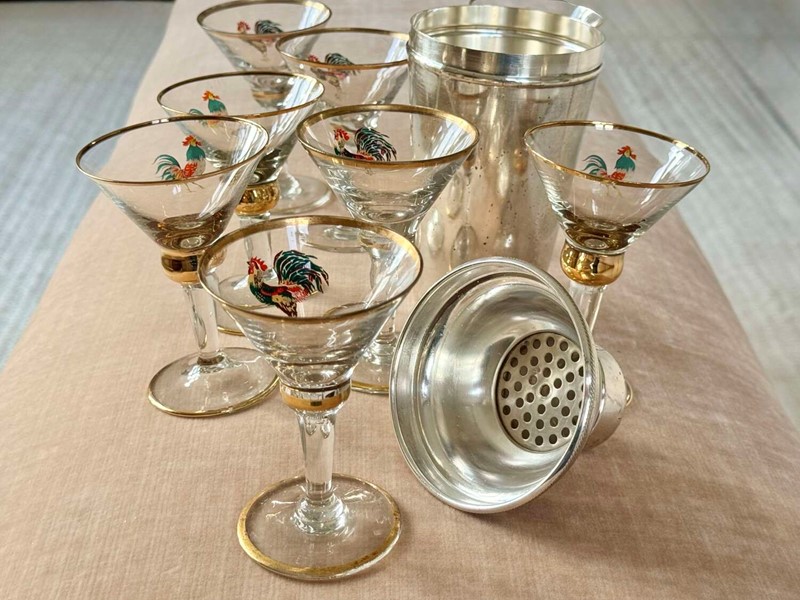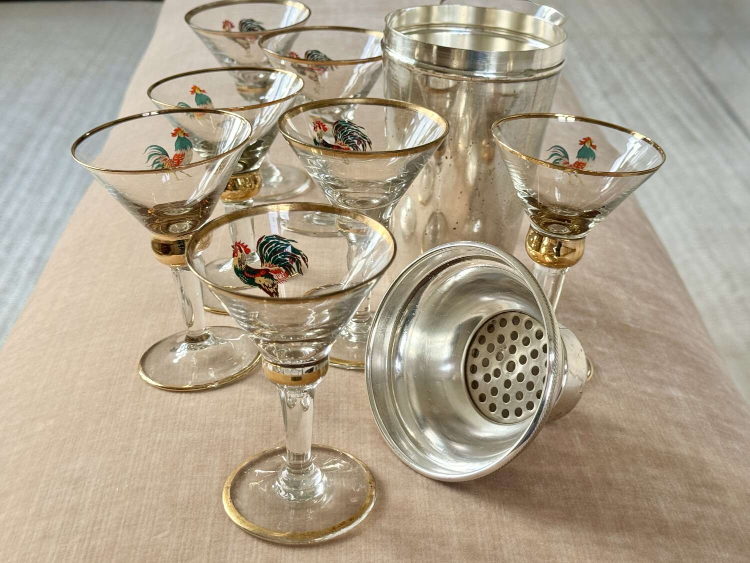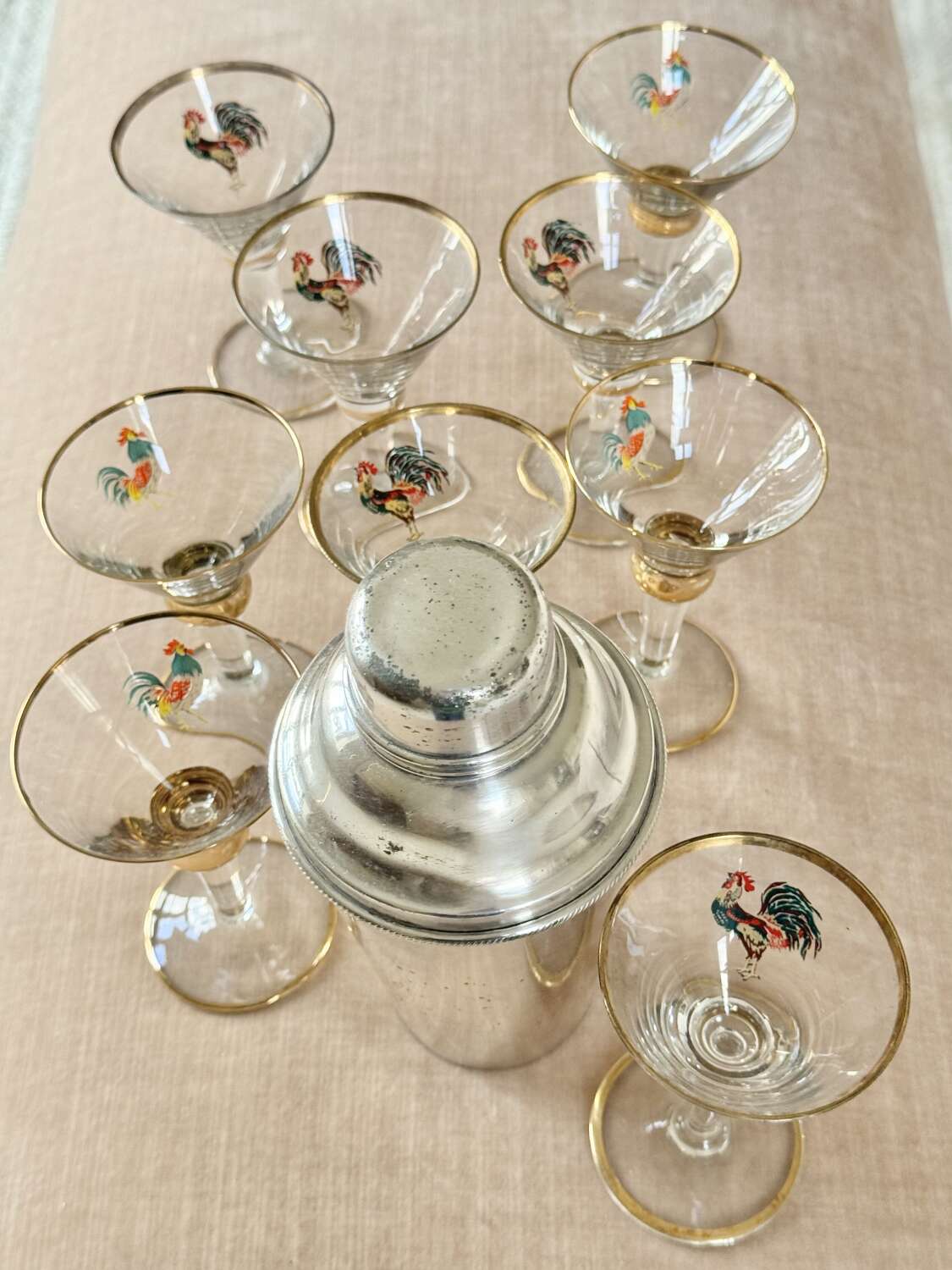A splendid set of nine matched Art Deco gold rim cocktail glasses, Circa 1930s, with enamelled fine feathered crowing cockerels on each smart coupe. These are traditionally sized cocktail glasses which mean they are smaller than modern day Martini glasses, allowing each guest to have a taste rather than a full on hit. Great for sharing at the start of an evening with friends.
