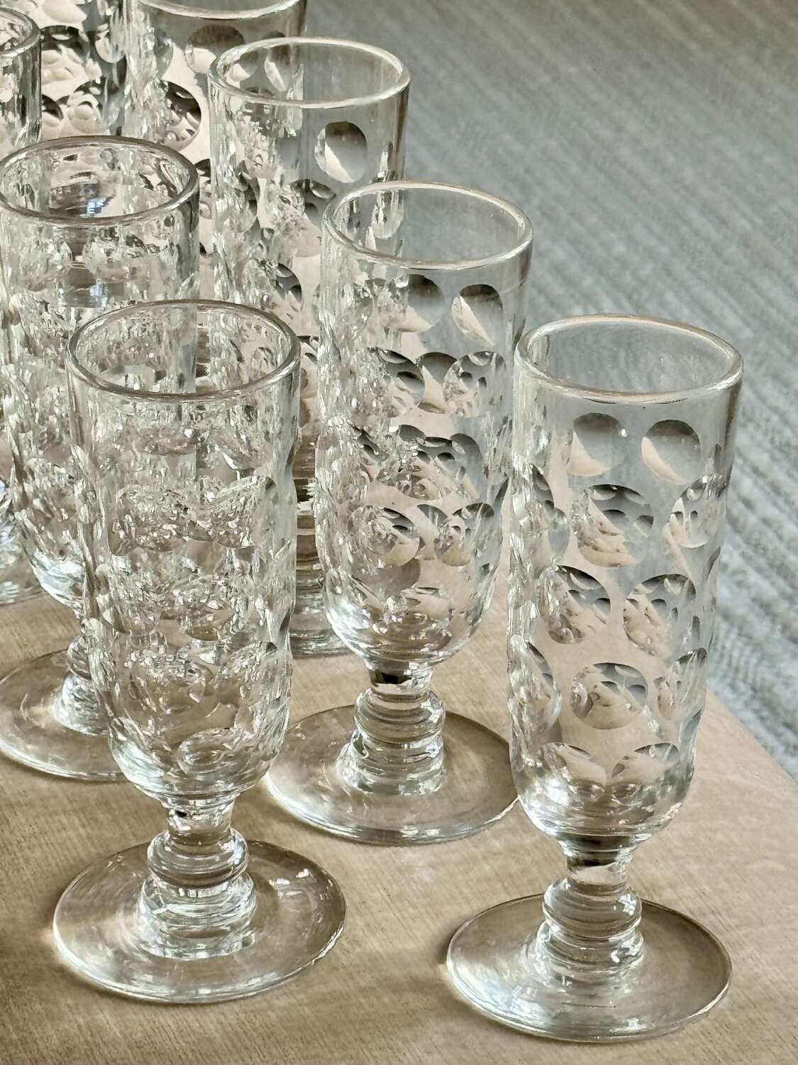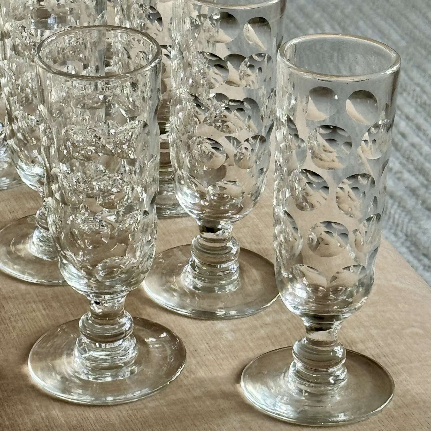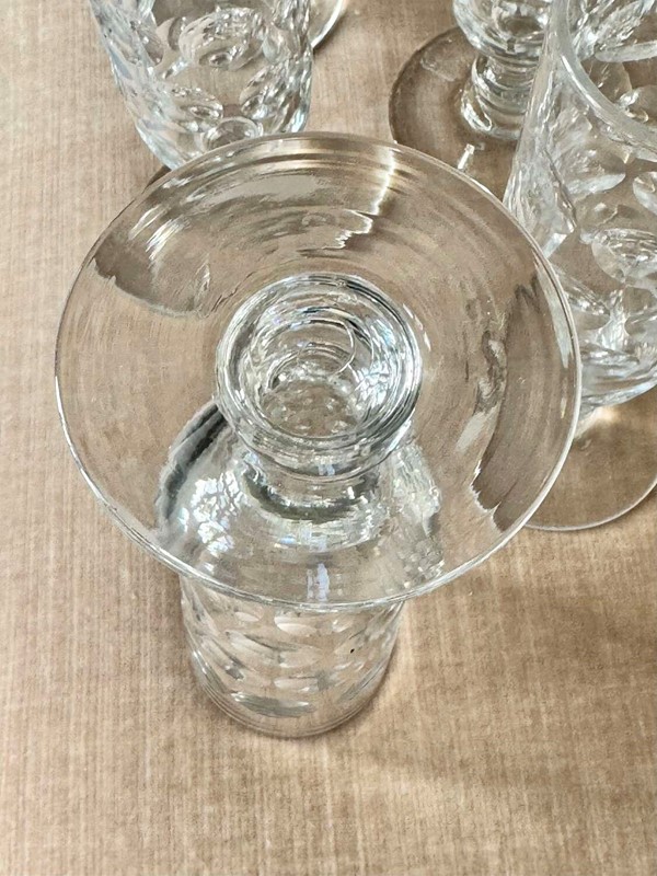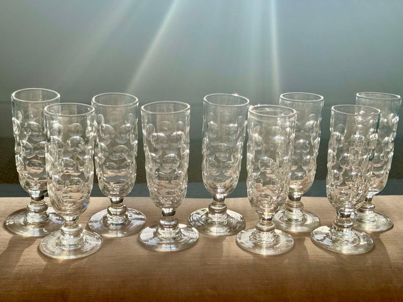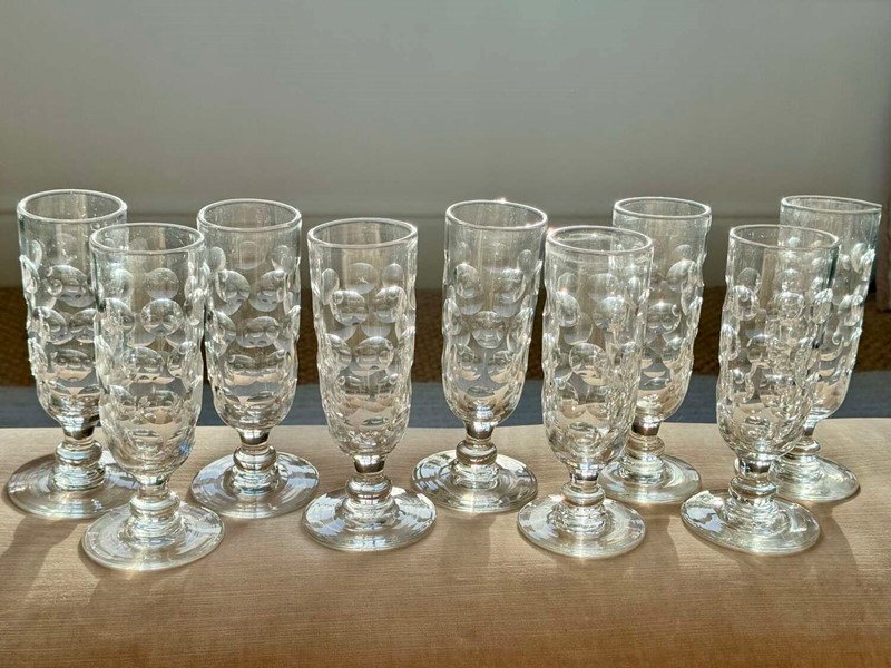 An excellentset of nine early Victorian, large scale, lens cut Ale glasses, Circa 1865.Outstanding quality, these substantially weighted tall glasses are versatile enough to work for Beer, as wine or water goblets or as very generous champagne flutes. Max capacity 335ml. These are hand blown glasses from the 19th Century, with snapped and polished pontils, baluster knop stems and hand cut lens shapped circles on the bowl. The glass is robustly thicker, since originally ale glasses. Still perfectly usable over 150 years after they were crafted they are statements for the dining table.
