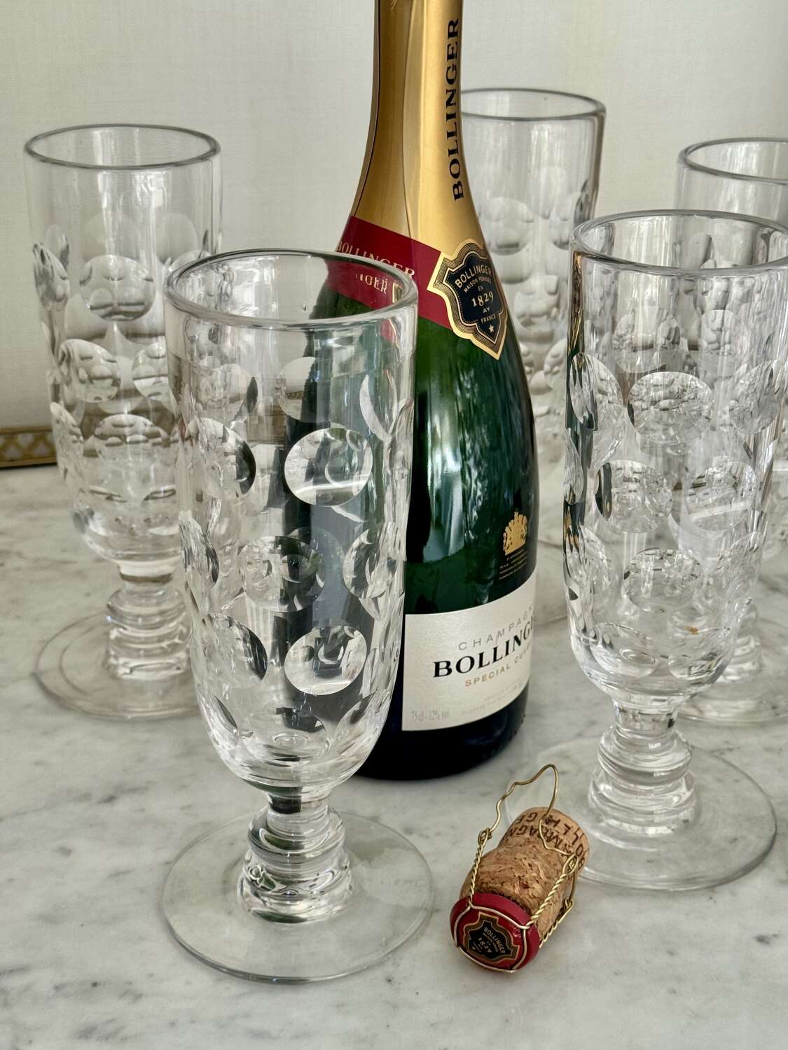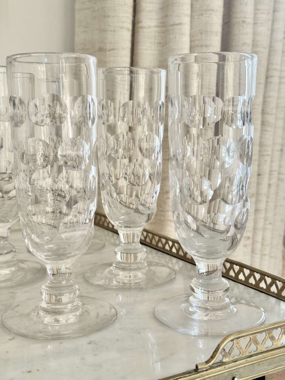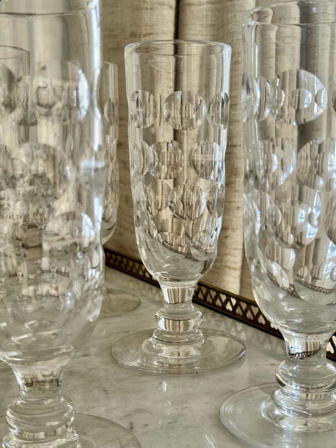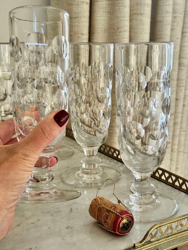 An excellentset of nine early Victorian, large scale, lens cut Ale glasses, Circa 1865.Outstanding quality, these substantially weighted tall glasses are versatile enough to work for Beer, as wine or water goblets or as very generous champagne flutes. Max capacity 335ml. These are hand blown glasses from the 19th Century, with snapped and polished pontils, baluster knop stems and hand cut lens shapped circles on the bowl. The glass is robustly thicker, since originally ale glasses. Still perfectly usable over 150 years after they were crafted they are statements for the dining table.