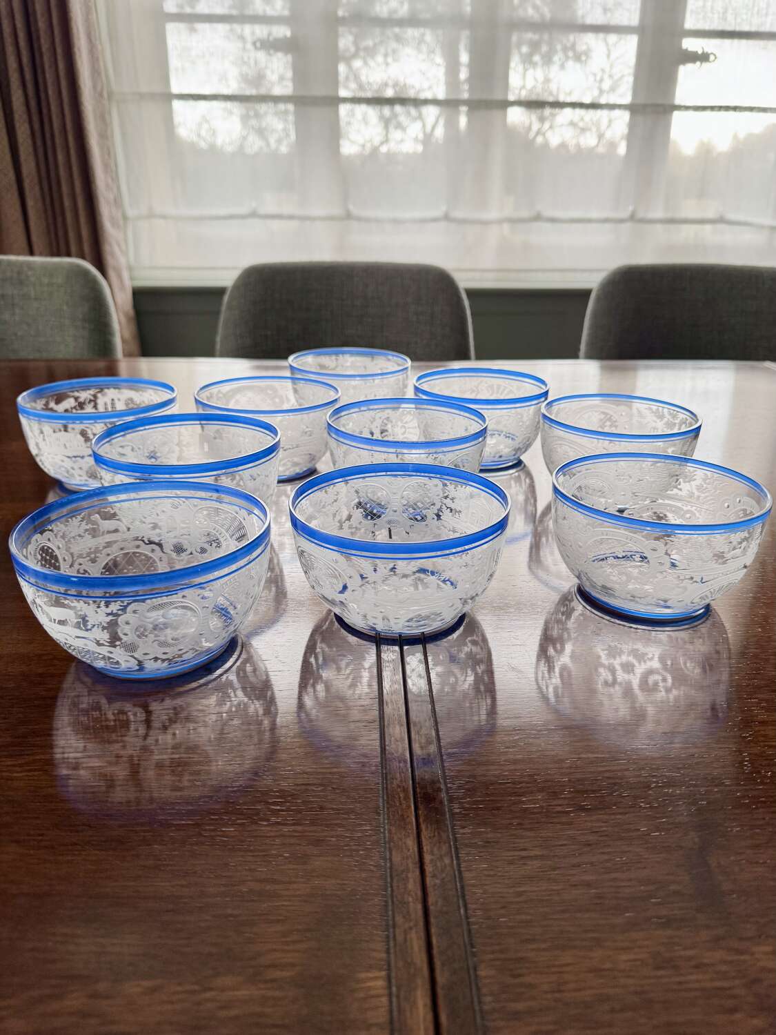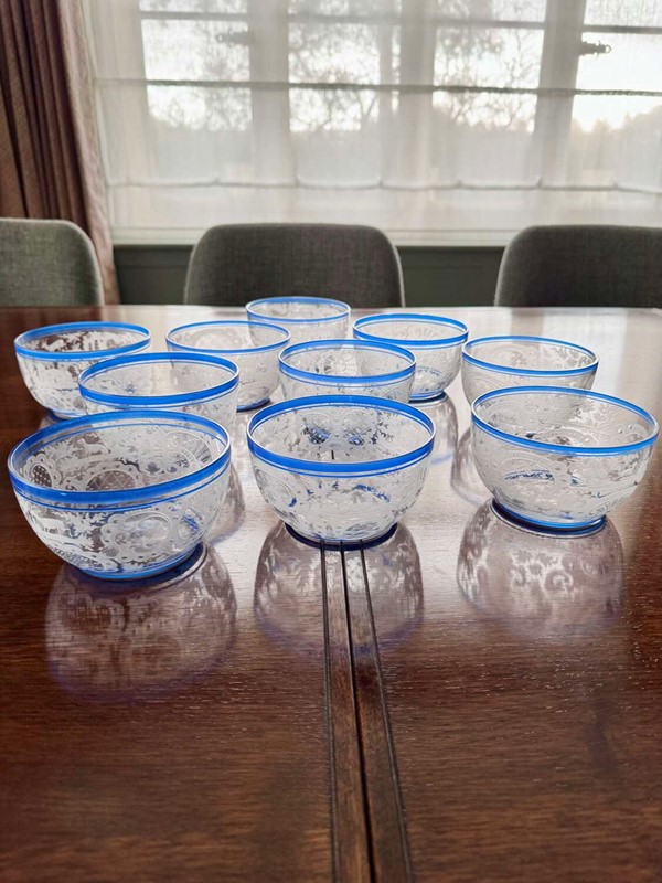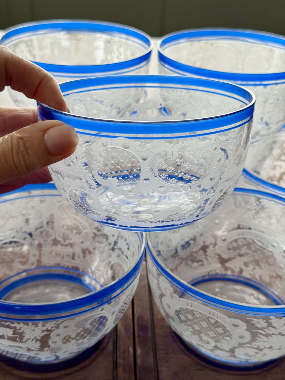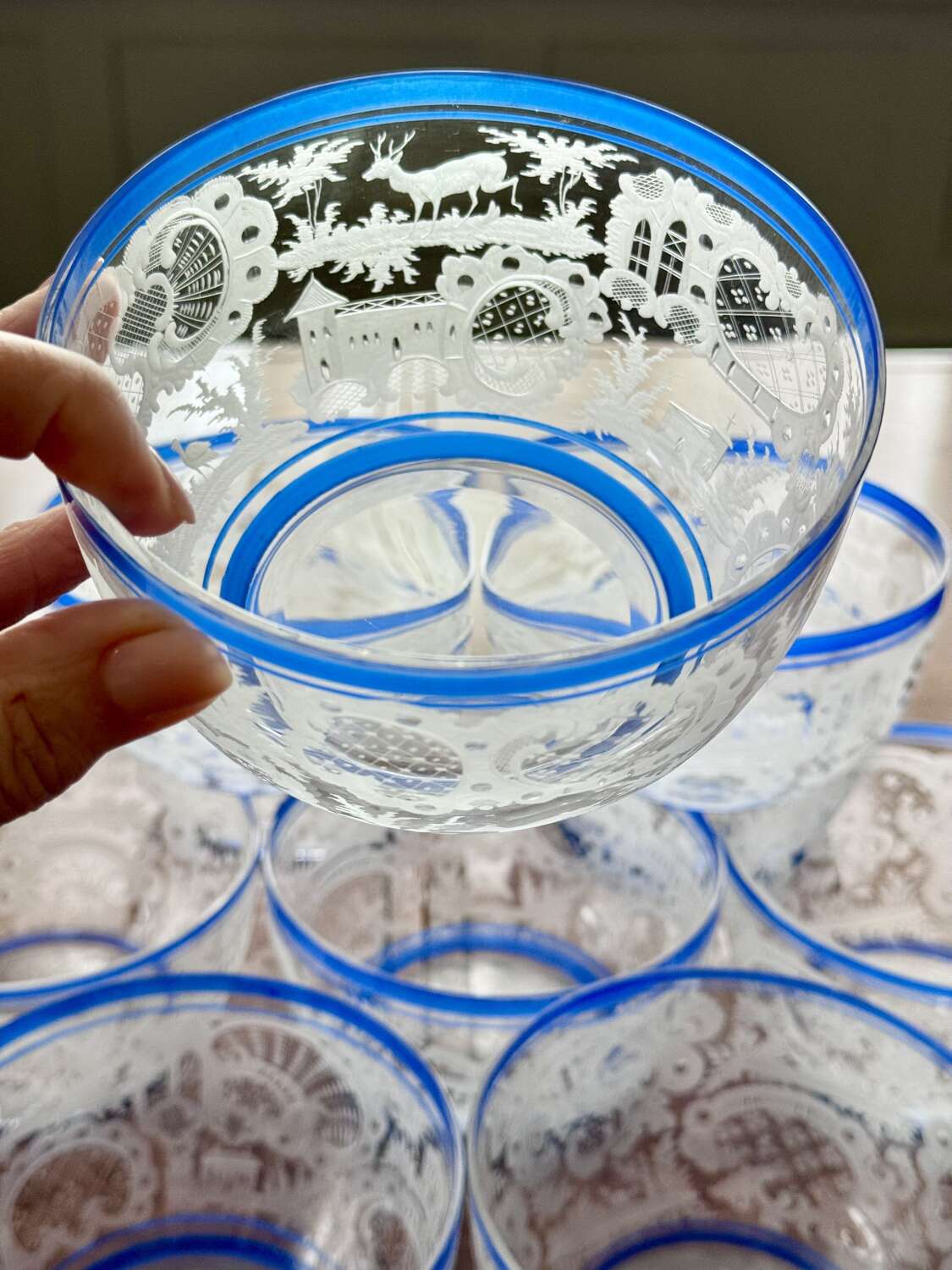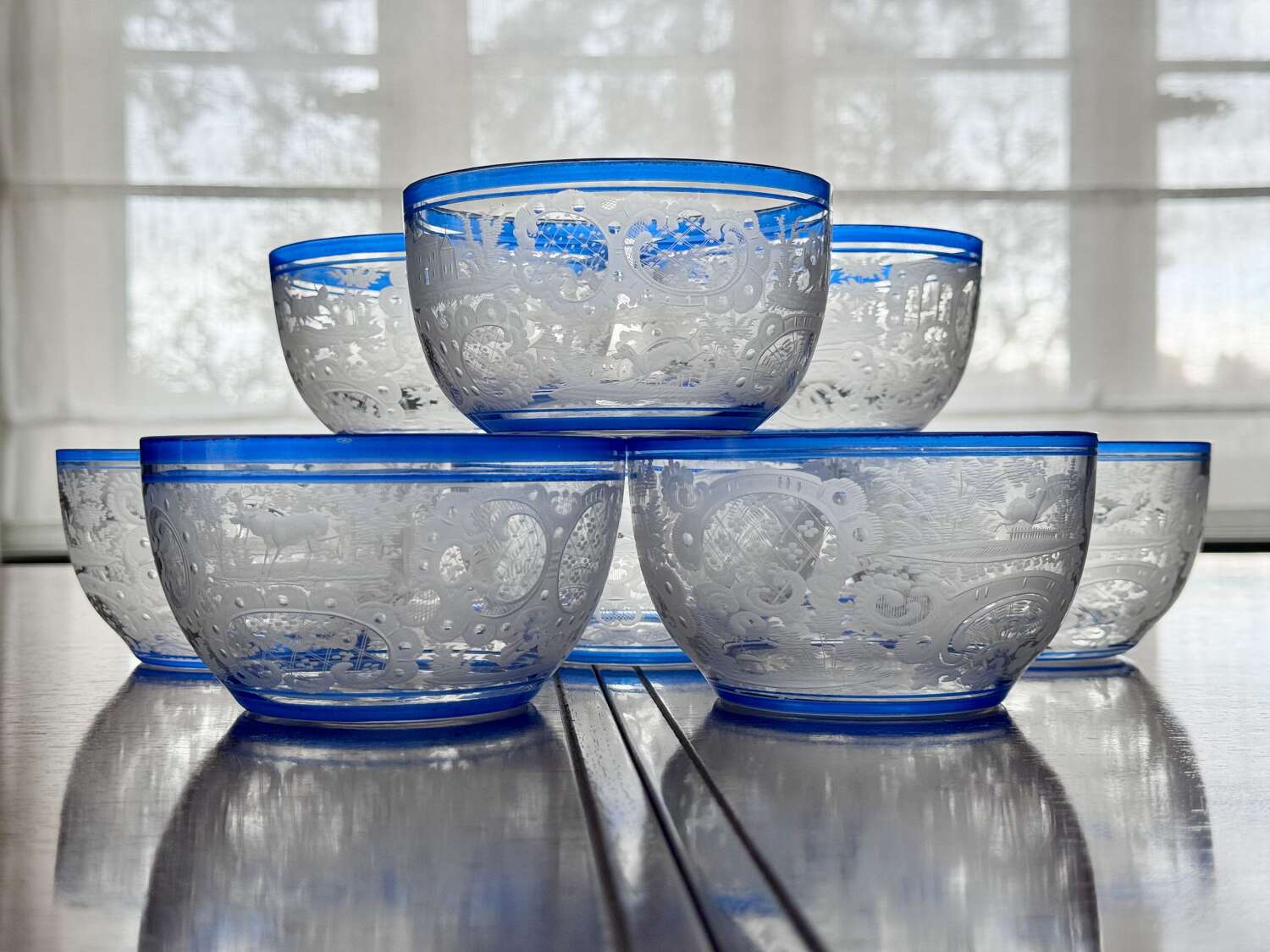 An outstanding set of a ten Art Deco Bohemian wheel etched glass bowls hand applied blue enamel rims, Circa 1920s. Each superb bowl been hand crafted, with individually engraved scrolled patterns and charming forest scenes including Stags, Pagodas and birds. Generous in size, these bowls are perfect for the dining table All in all, a splendid and rare set.