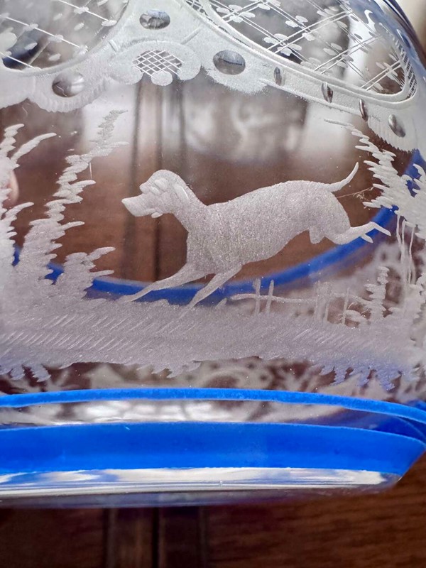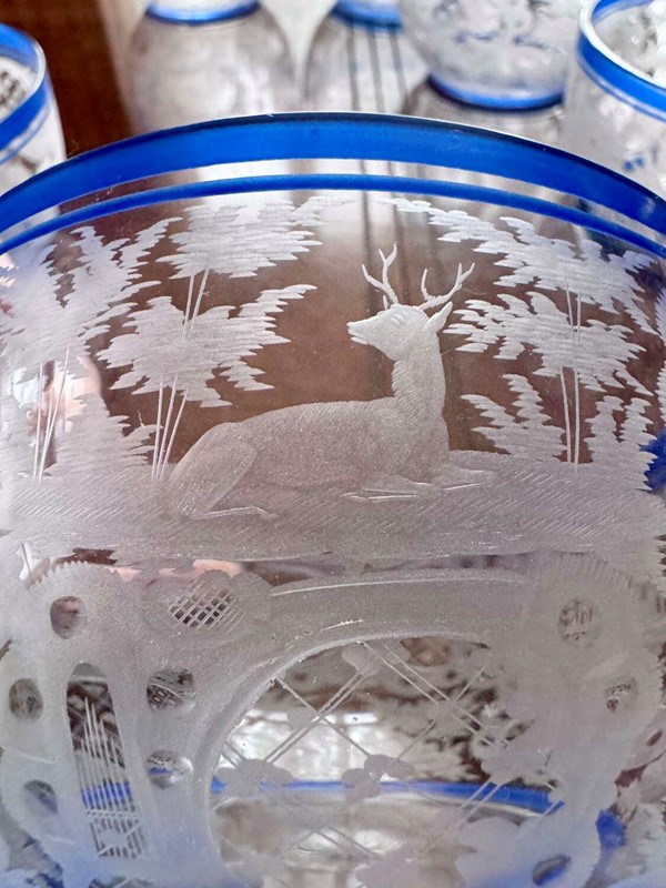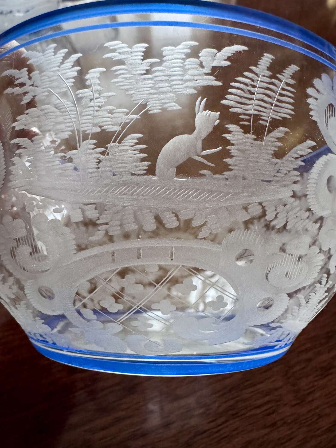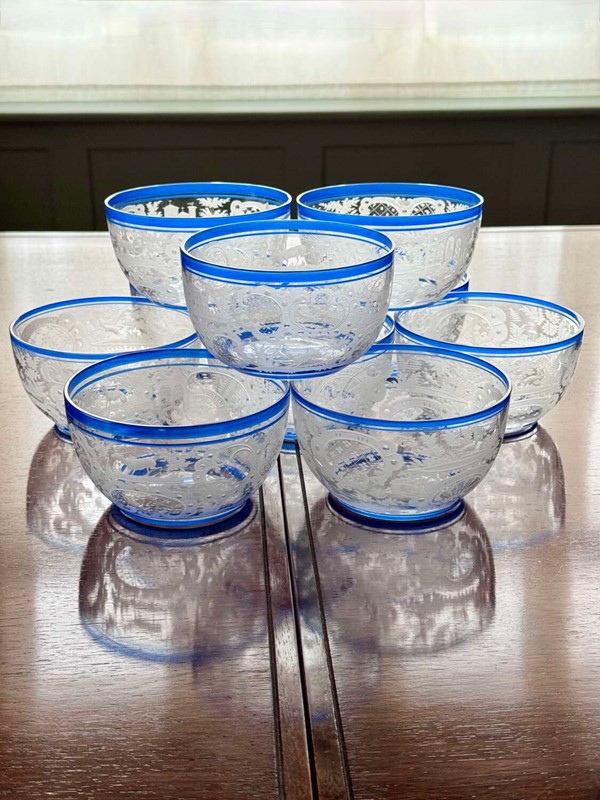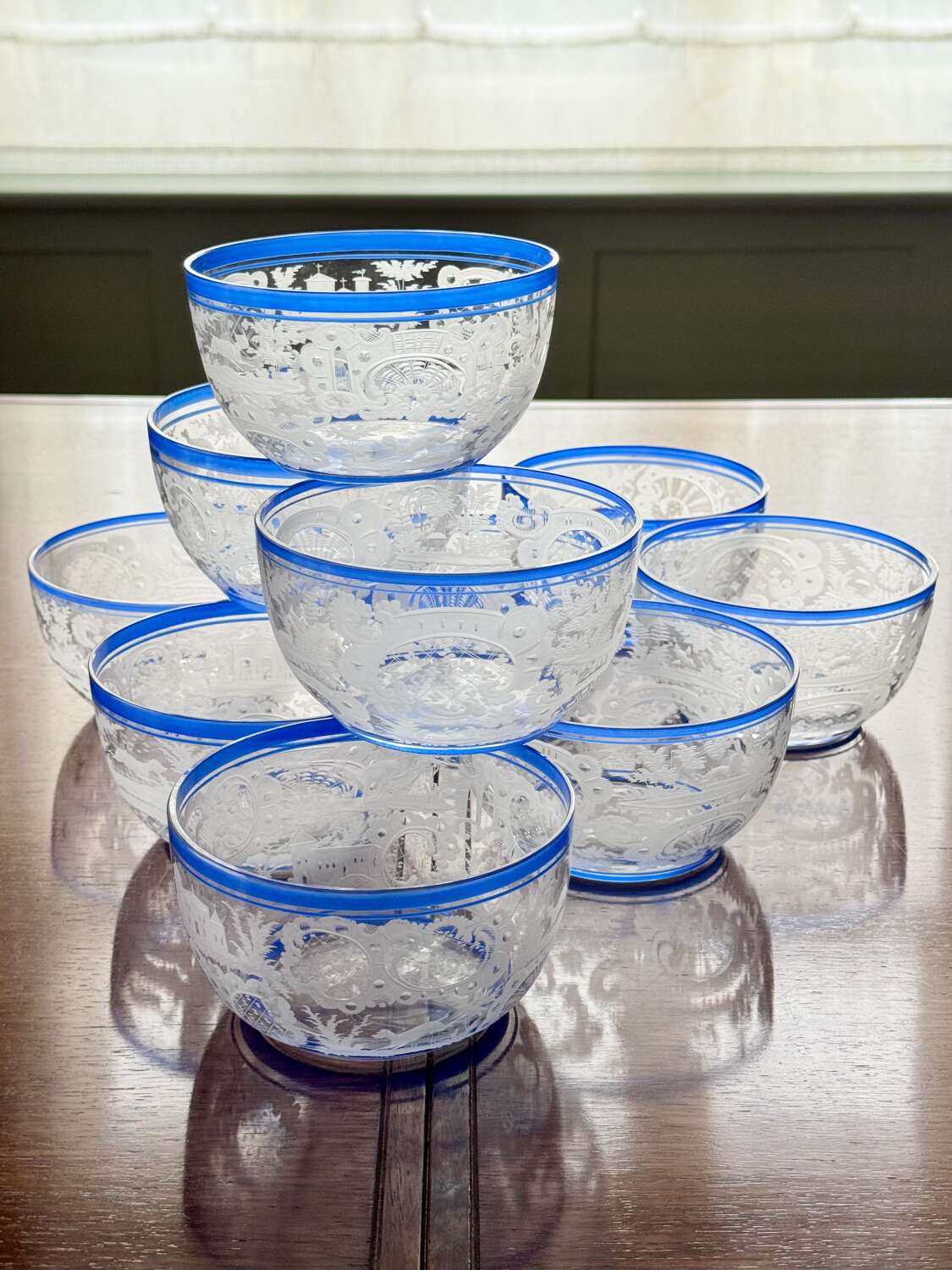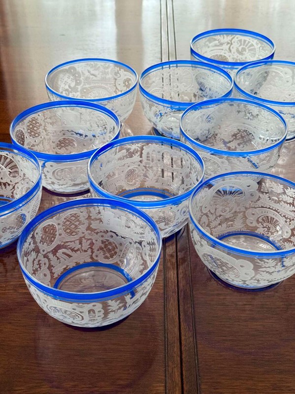 An outstanding set of a ten Art Deco Bohemian wheel etched glass bowls hand applied blue enamel rims, Circa 1920s. Each superb bowl been hand crafted, with individually engraved scrolled patterns and charming forest scenes including Stags, Pagodas and birds. Generous in size, these bowls are perfect for the dining table All in all, a splendid and rare set.
