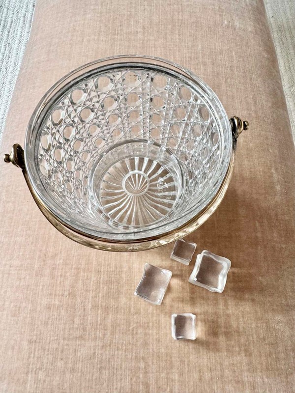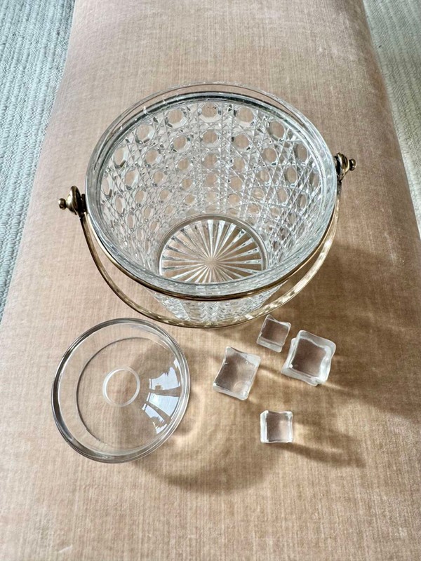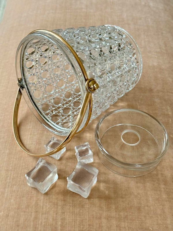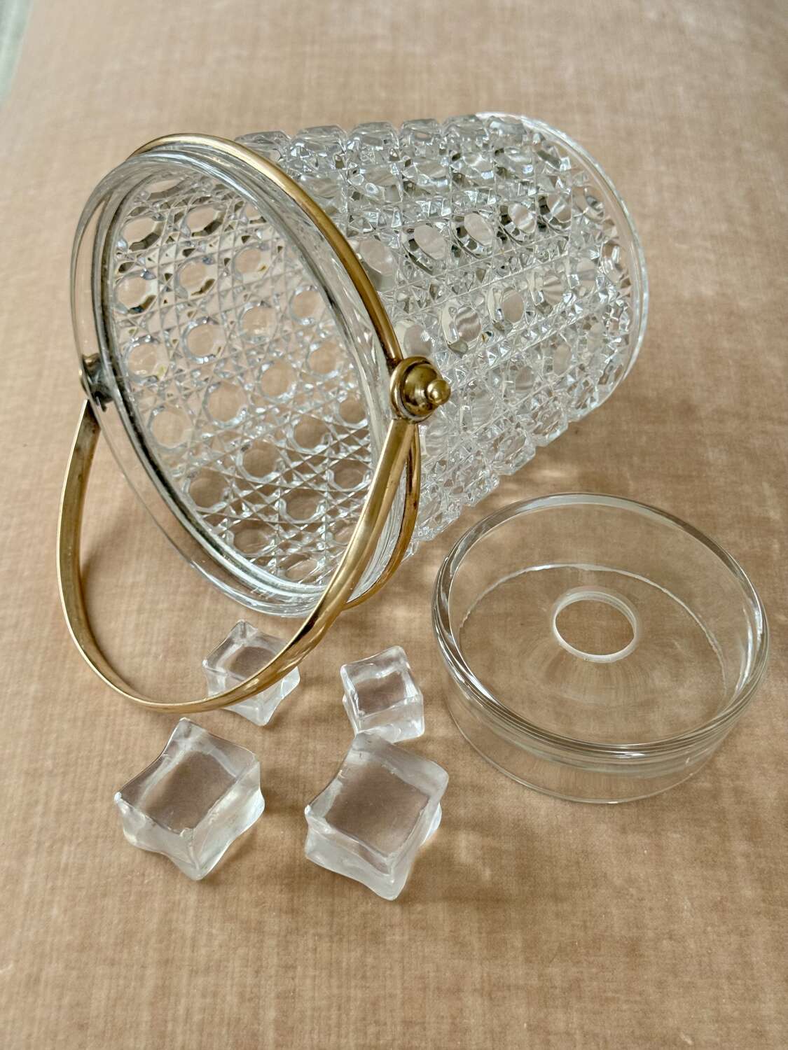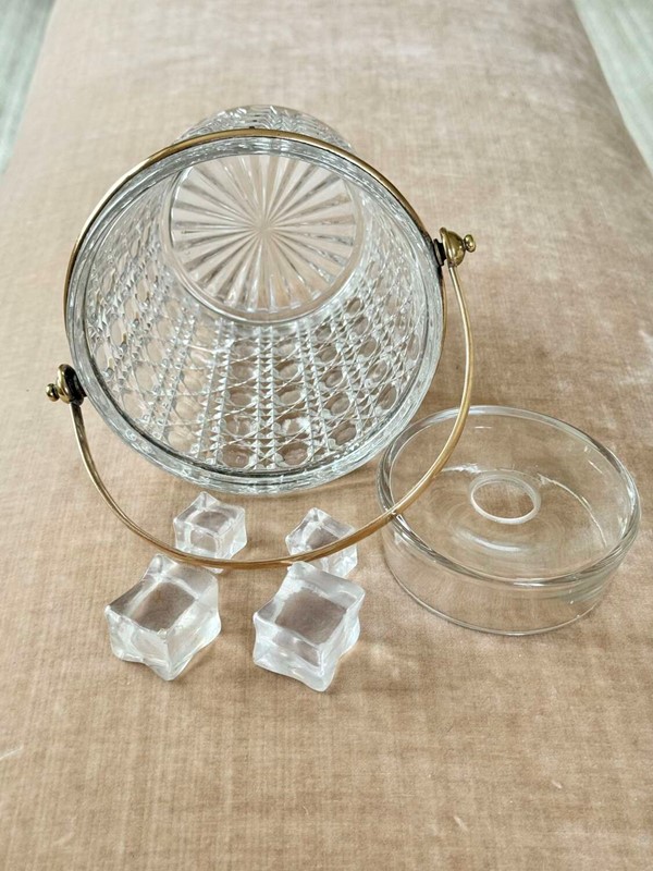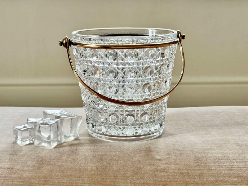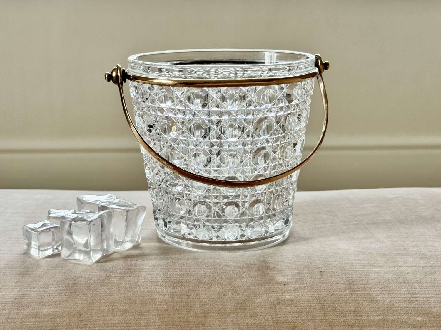 A rare and very pretty Baccarat, France cut glass ice bucket with gilt swing handle and mount and removable glass ice melt tray, Circa 1930s. Baccarat stamp to the base. Totally exquisite, this fine specimen makes a stunning addition to the home bar.