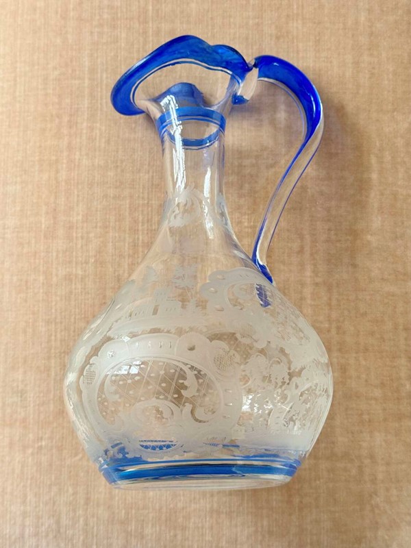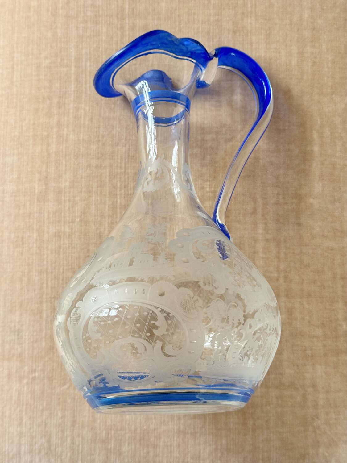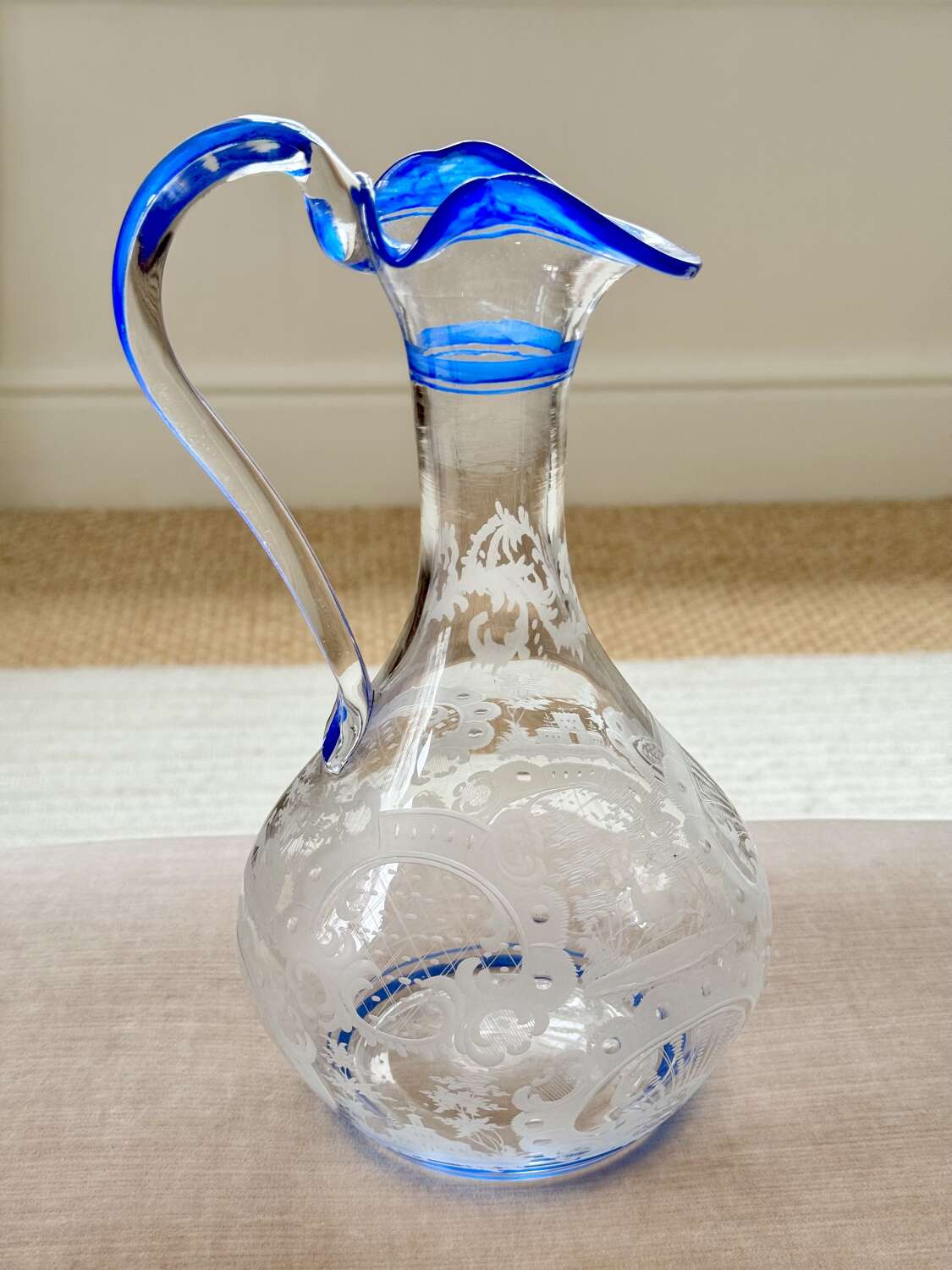 Art Deco Bohemian Etched Claret Jug With Blue Enamel Rims