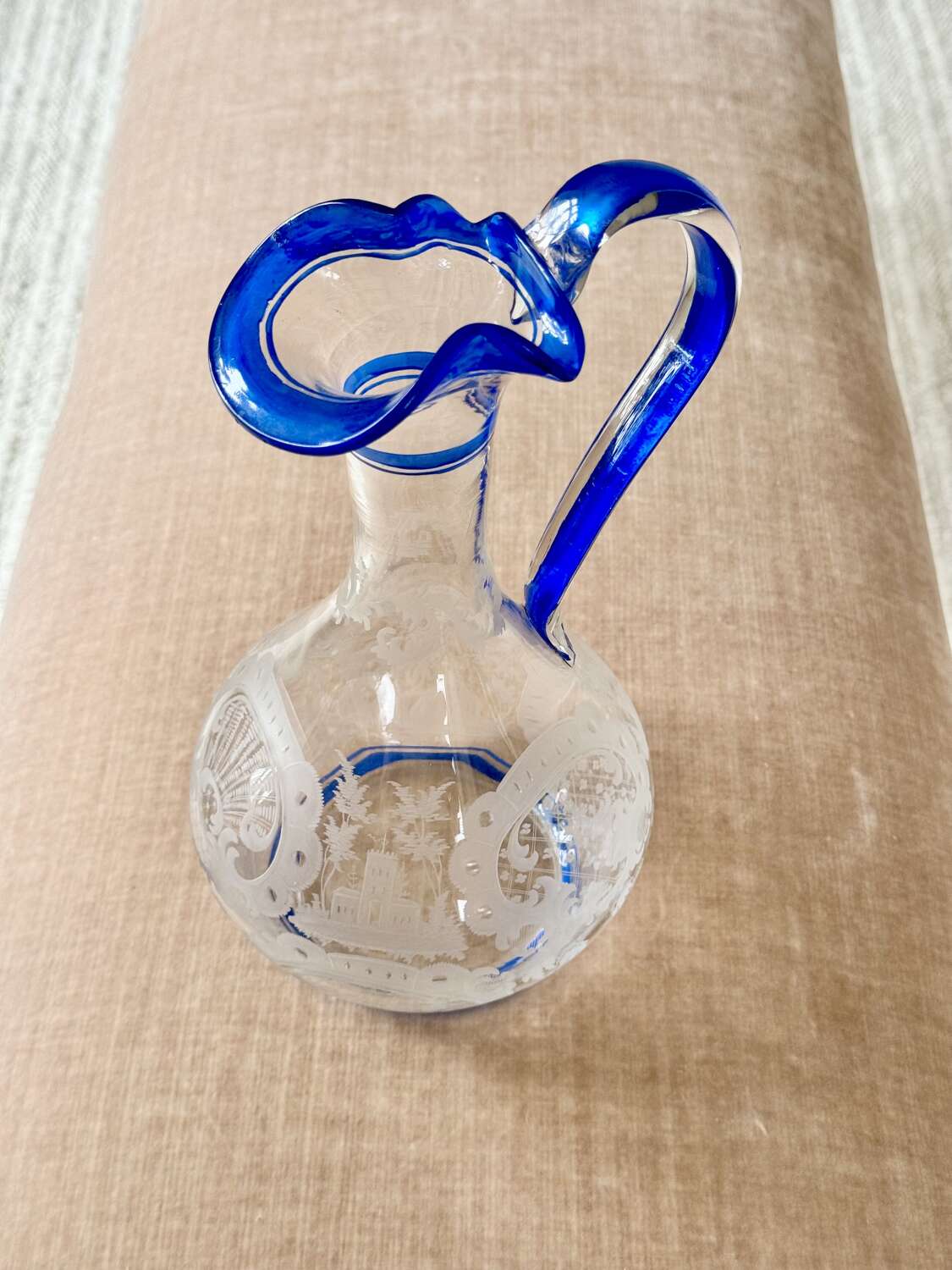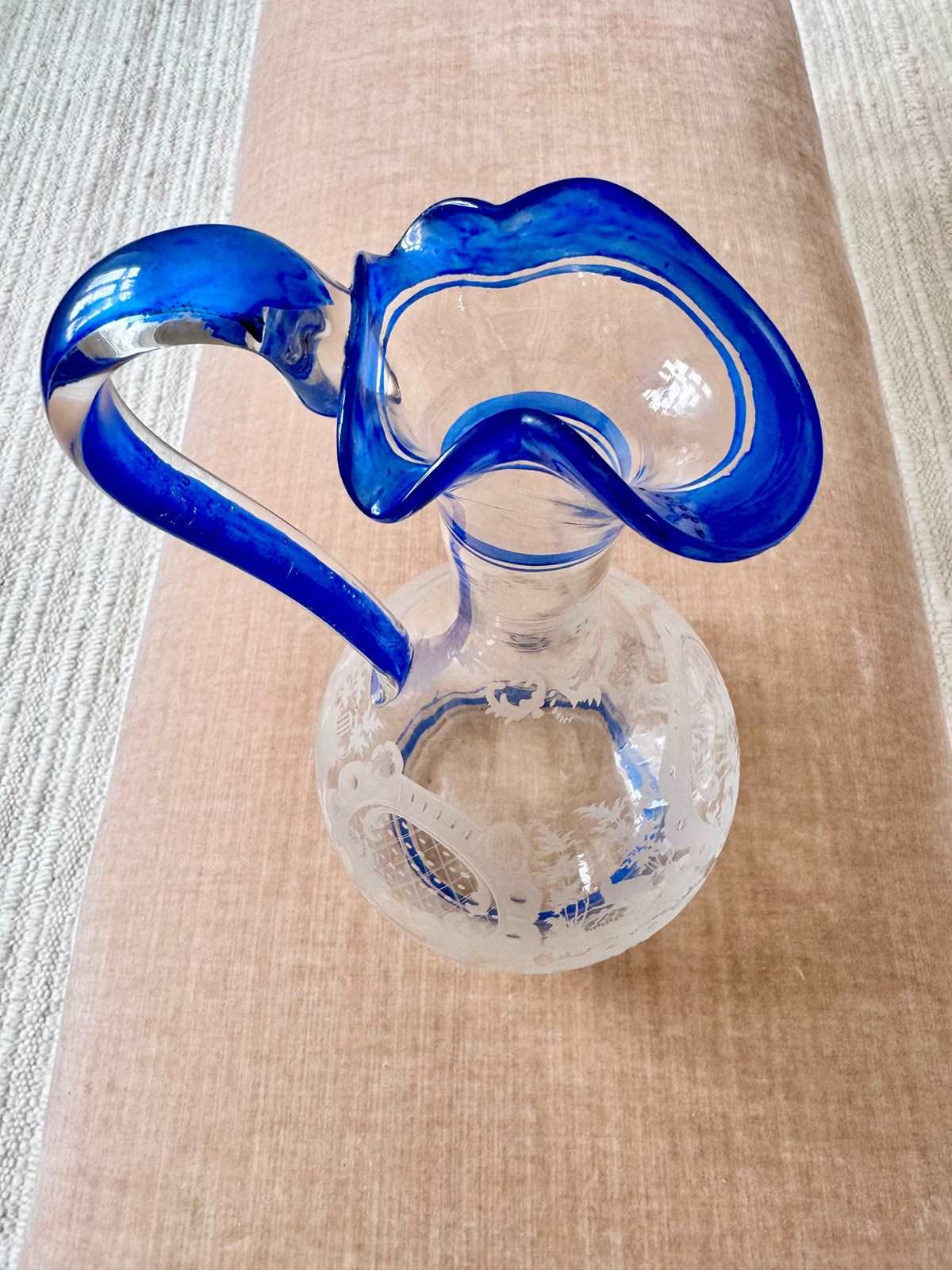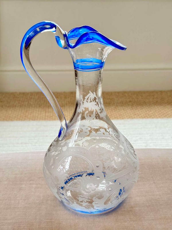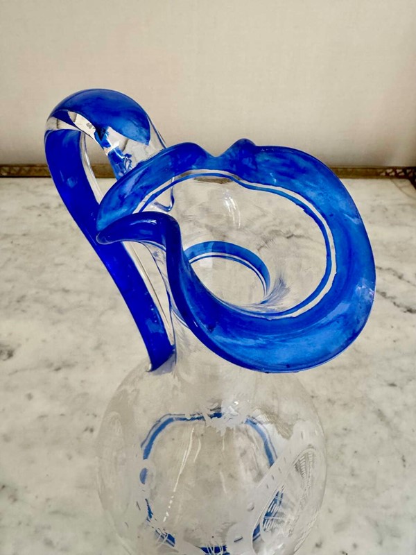 Art Deco Bohemian Etched Claret Jug With Blue Enamel Rims
