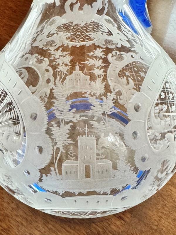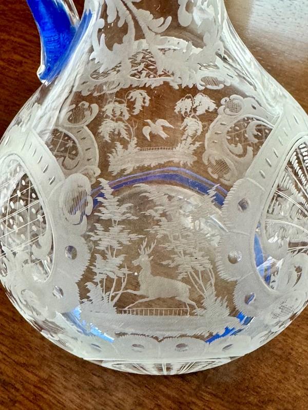 An outstanding and unusualArt Deco Bohemian wheel etched claret winejug withhand applied blue enamel rim, Circa 1920s. Hqnd crafted, with individually engraved scrolled pattern and charming forest scenes including Stags, Pagodas and birds. Generous in size, this ewer is perfect for wine or water.