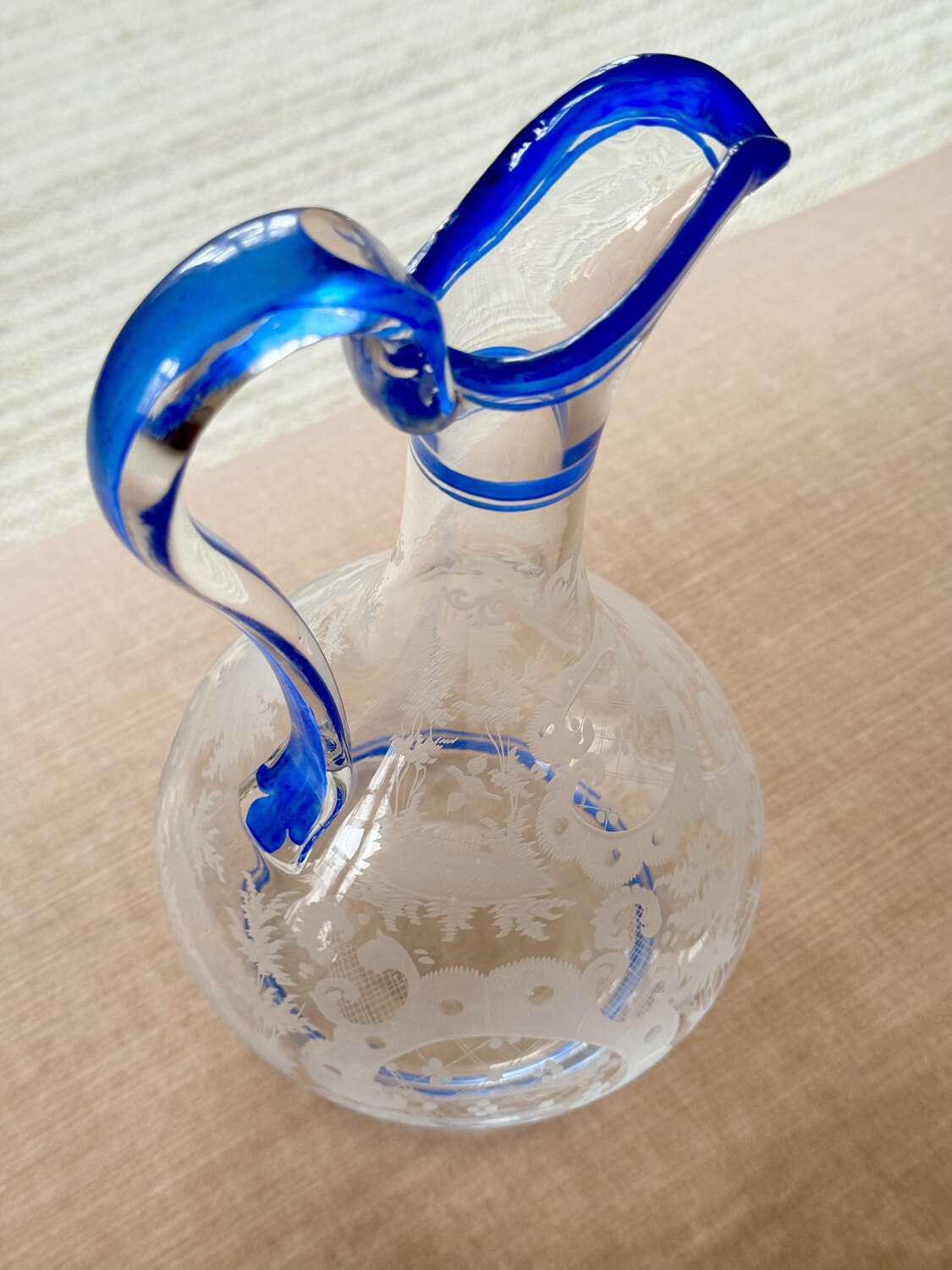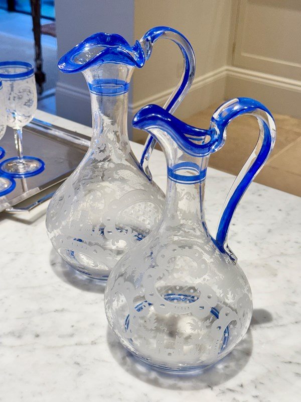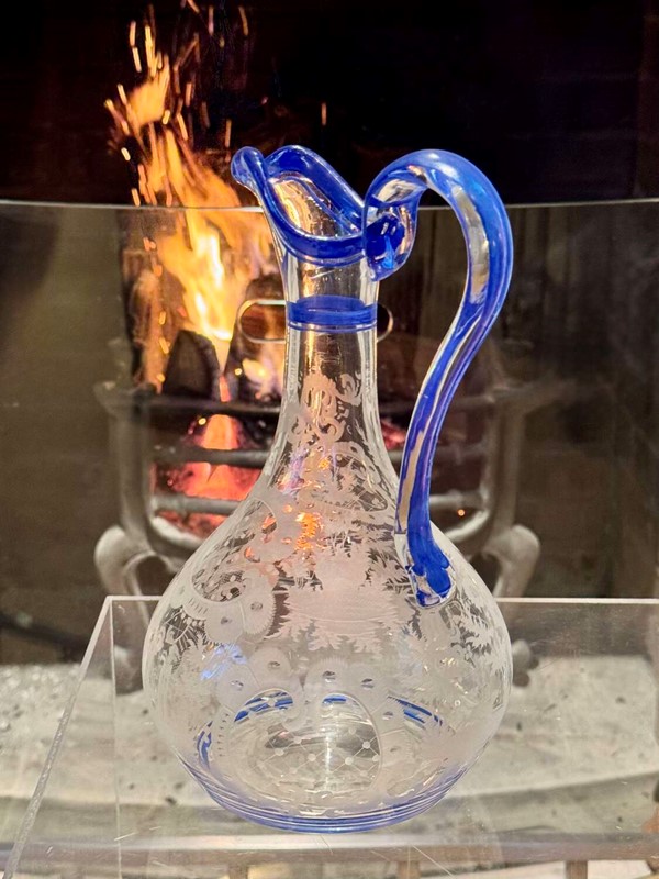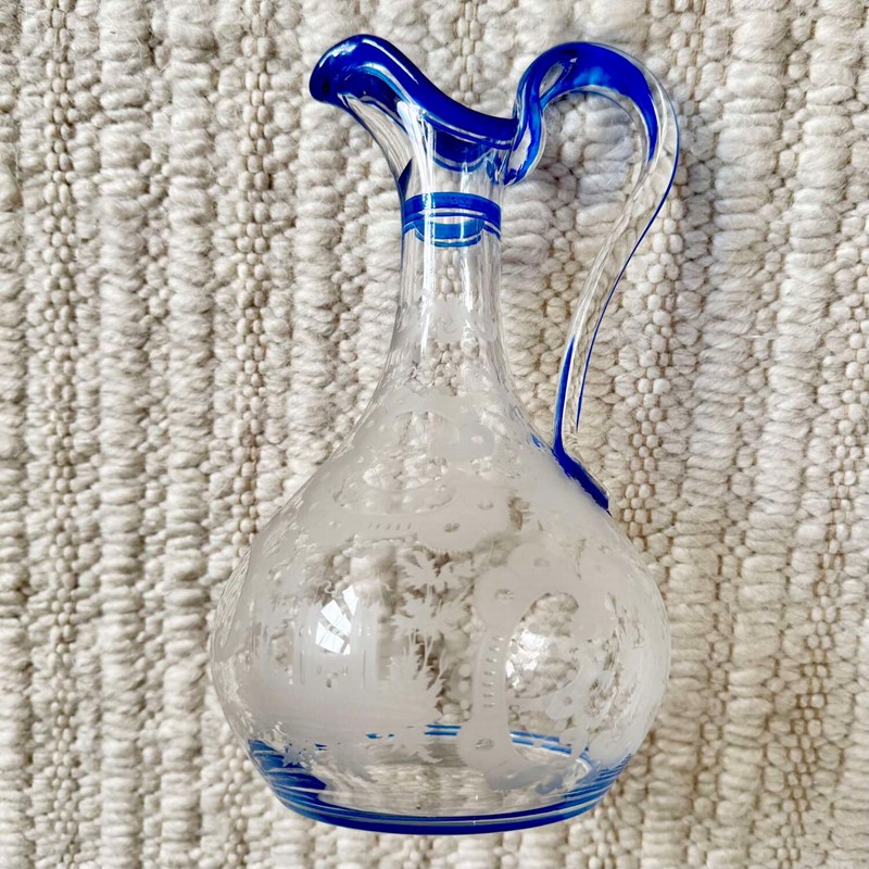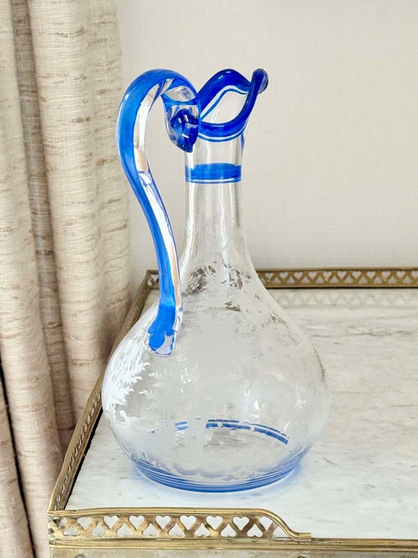 Art Deco Bohemian Etched Claret Jug With Blue Enamel Rims