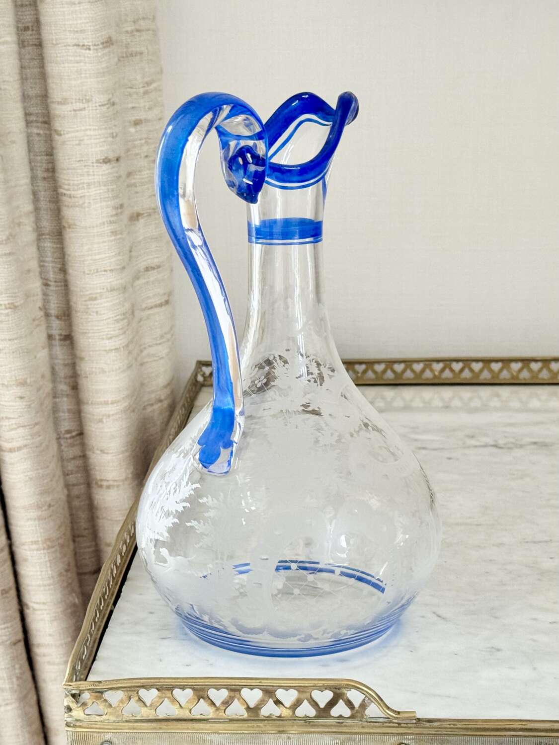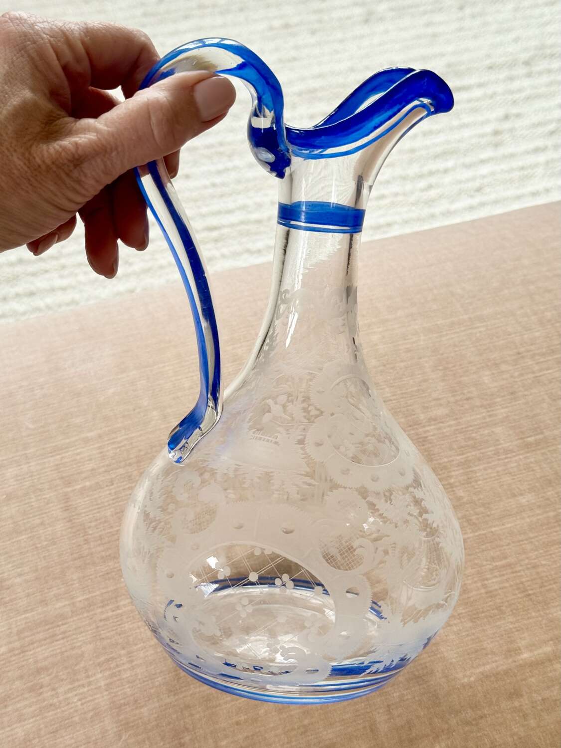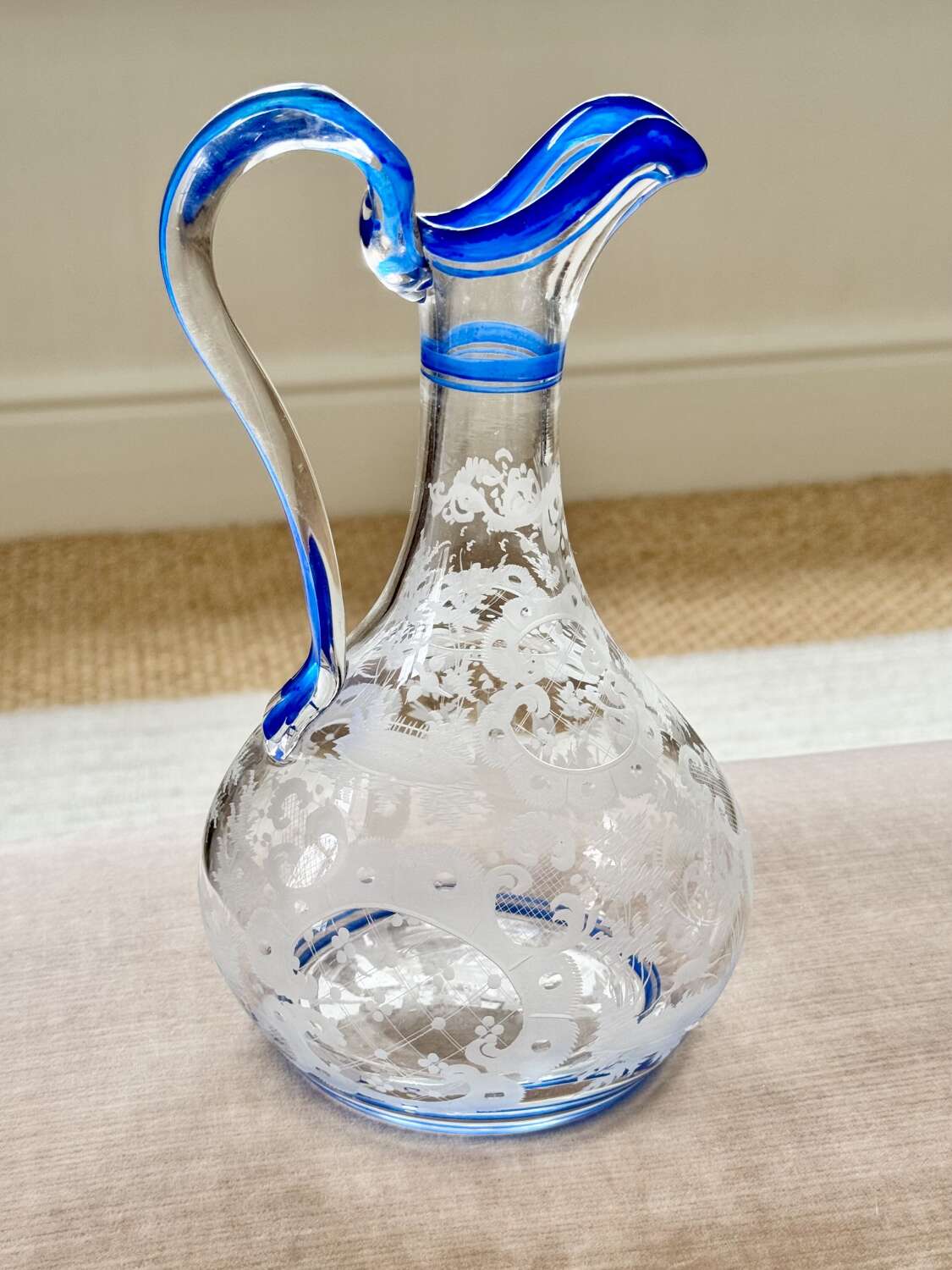 Art Deco Bohemian Etched Claret Jug With Blue Enamel Rims