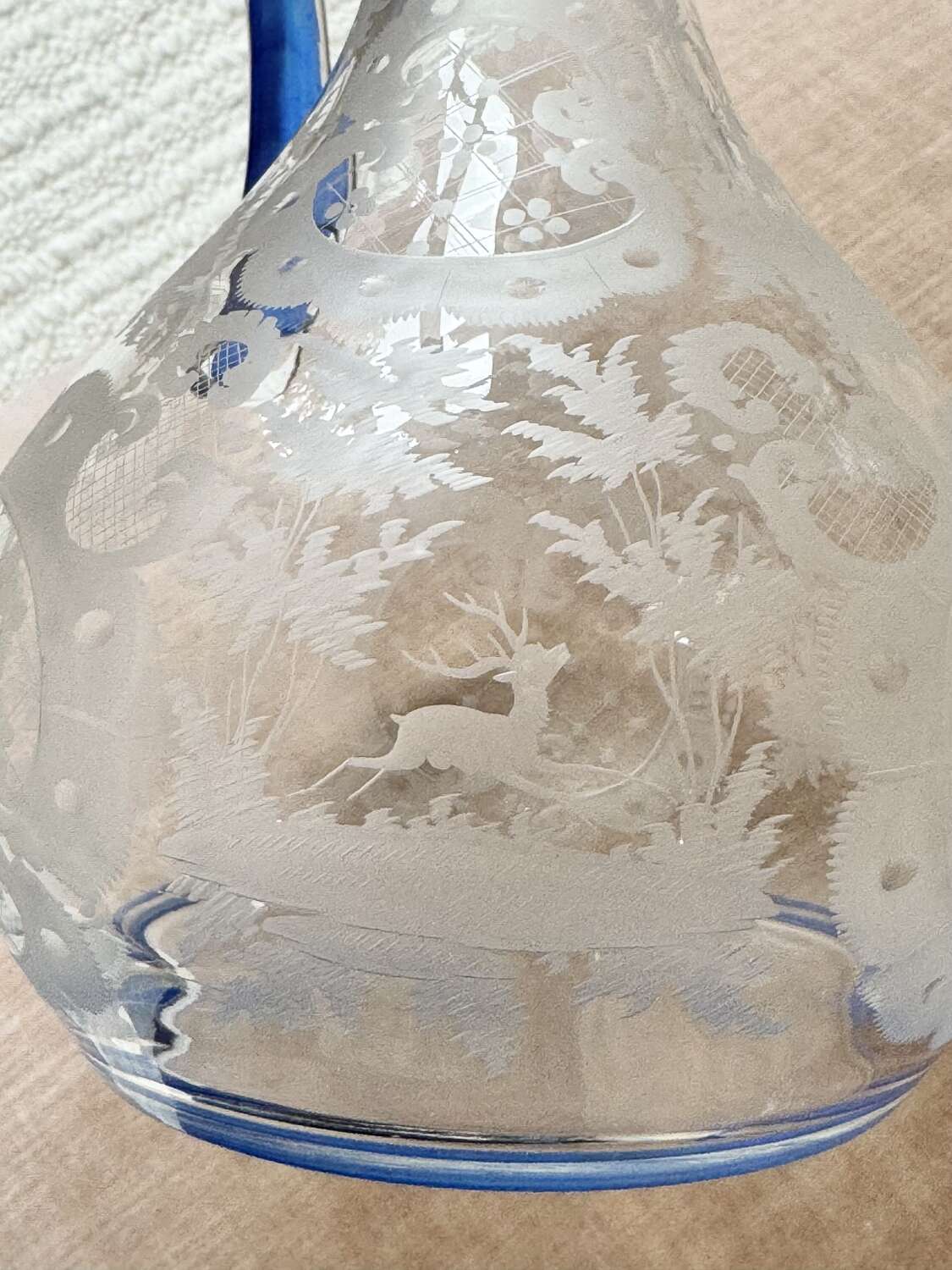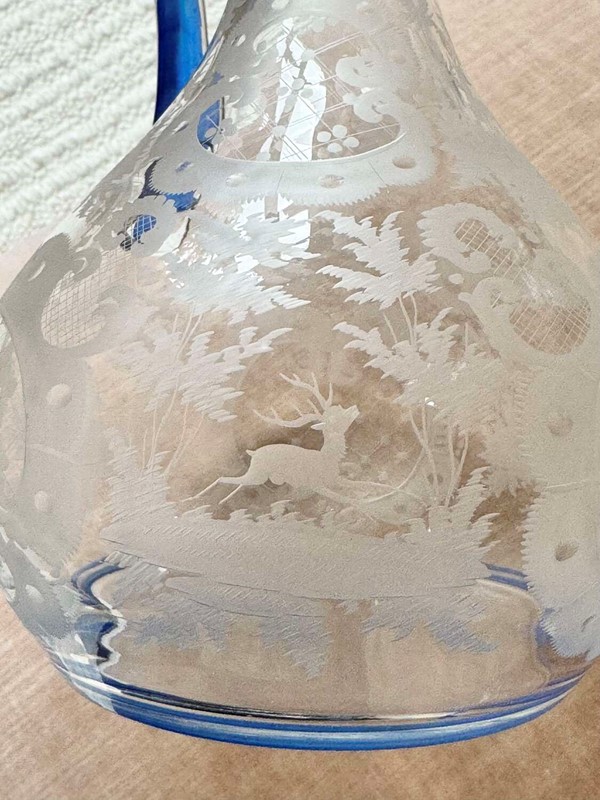 An outstanding and Art Deco Bohemian wheel etched claret wine jugwith handapplied blue enamel rim, Circa 1920s. Hqnd crafted, with individually engraved scrolled pattern and charming forest scenes including Stags, Pagodas and birds. This eweris perfect for wine or water.