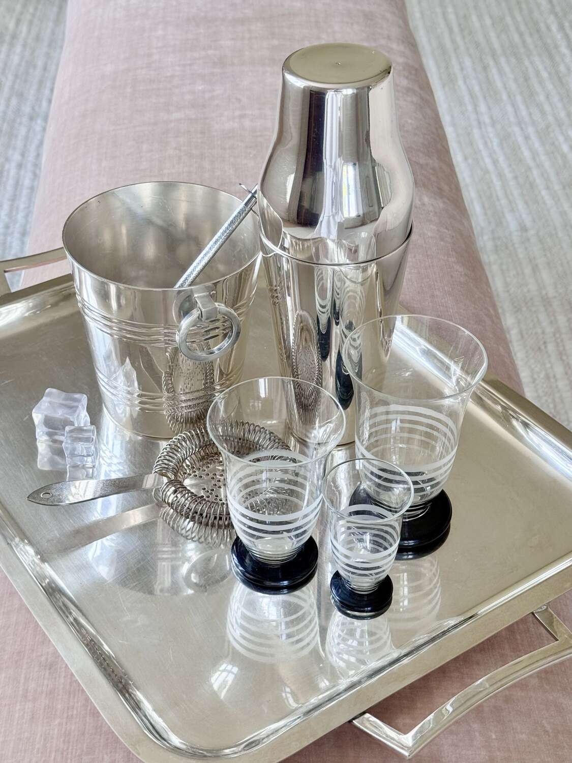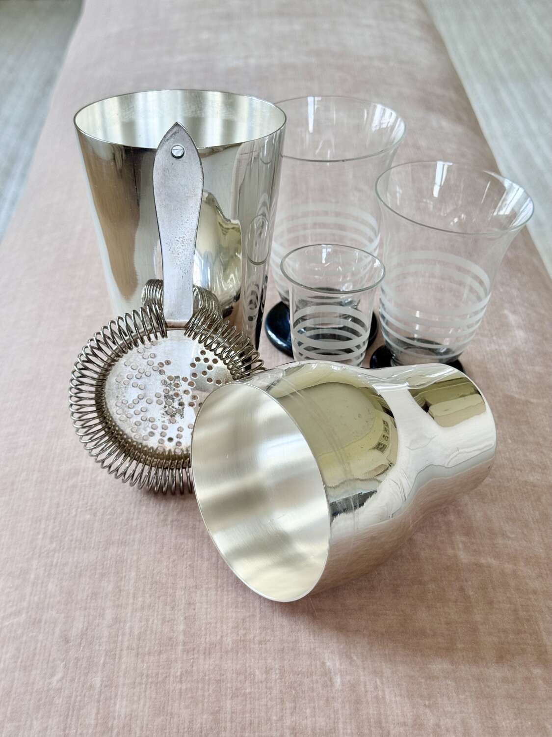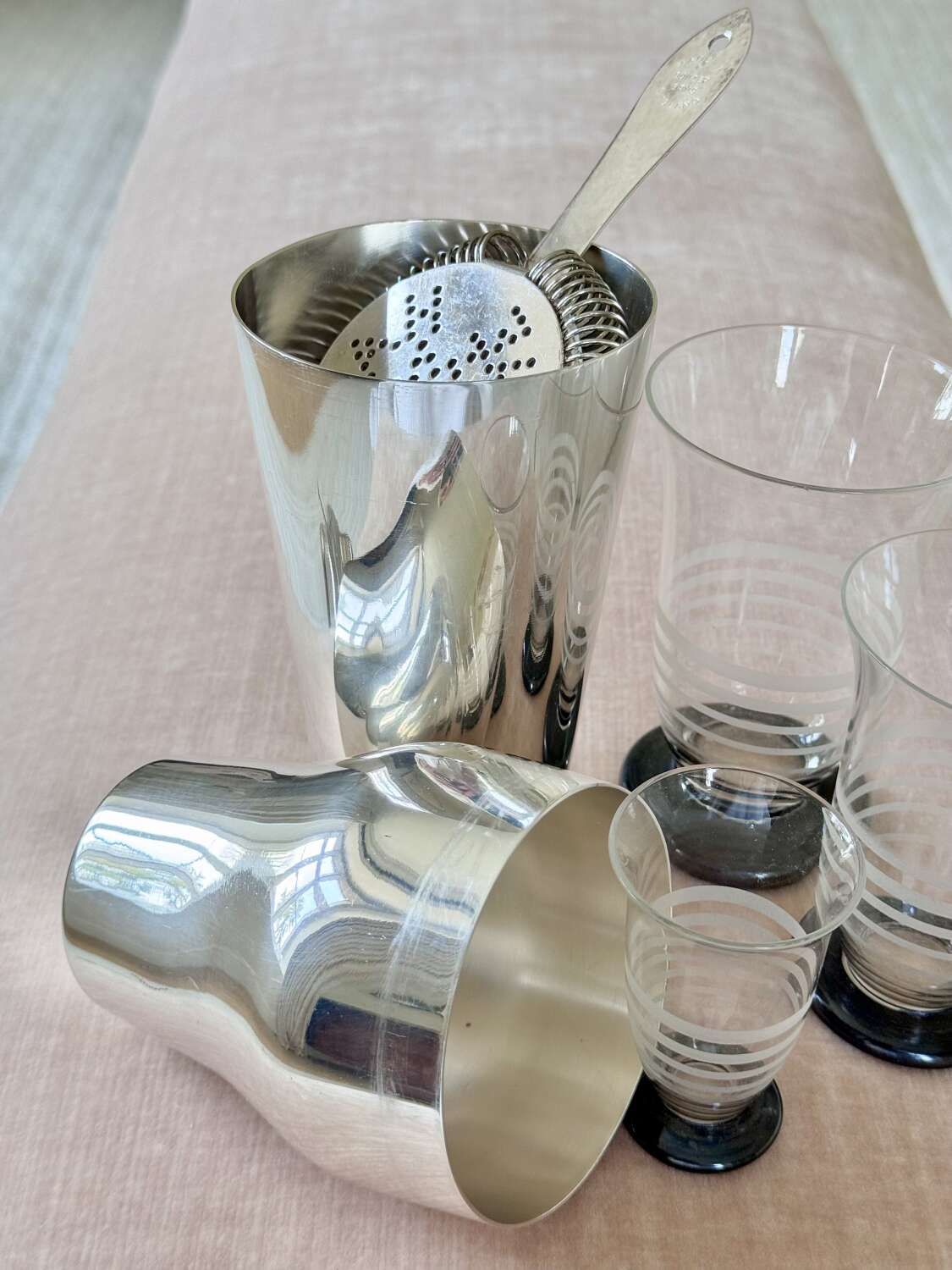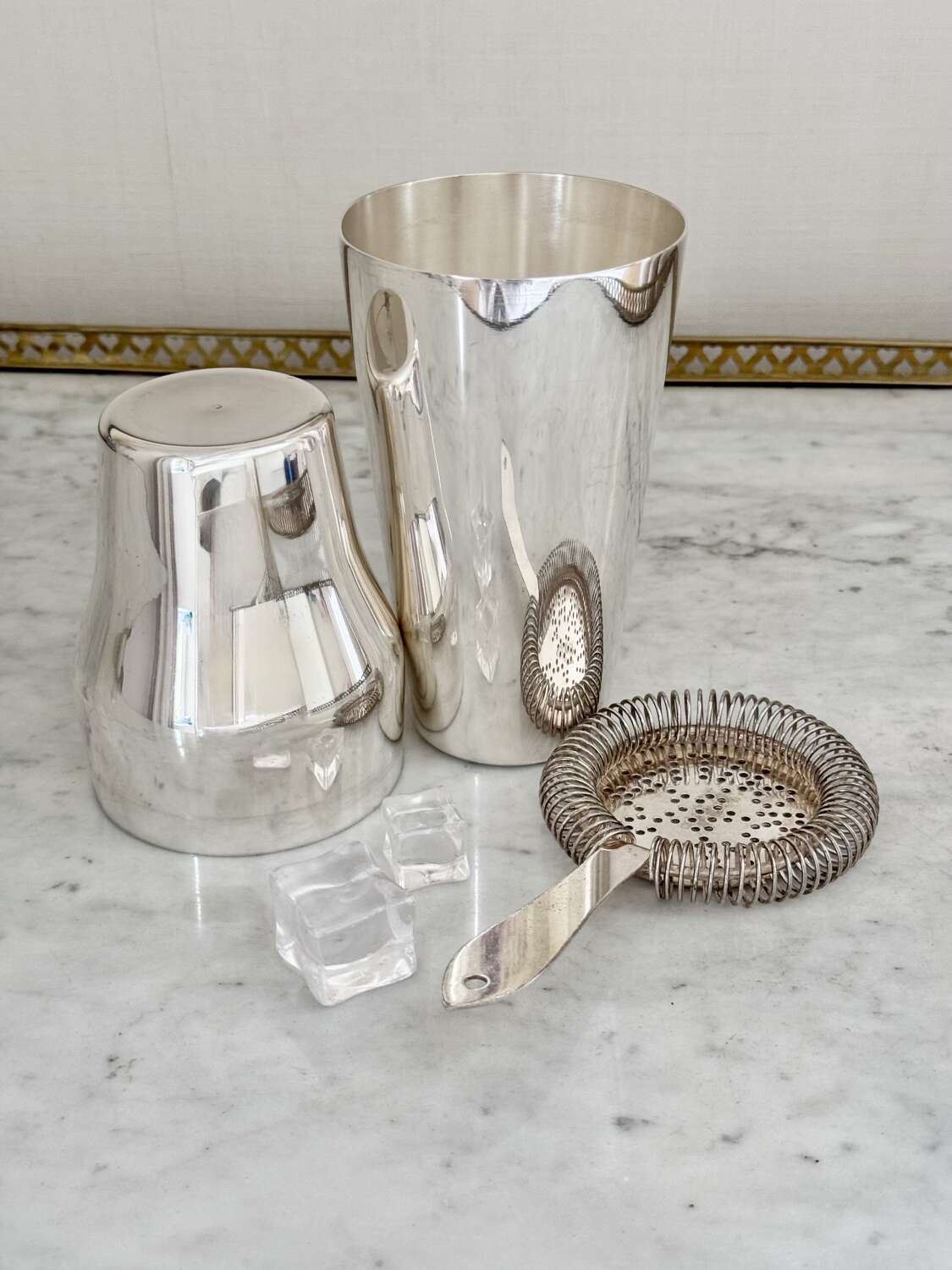 An excellent Art Deco era French silver plated 'Parisienne' shaped two-piece cocktail shaker, Circa 1920, with makers mark for Mailhan & Mailhan, Paris. This shape is sometimes called The Barman's cocktail shaker because top hotel barman preferred the easy two-piece and break apart method of cocktail making.Mailhan & Mailhan was a French silversmith and manufacturer based in Paris, active from 1883, known for producing high-quality silver-plated items in competition with Christofle. They are particularly noted for producing silver-plated barware and tableware, including cocktail shakers, but ceased trading in the early 20th Century.