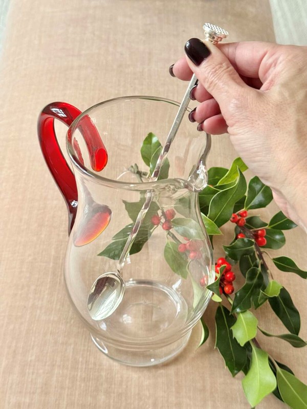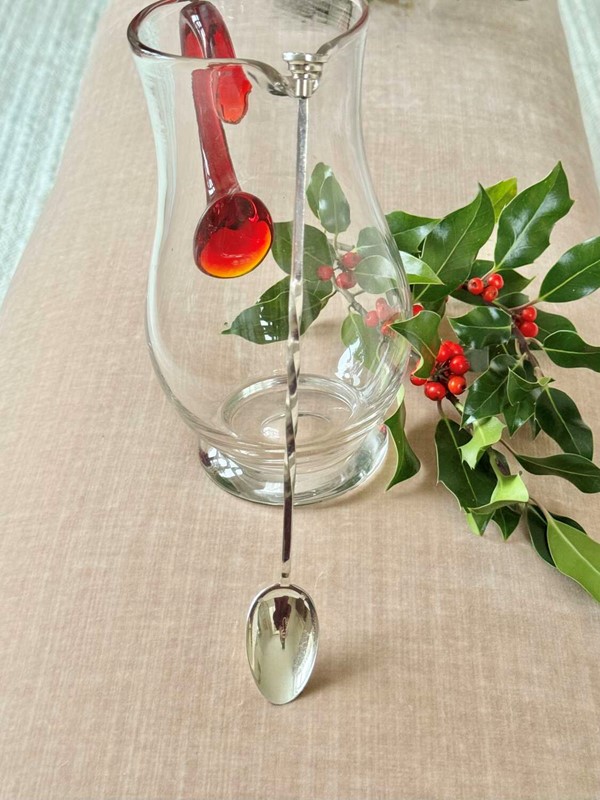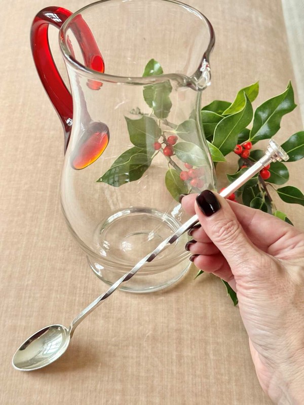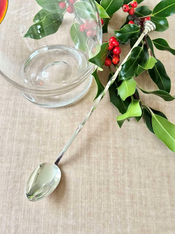 A good quality vintage silver plated, extra long, double-ended cocktail stirrer and muddling spoon, Mid 20th Century,is by Bognon Pierre of Paris, France and is stamped with their maker's mark.This useful cocktail spoon has a barley twist design with a large spoon to one end and a round muddler which has a criss-cross pattern at the other end for crushing cocktail ingredients.