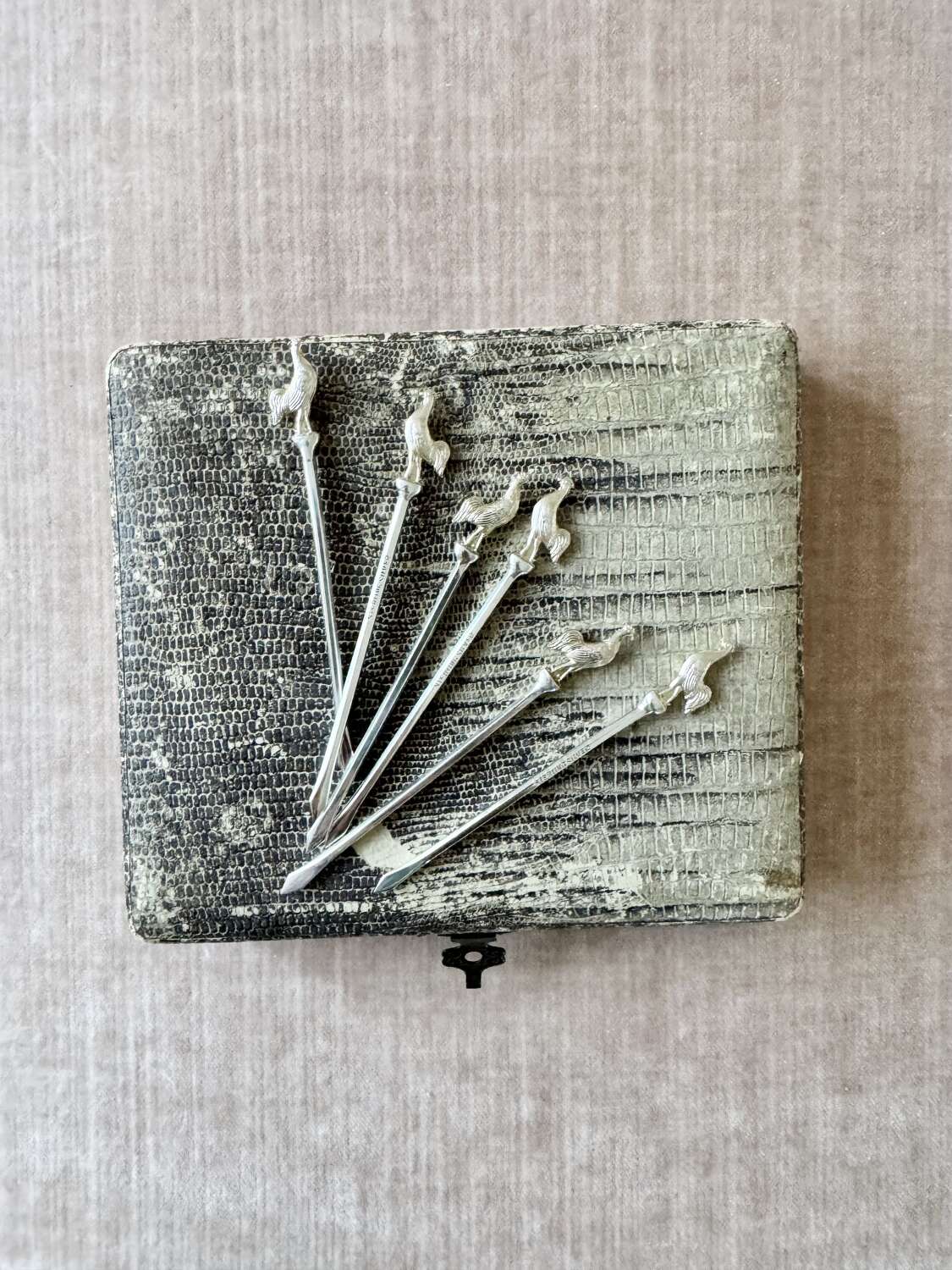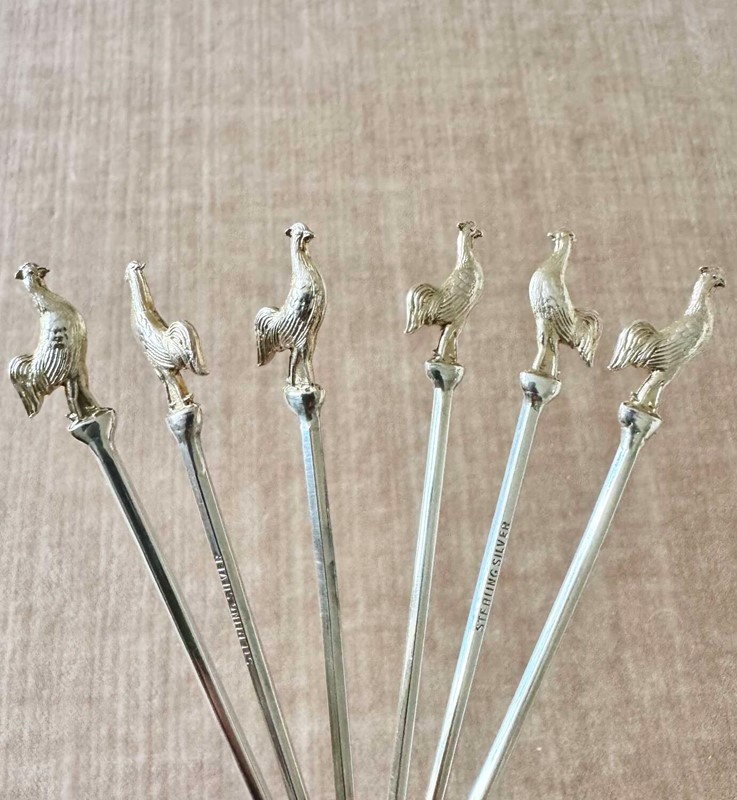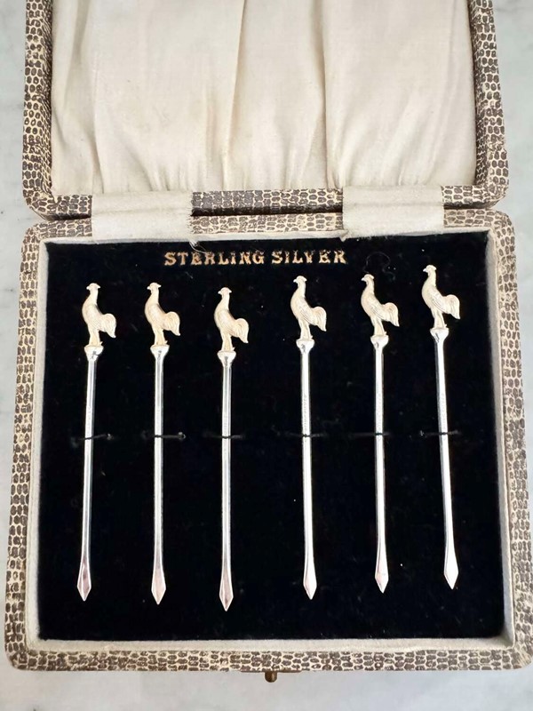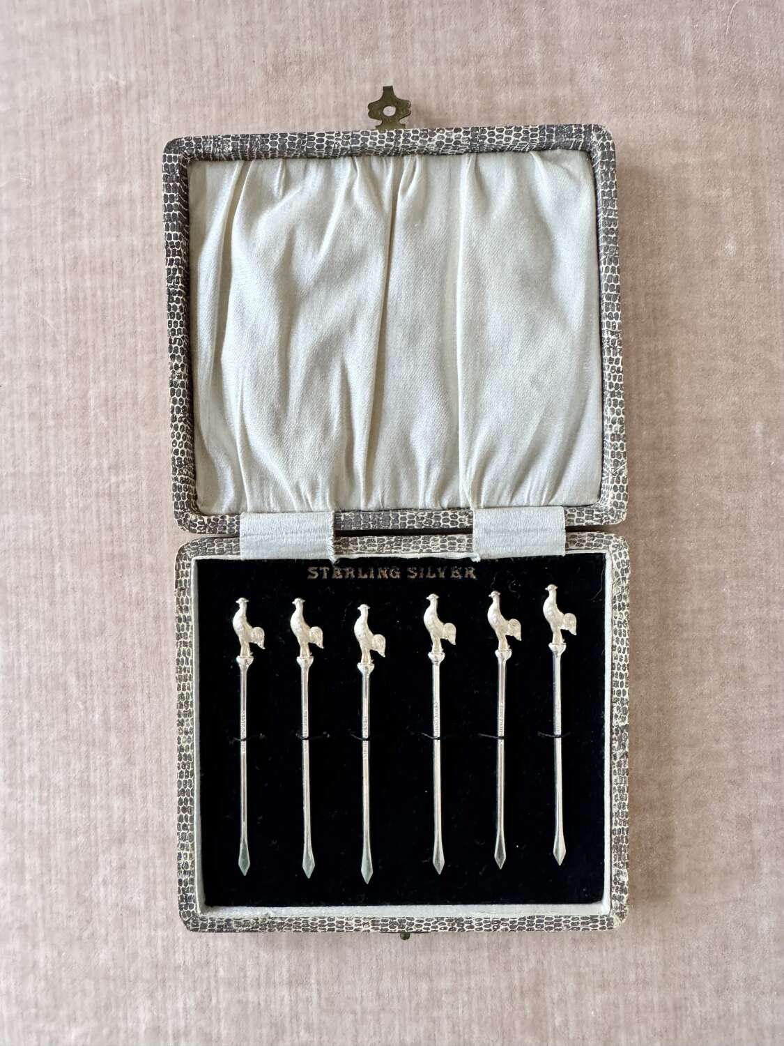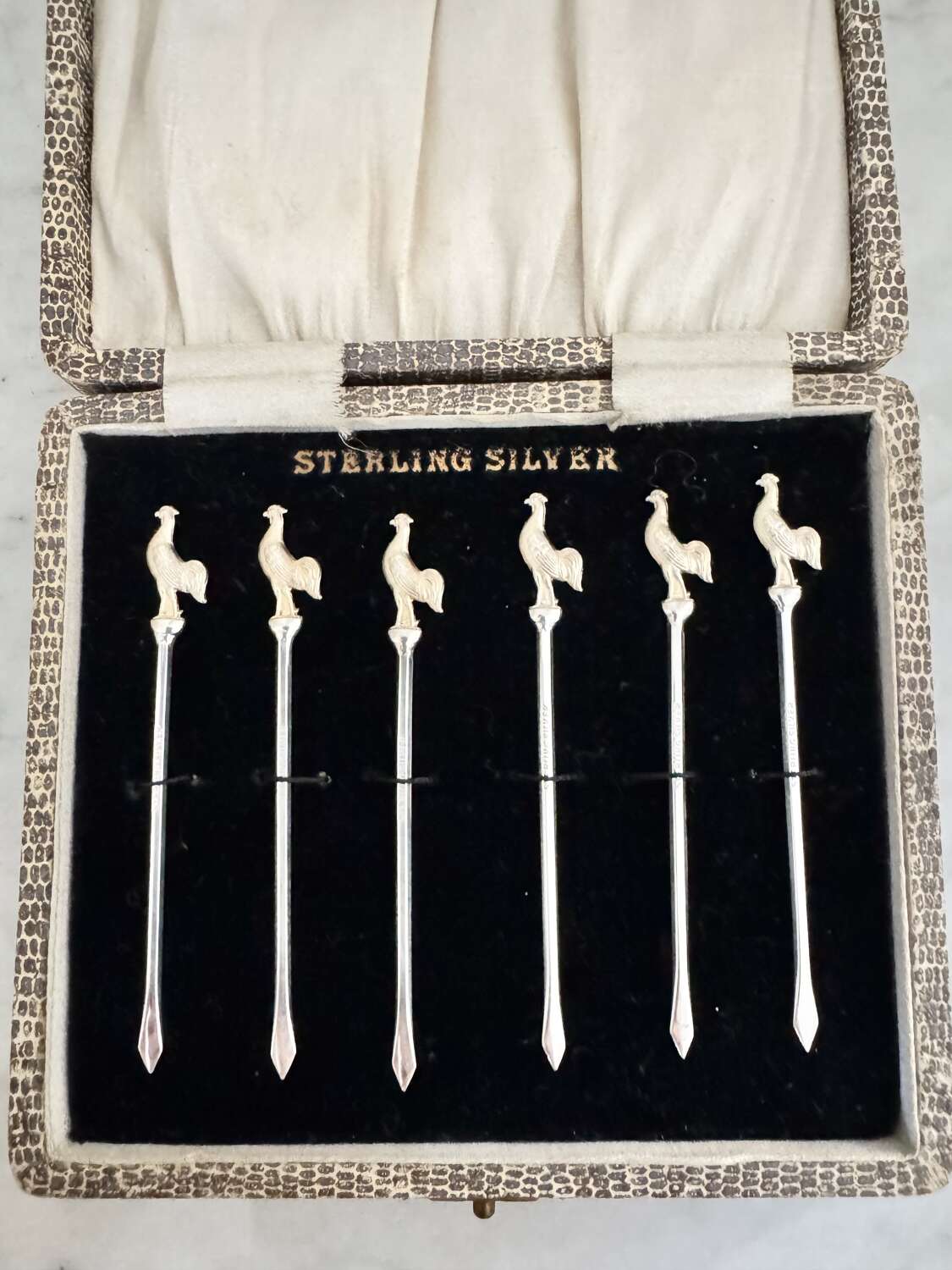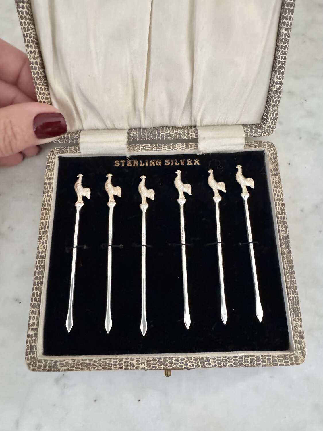 Boxed Art Deco sterling silver cockerel bird cocktail sticks