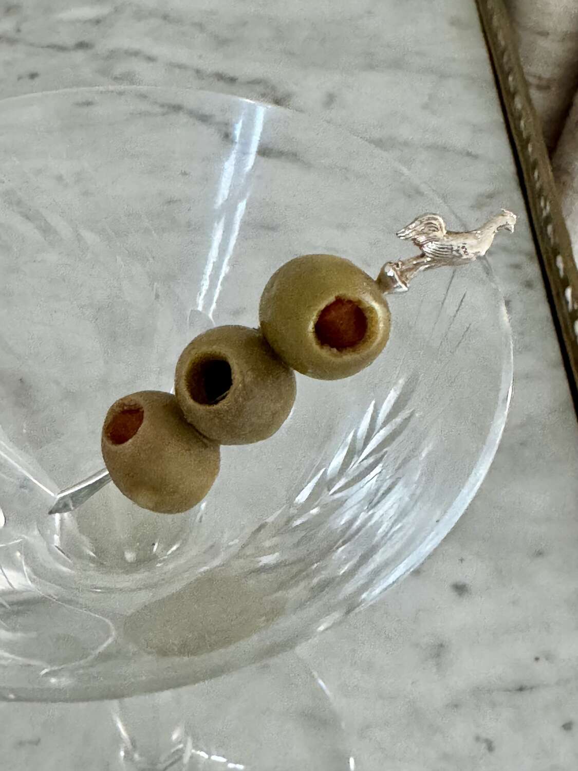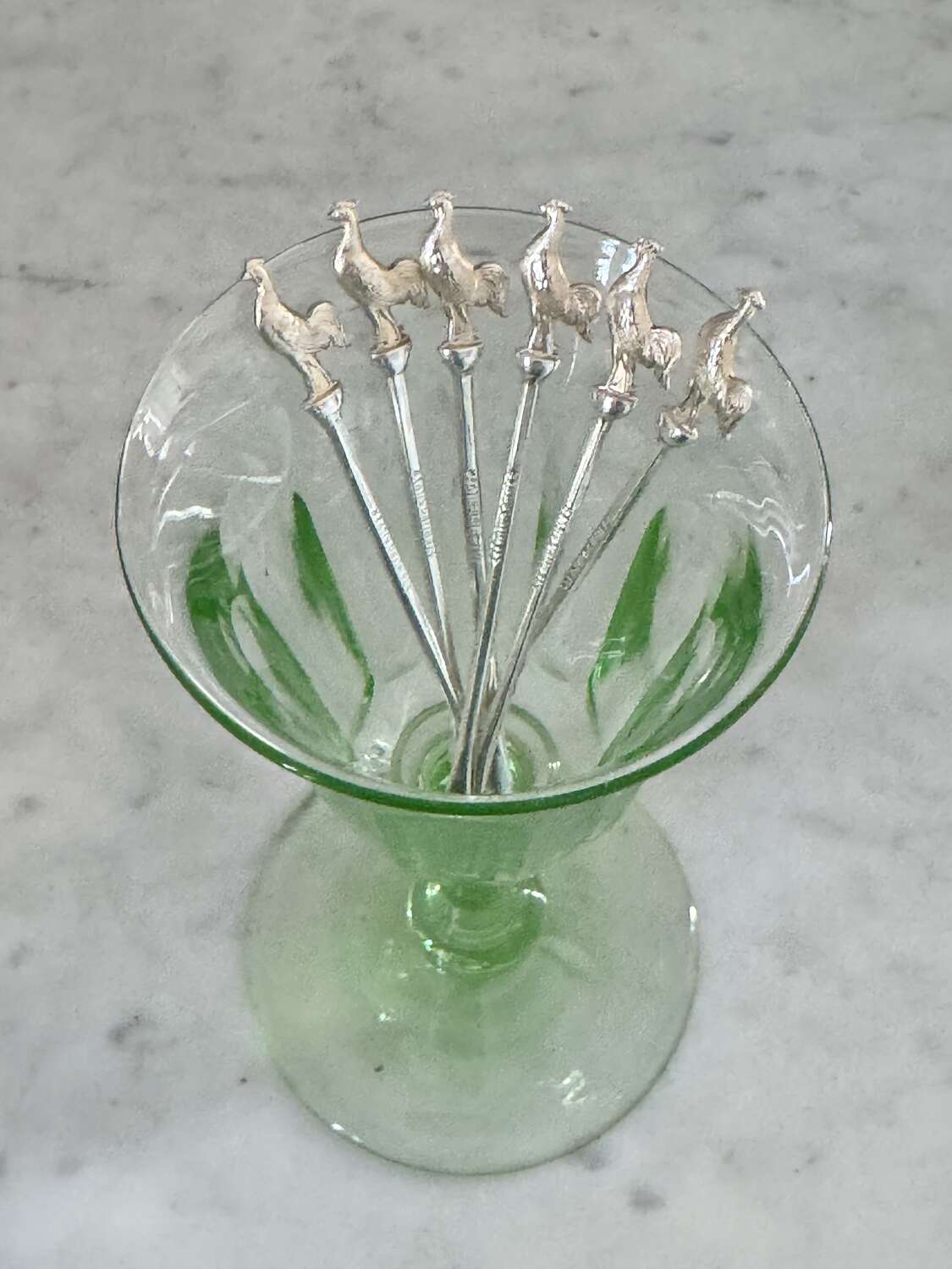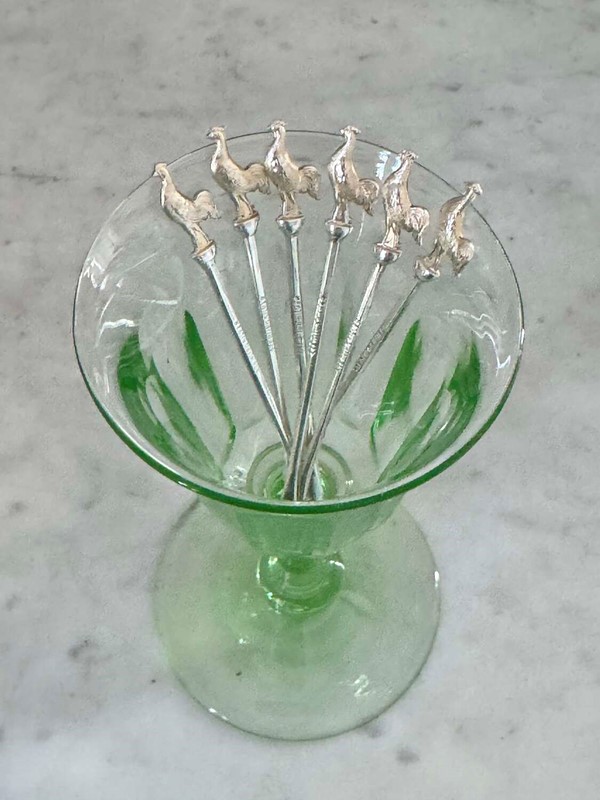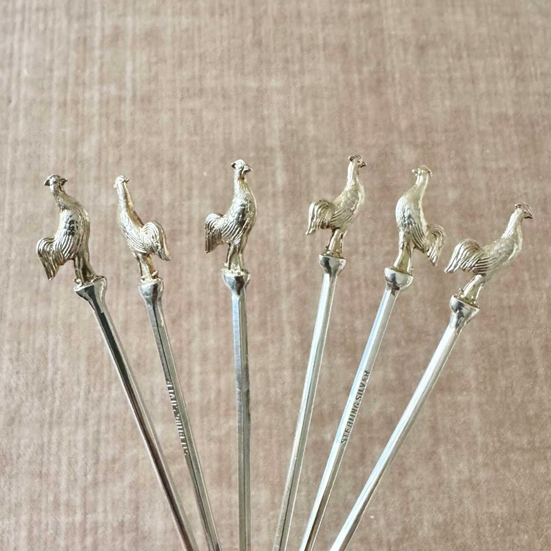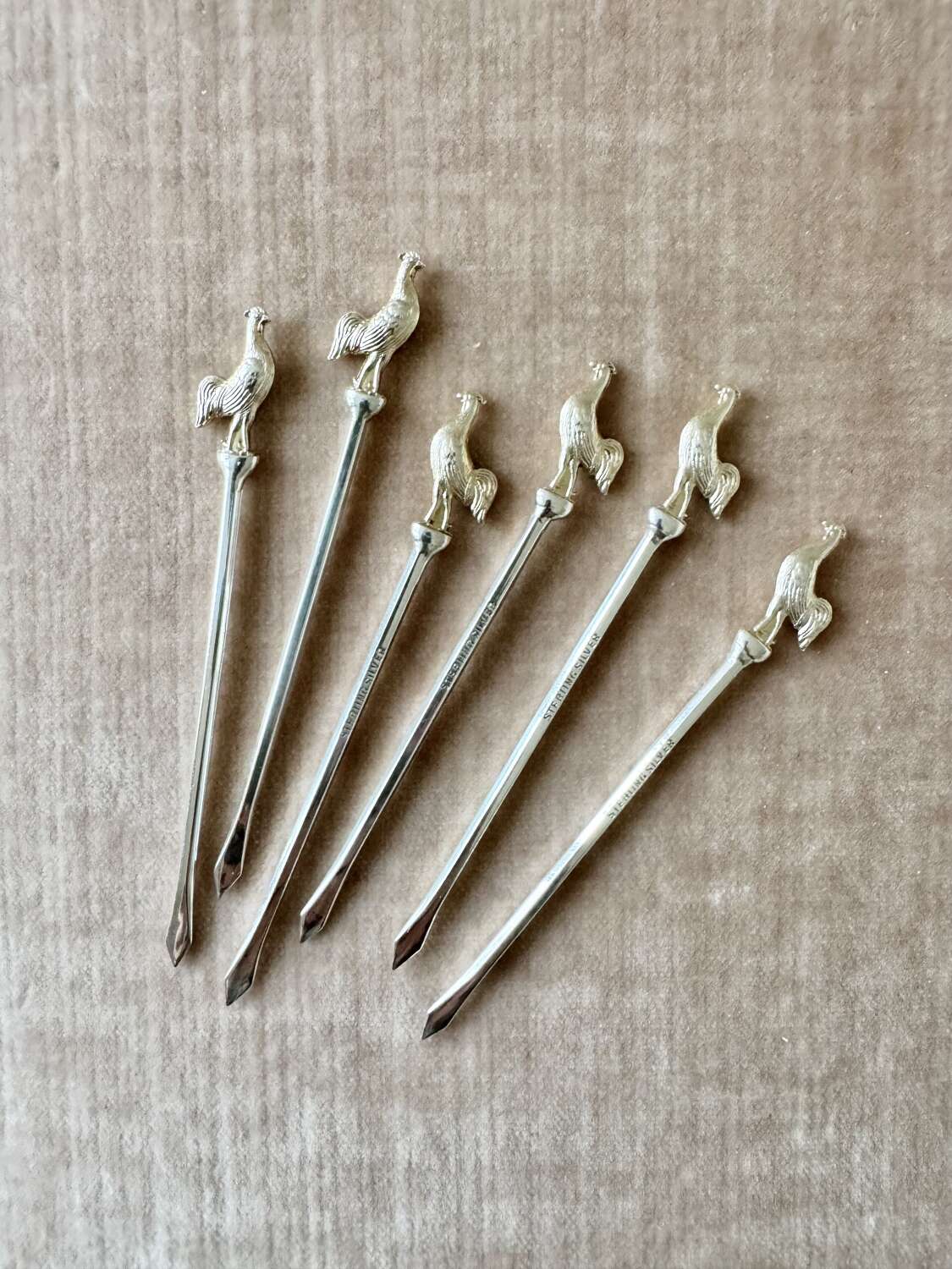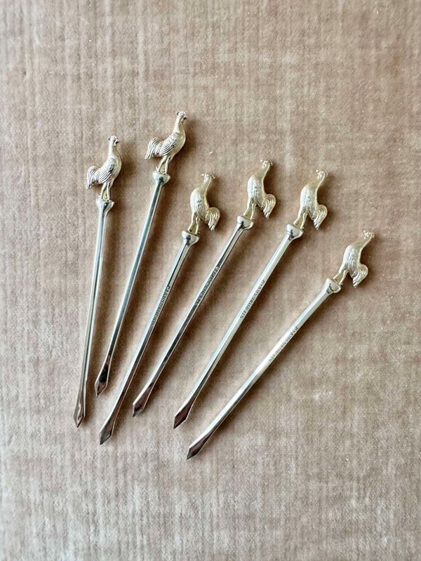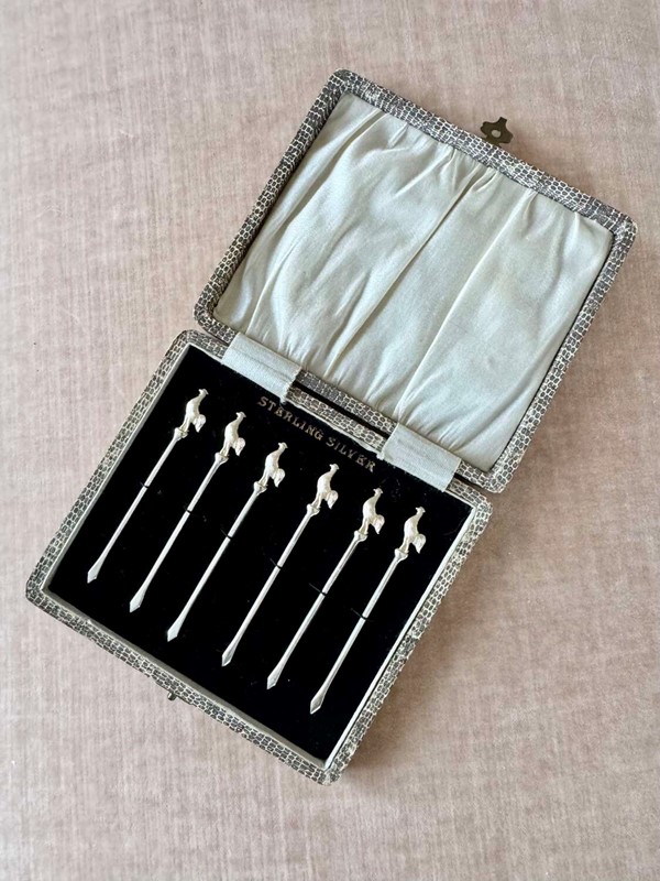 Boxed Art Deco sterling silver cockerel bird cocktail sticks