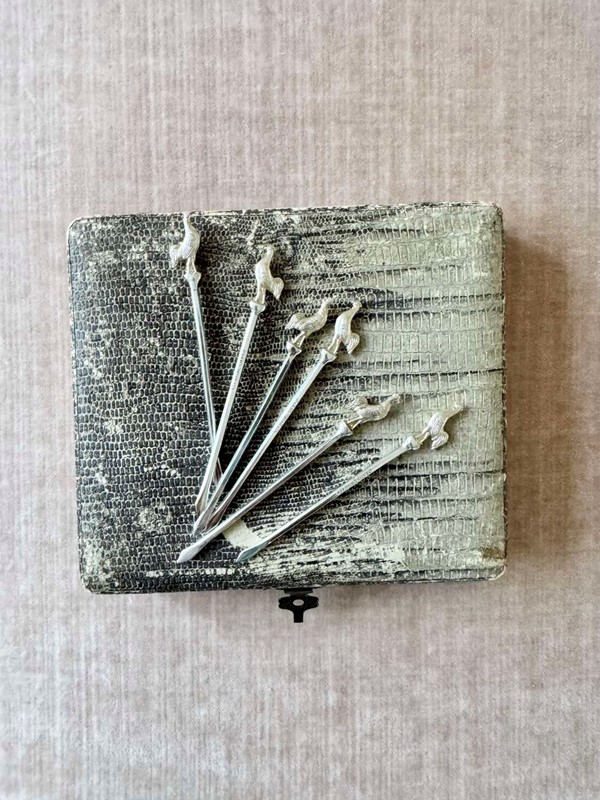 An usualset of English Art Deco sterling silver Cockerel cocktail sticks, in their original snakeskinleather box lined with cream satin and black velvet. These gorgeous picks add the final classic flourish to the Home Mixologist’s creations.Each cocktail stick is 8cm longBox 13cm x 11cm x 2cm