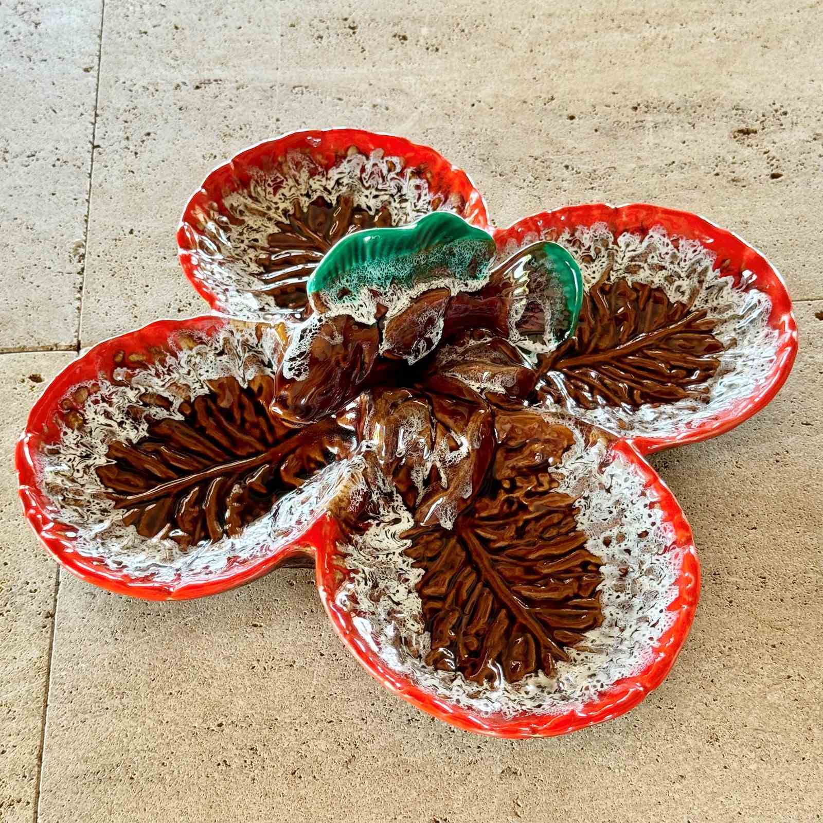 A chic Mid 20th Century French handpainted ceramic hors d'oevre serving dish from Vallauris, France Circa 1950s. This excellent large pottery four section serving dish is perfect to use with drinks before dinner.Vallauris is a small town near Cannes on the Côte d’Azur renowned for its pottery in the Mid 20th Century. The artist Picasso lived and worked in the town from 1948-1955 in order to facilitate his early artistic experimentation with pottery. Seduced by the "town with a hundred potters" it was in his villa nestled on the hills of Vallauris that his creativity was set free.