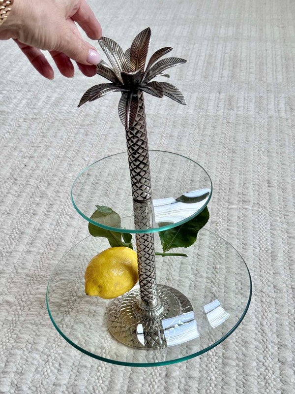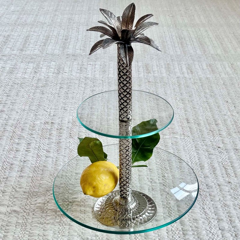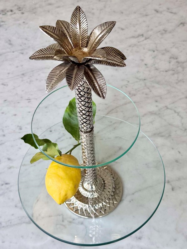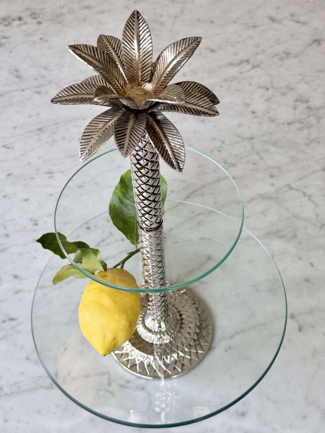 A dramatic tall vintage Italian glass and silver plated palm street cake or fruit centrepiece stand, circa 1970/80. This versatile centrepiece comprises two glass plates balancing on a palm tree stem, with flaring palm leaves finial top, which can also be used as a candlestick. Pure Hollywood Regency glamour and fun.